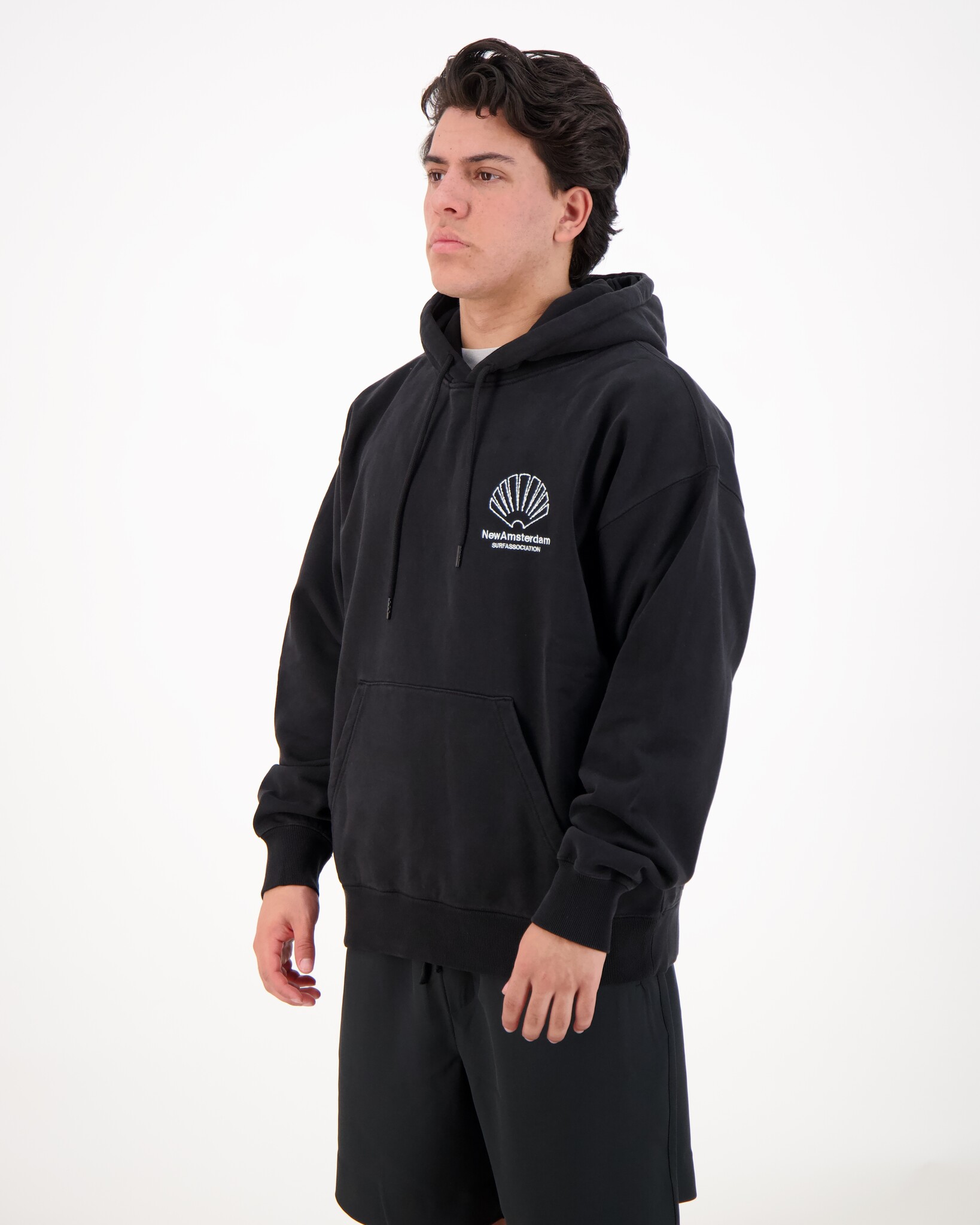 Zwarte 'Logo Hoodie' van het merk New Amsterdam Surf Association. Met een iets oversized uniseks-fit. Hij heeft een capuchon voorzien van rubber-dipped trekkoorden, ribgebreide boorden, en een comfortabele kangoeroezak. Op de borst én rug is de kenmerkende New Amsterdam-logo geborduurd – subtiel maar stijlvol aanwezig