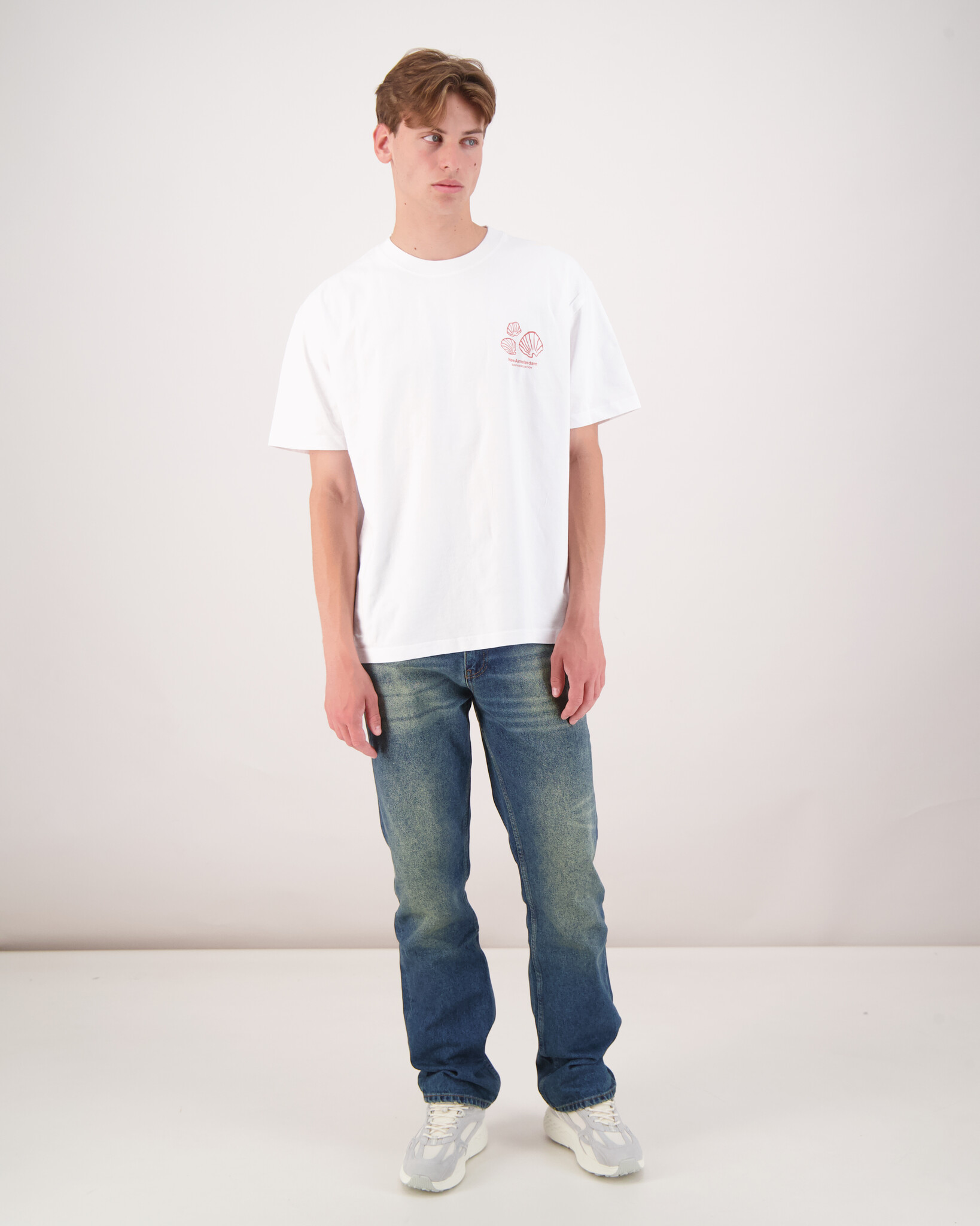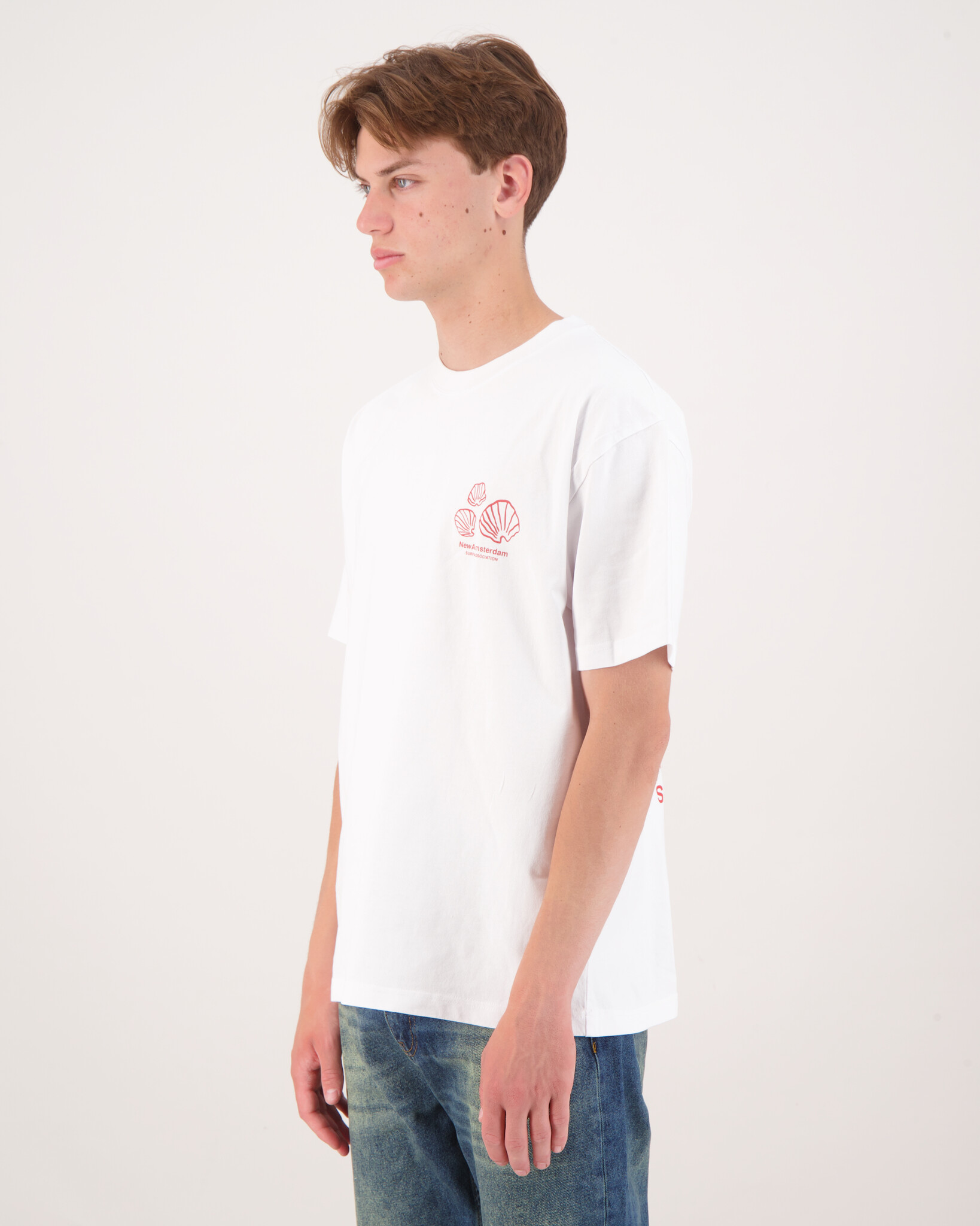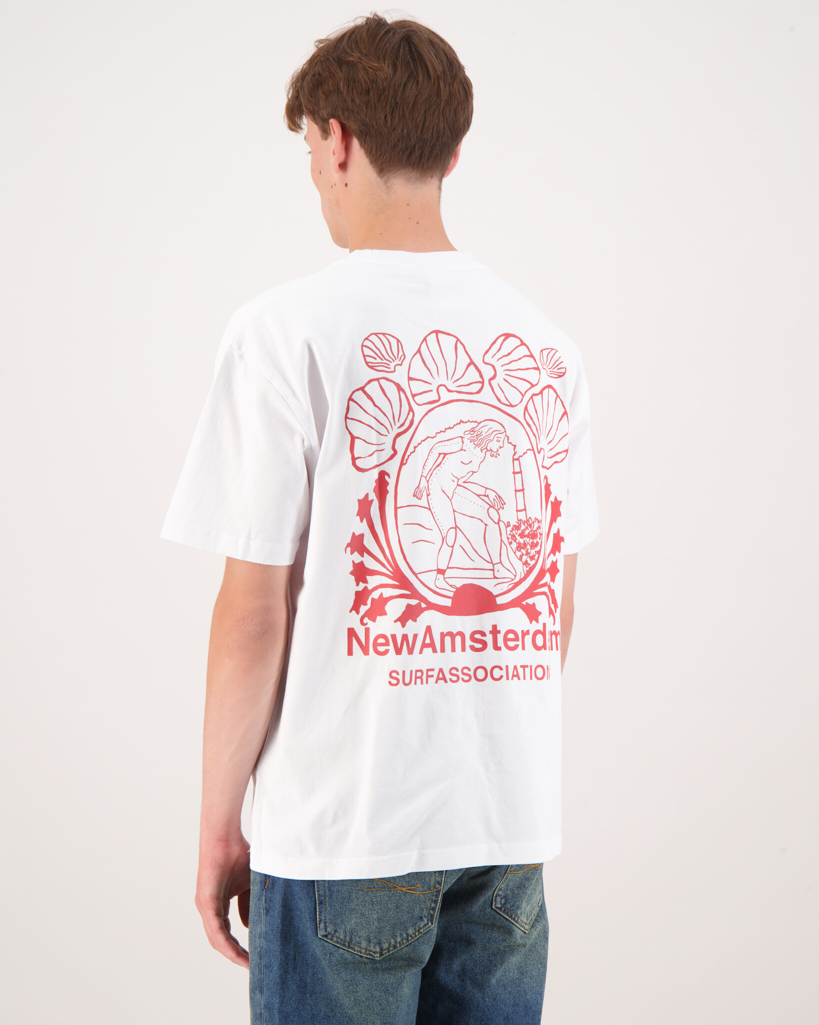 Witte Lost Surfer T-Shirt van het merk New Amsterdam Surf Association. T-shirt met ronde hals en een normale unisex pasvorm. Gedetailleerd met een zeefdruk met het seizoensmerk ‘lost surfer’ op de voor- en achterkant.