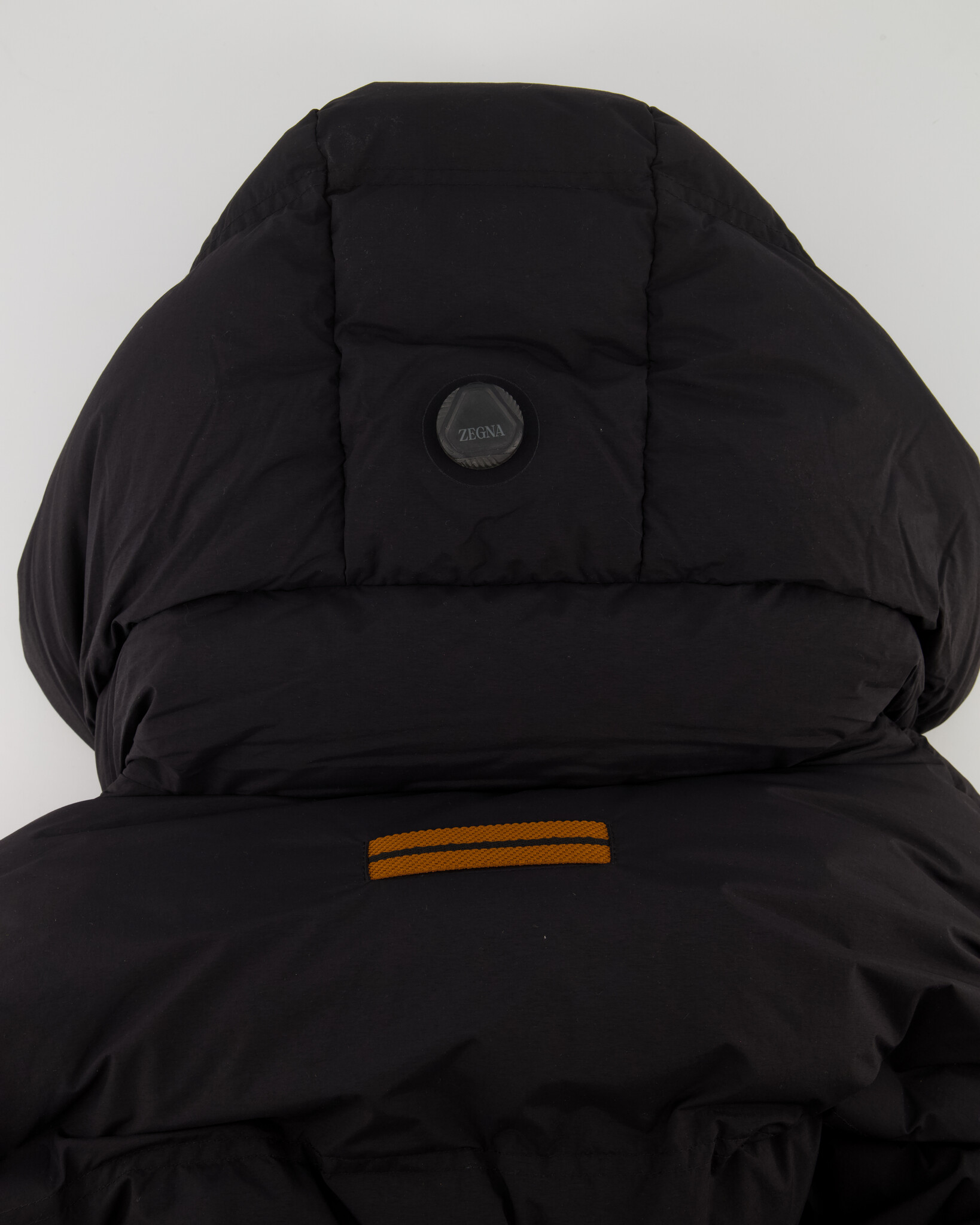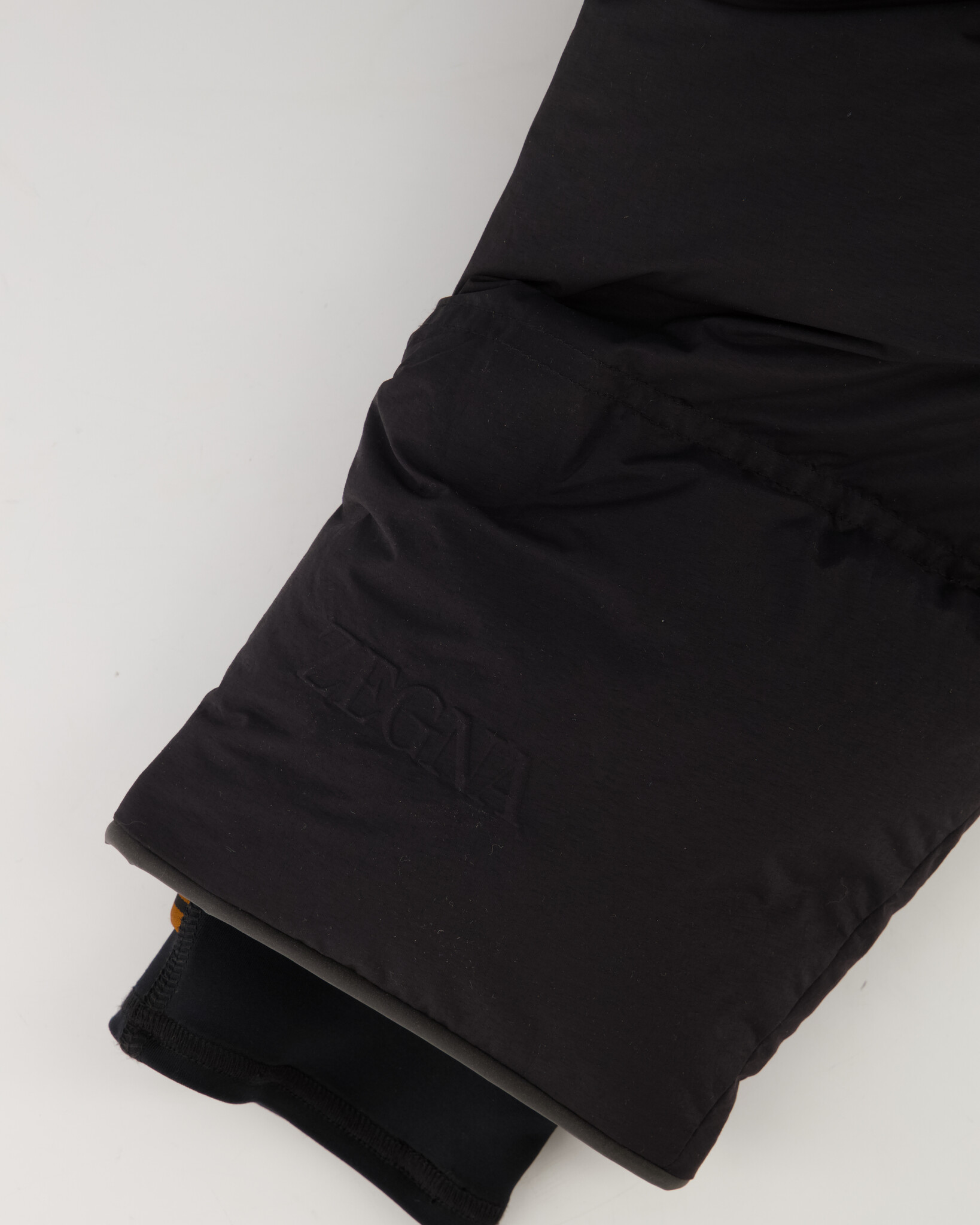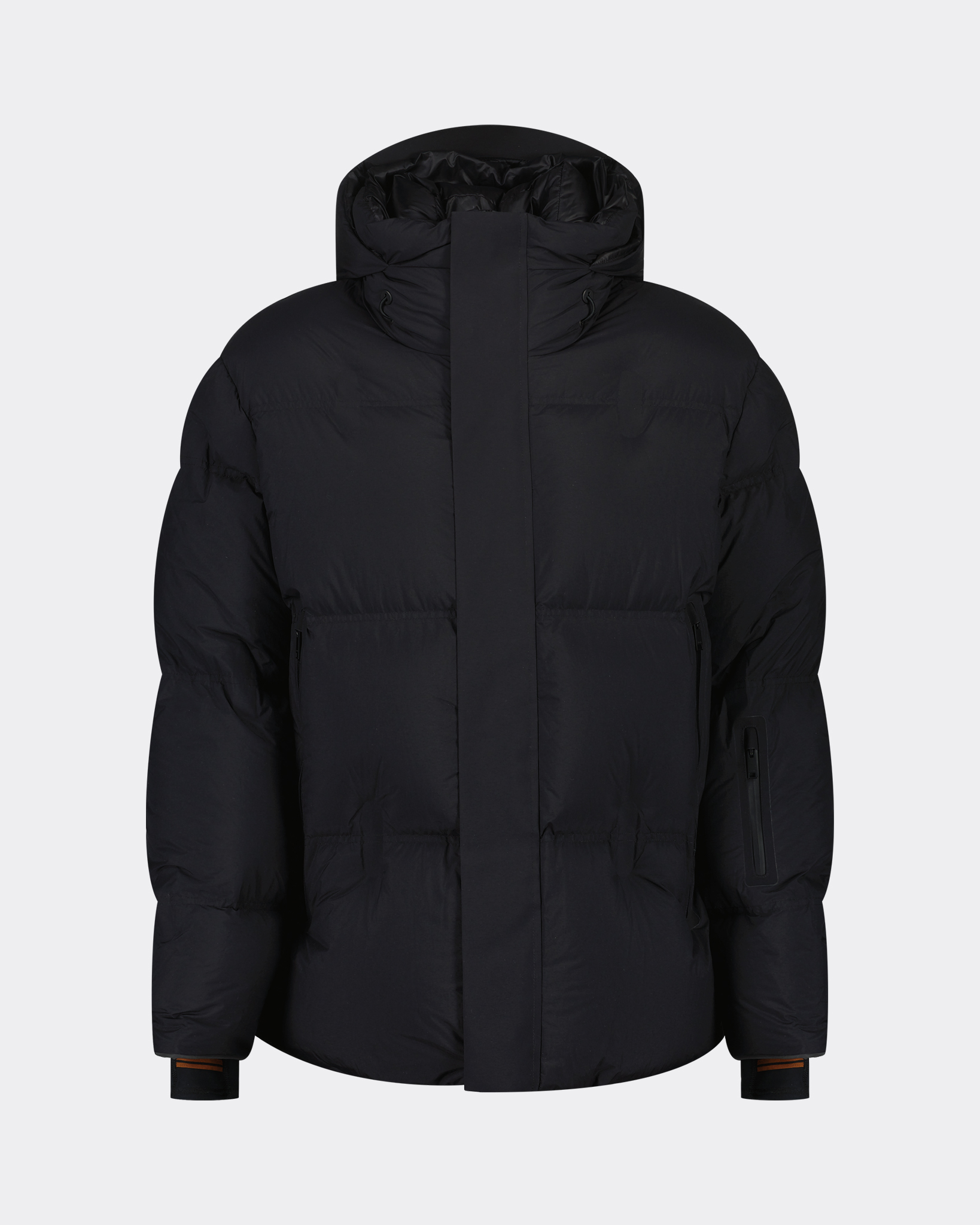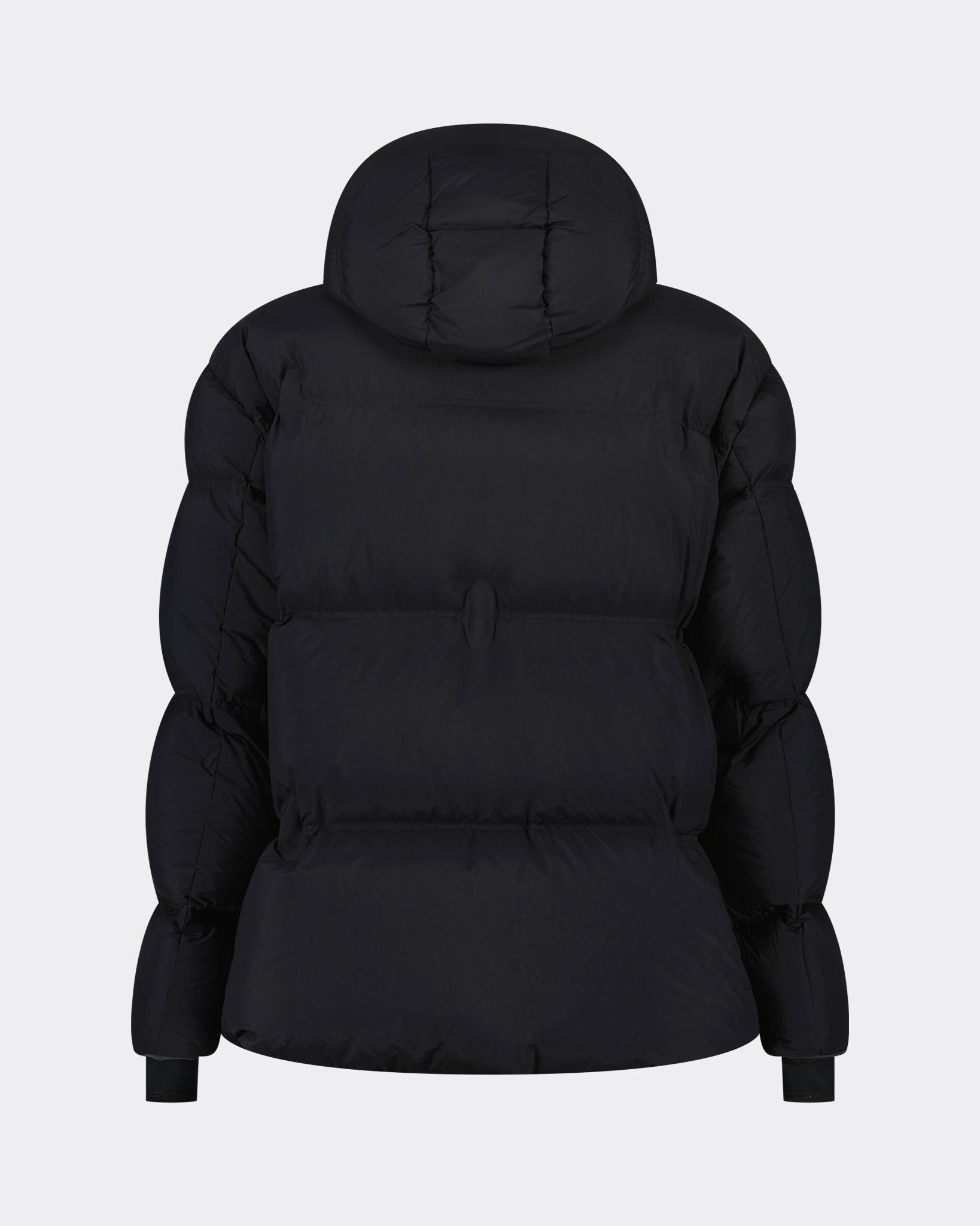 Maak een statement op de piste of in de stad met de blouson met Zwarte gelamineerde nylon donsvoering en capuchon. De jas heeft een eigentijdse, oversized pasvorm, is gewatteerd met warm dons en heeft een waterafstotende afwerking. Functionele details zoals de winddichte sneeuwvanger aan de binnenkant, winddichte manchetten en verstelbare zoom ronden het hoogwaardige ontwerp af.