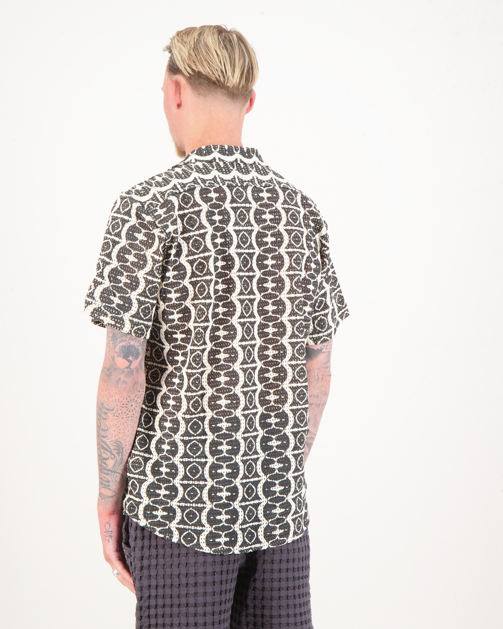 Het Hypnotise Cuba Net Shirt heeft een luchtige katoenen klosbinding, versierd met een print die is geïnspireerd op de betoverende patronen van slangen. Ontworpen met een resort kraag en knopen aan de voorkant