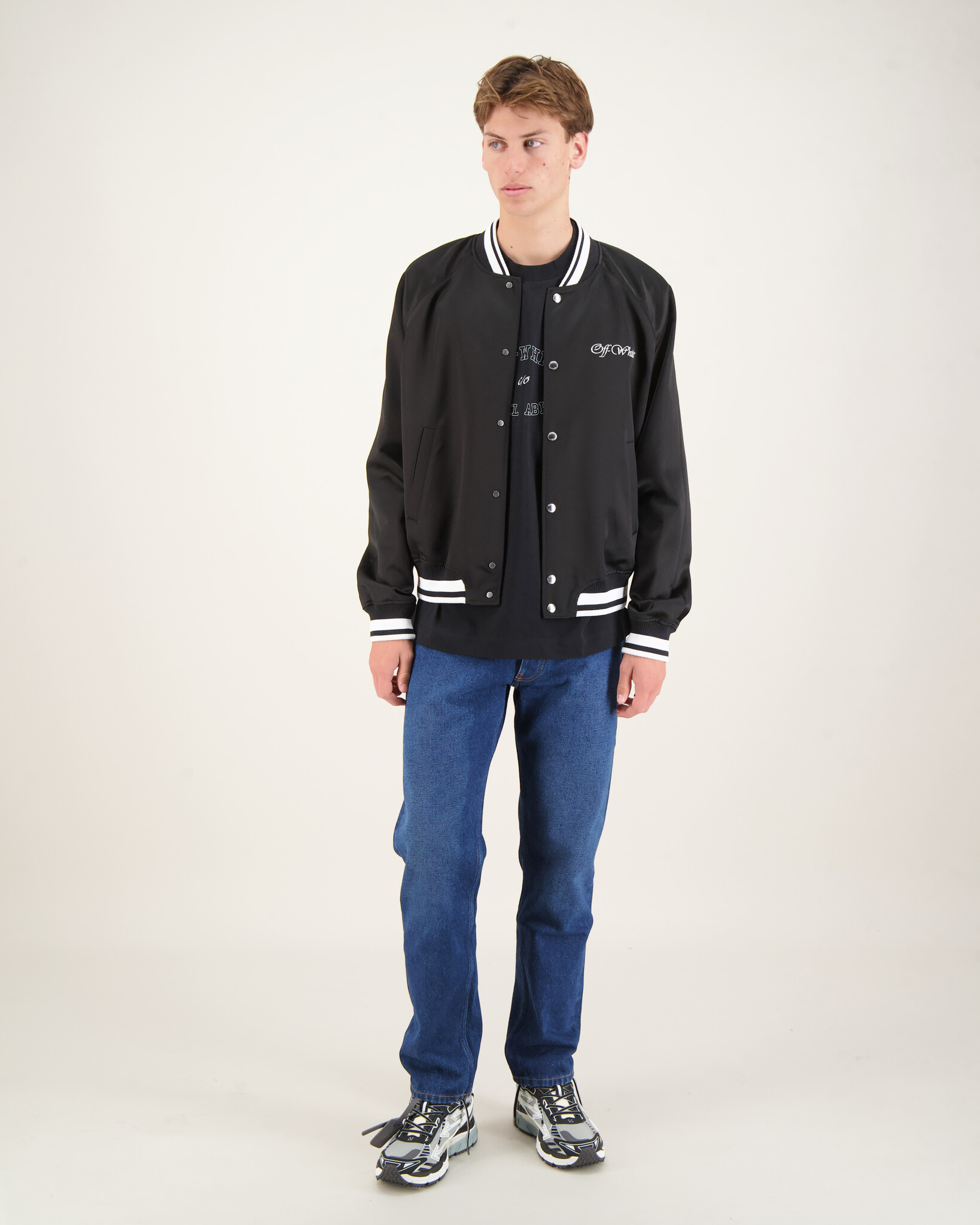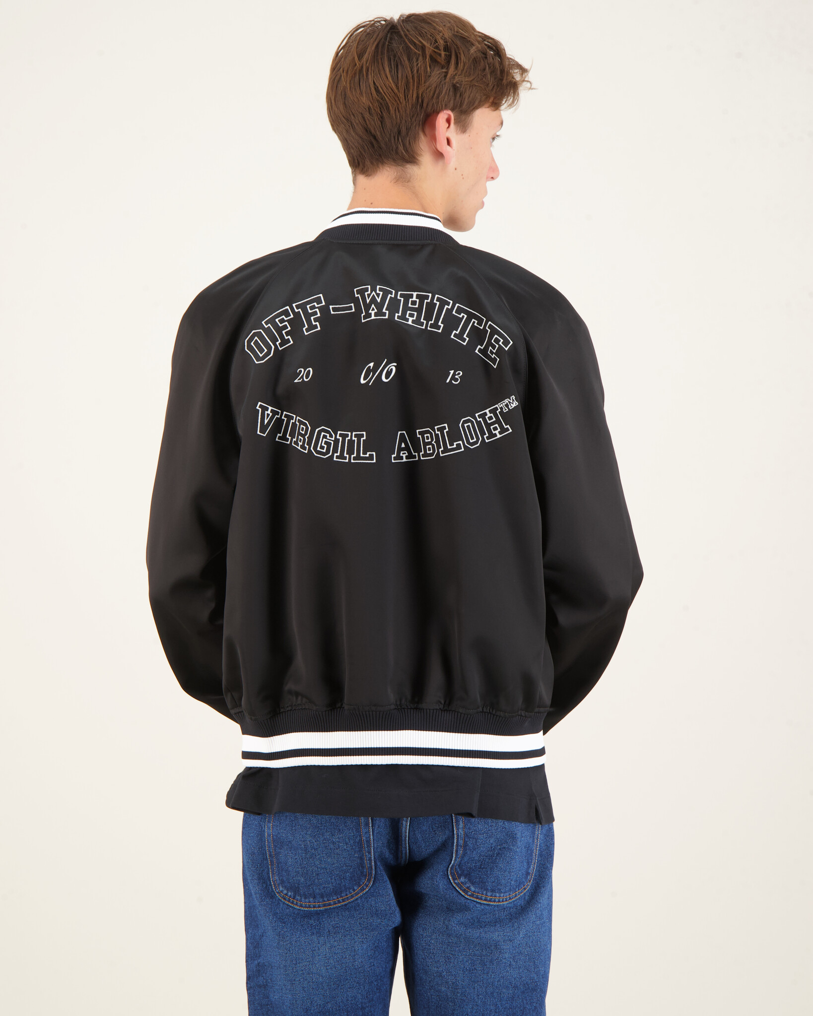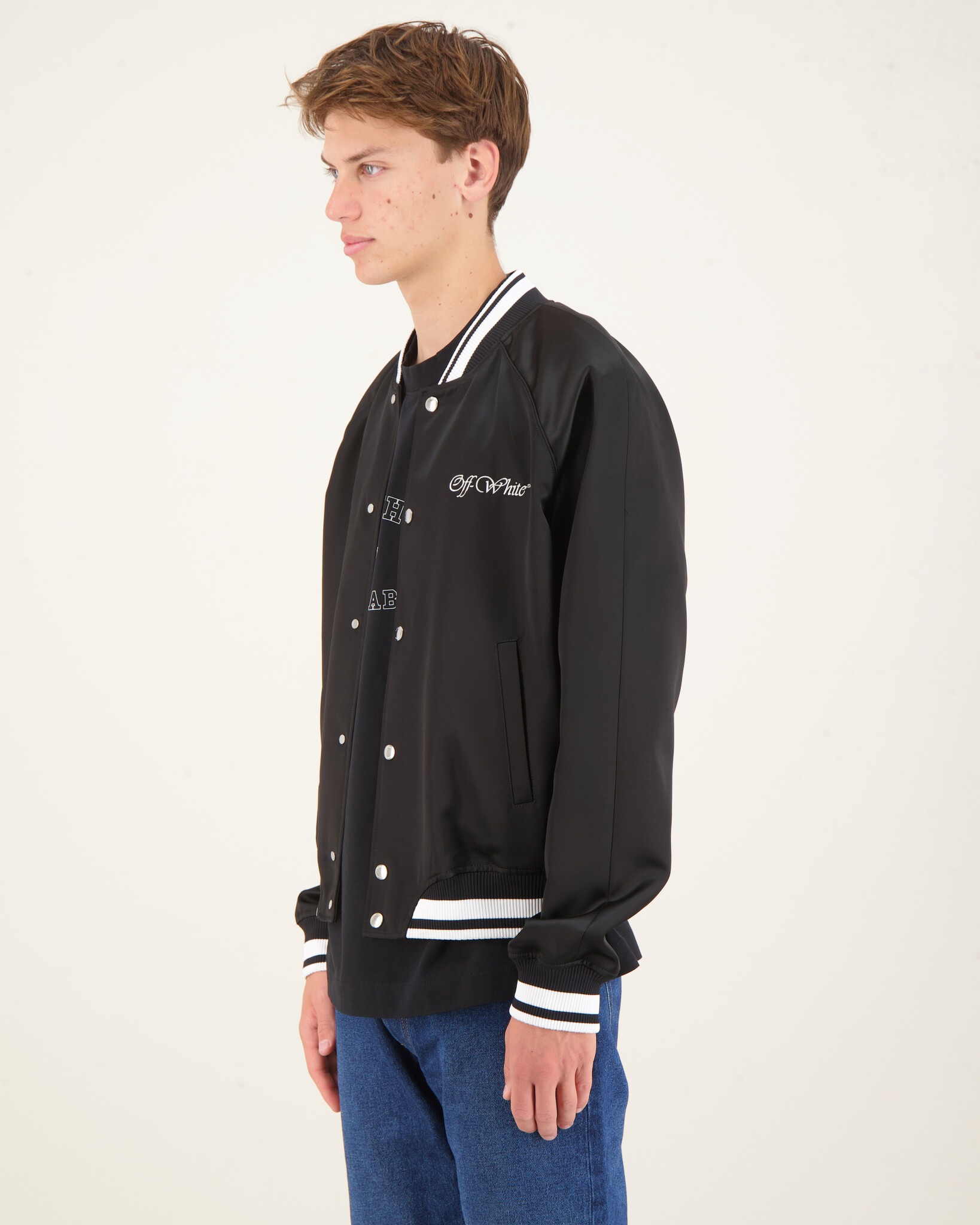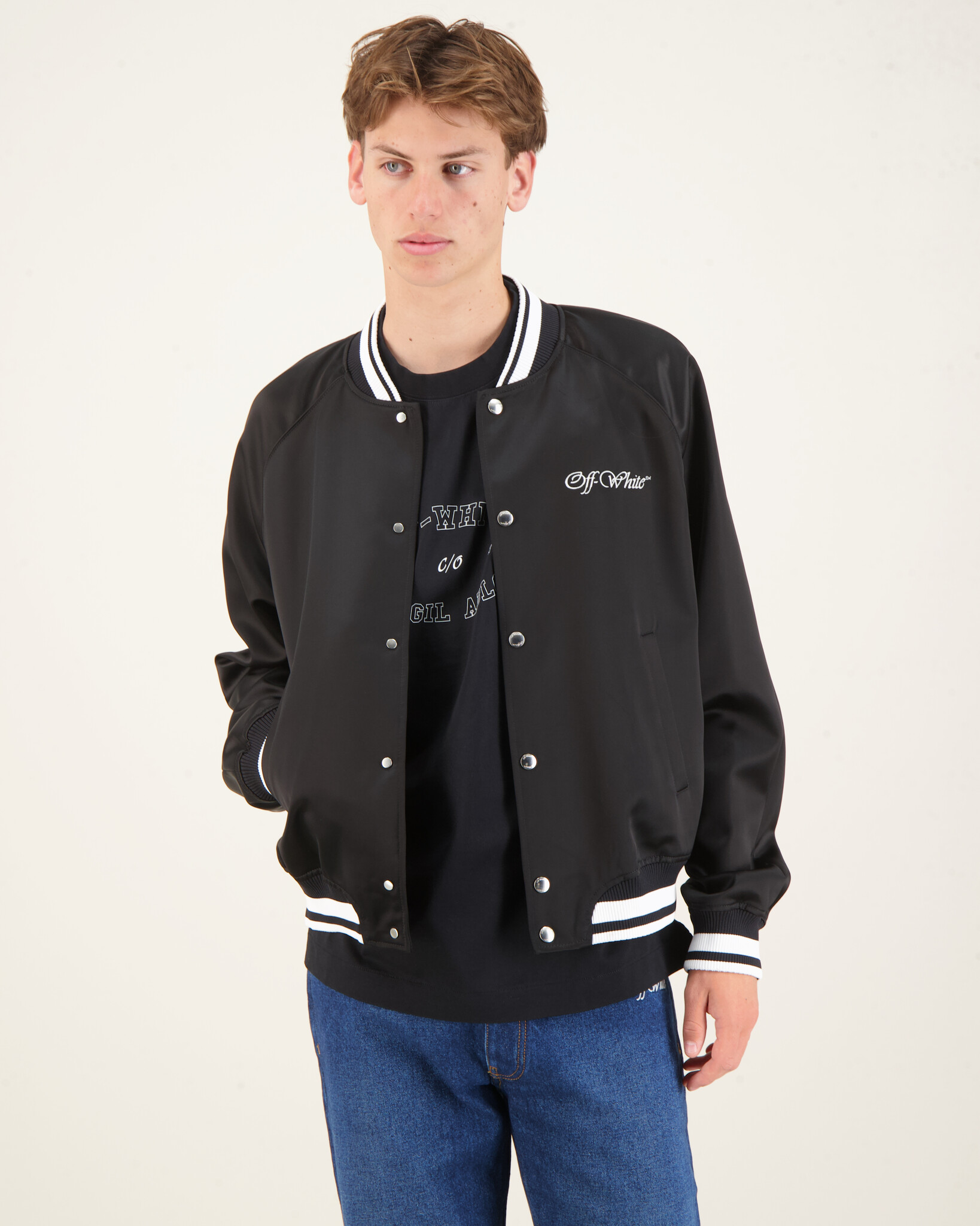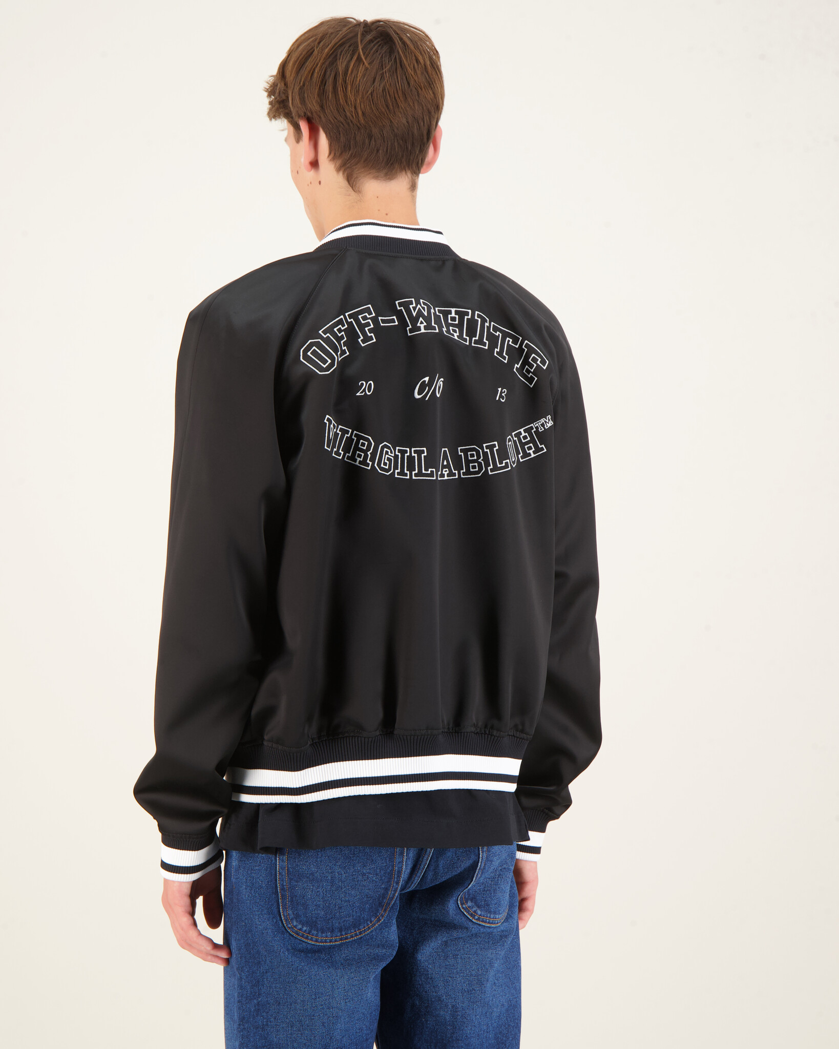 Zwart Satin College Jacket met 2 steek zakken, en geribde elastische band. De college jacket heeft een het bekende Off-White logo op de borst.