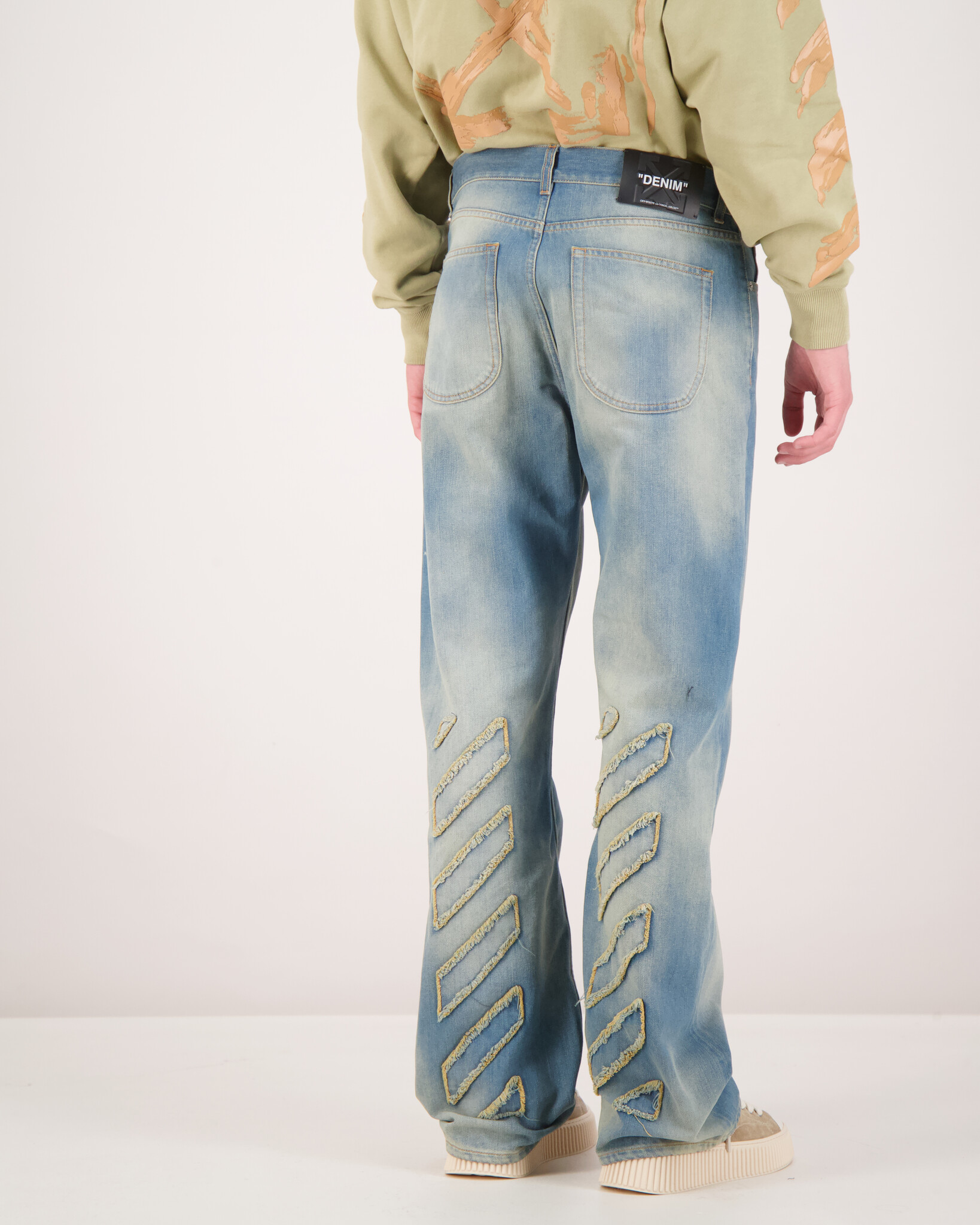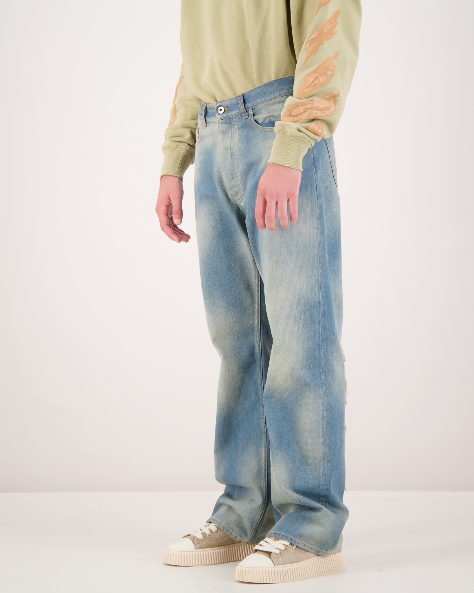 Een stoere 90s-style skate jeans met raw patches en een vergrijsde dirty blue wassing. Deze loose fit denim combineert rauwe details met moderne flair.