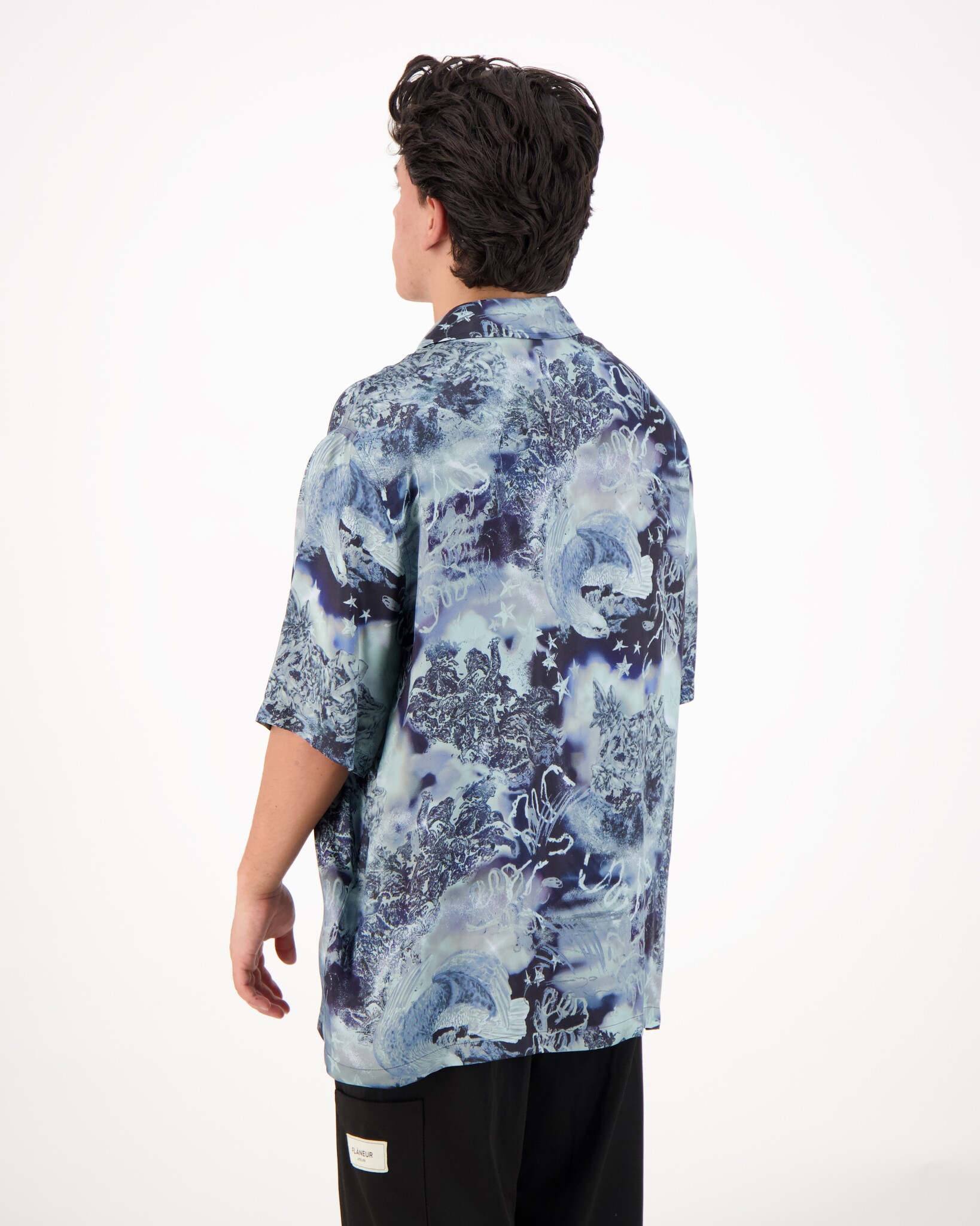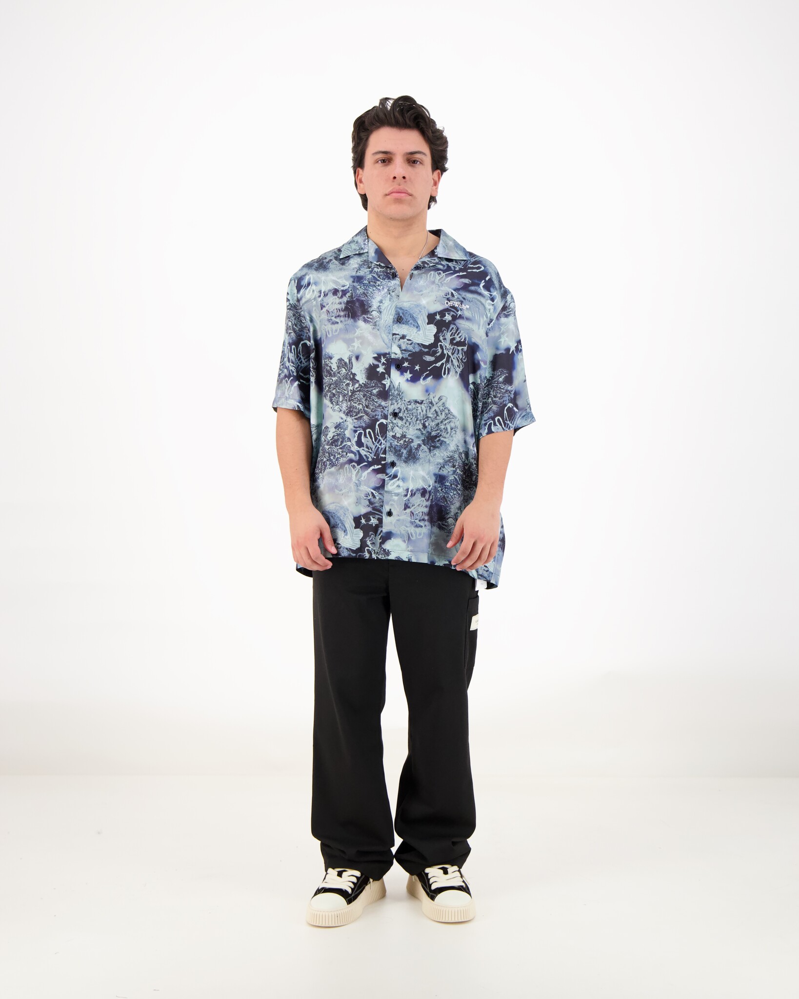 Blauwe Printed Bowling Shirt van het merk Off-White. Deze blouse is echt een must have voor het festival seizoen door de leuke kleur en print. Klein subtiel logo links op de borst en je kan de blouse sluiten door middel van knopen. Viscose is een zachte en ademende stof die vaak word gebruikt voor het soepele draagcomfort.