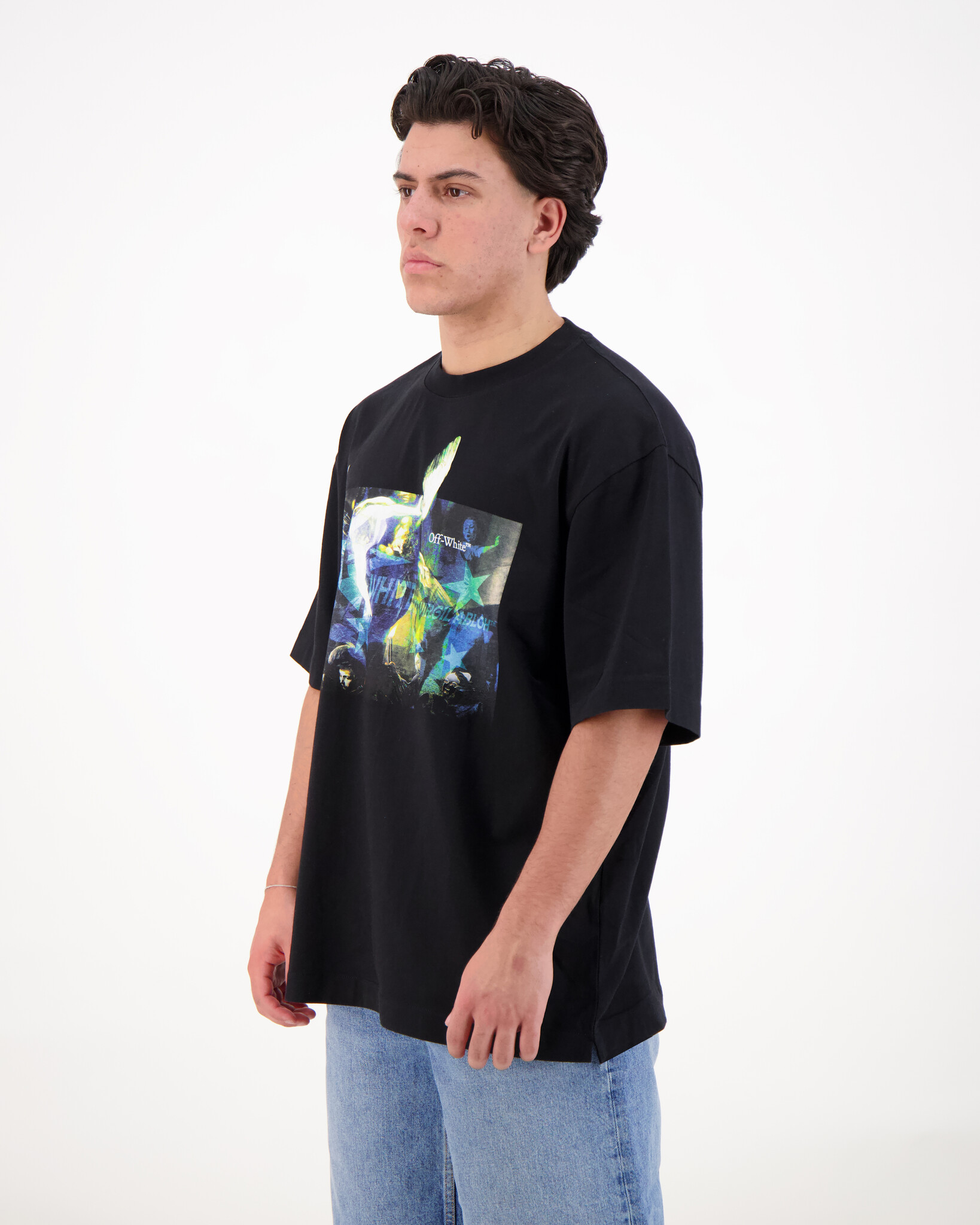 Zwarte Reve Caravaggio SS Skate van het merk Off-White. Hoogwaardige jersey-kwaliteit die vorm behoudt en prettig aanvoelt op de huid. Gemaakt van 100% Katoen waardoor het comfortable te dragen is. voorzien van een Off-White logo, print op de borst wat een herkenbaar streetwear-detail is.
