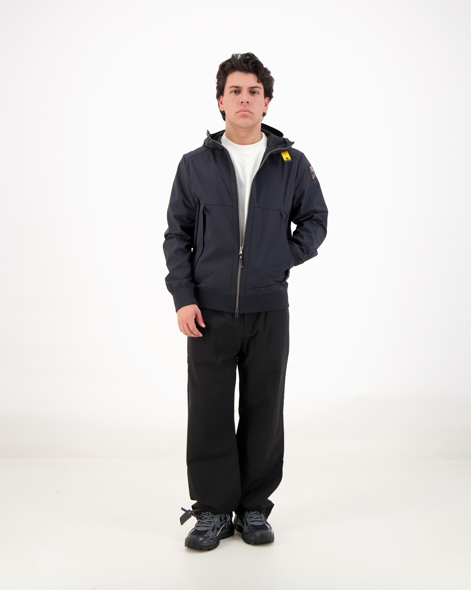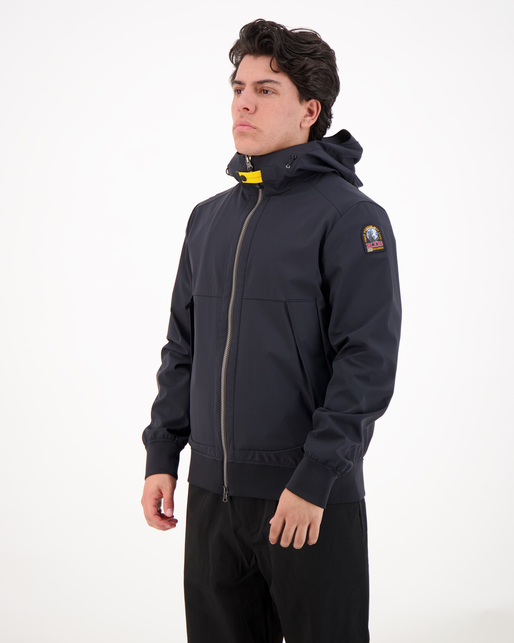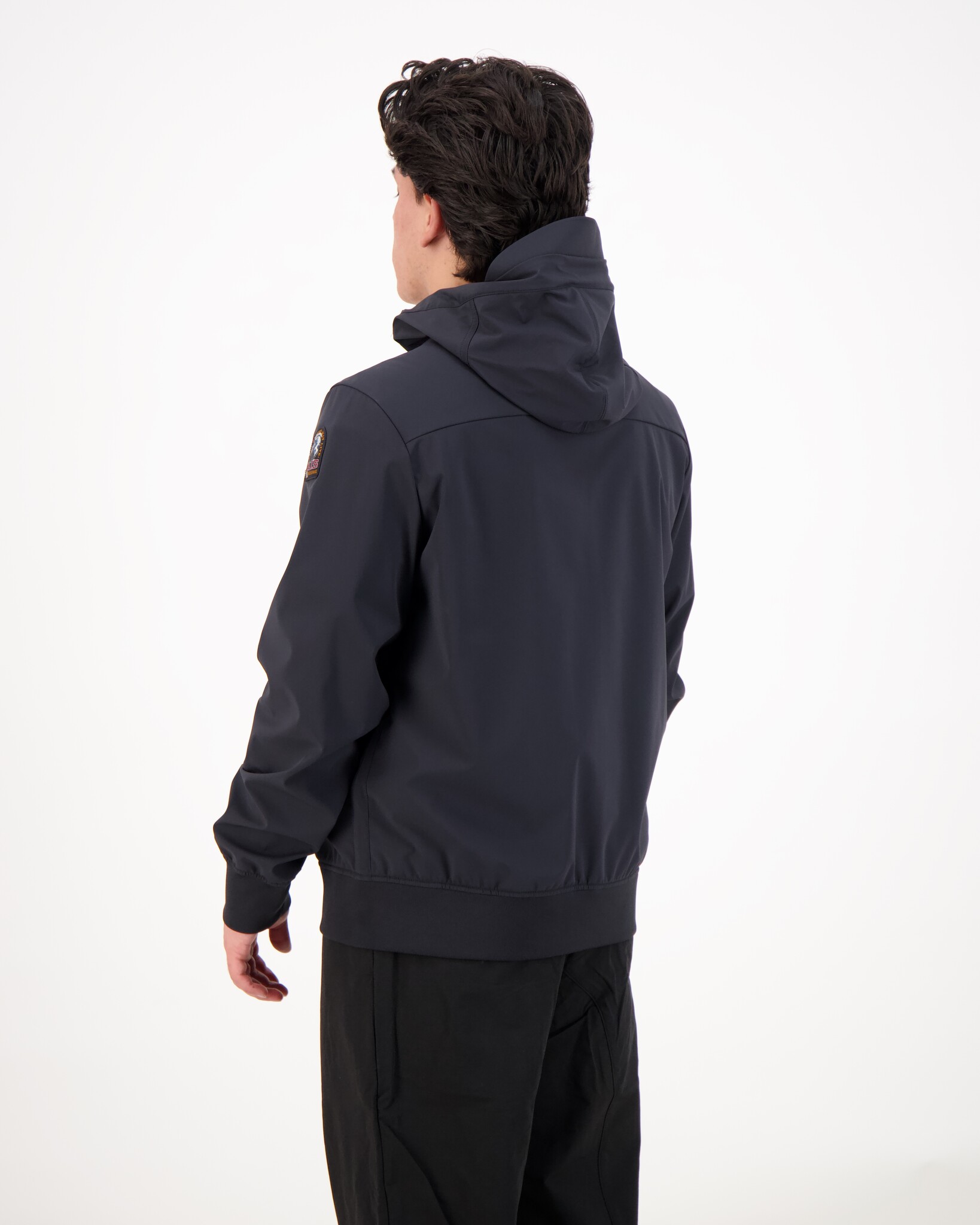 Zwarte Abner Windjacket van het merk Parajumpers. Gemaakt van een 3-laag stretch softshell-materiaal met winddichte en waterafstotende eigenschappen. Voorzien van dubbele ritssluiting, ritszakken en binnenzak. Ribboorden aan mouw en onderzijde voor comfort.