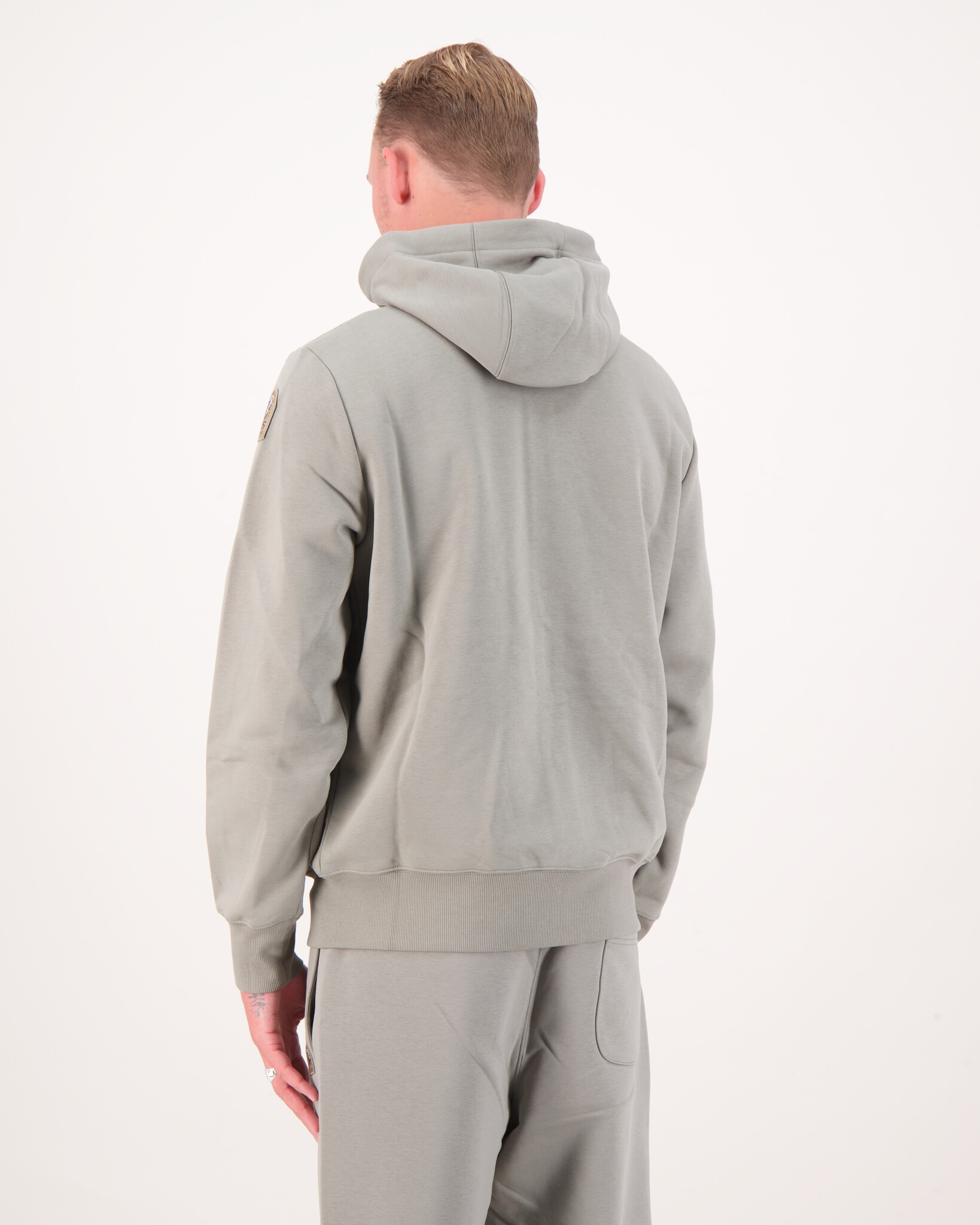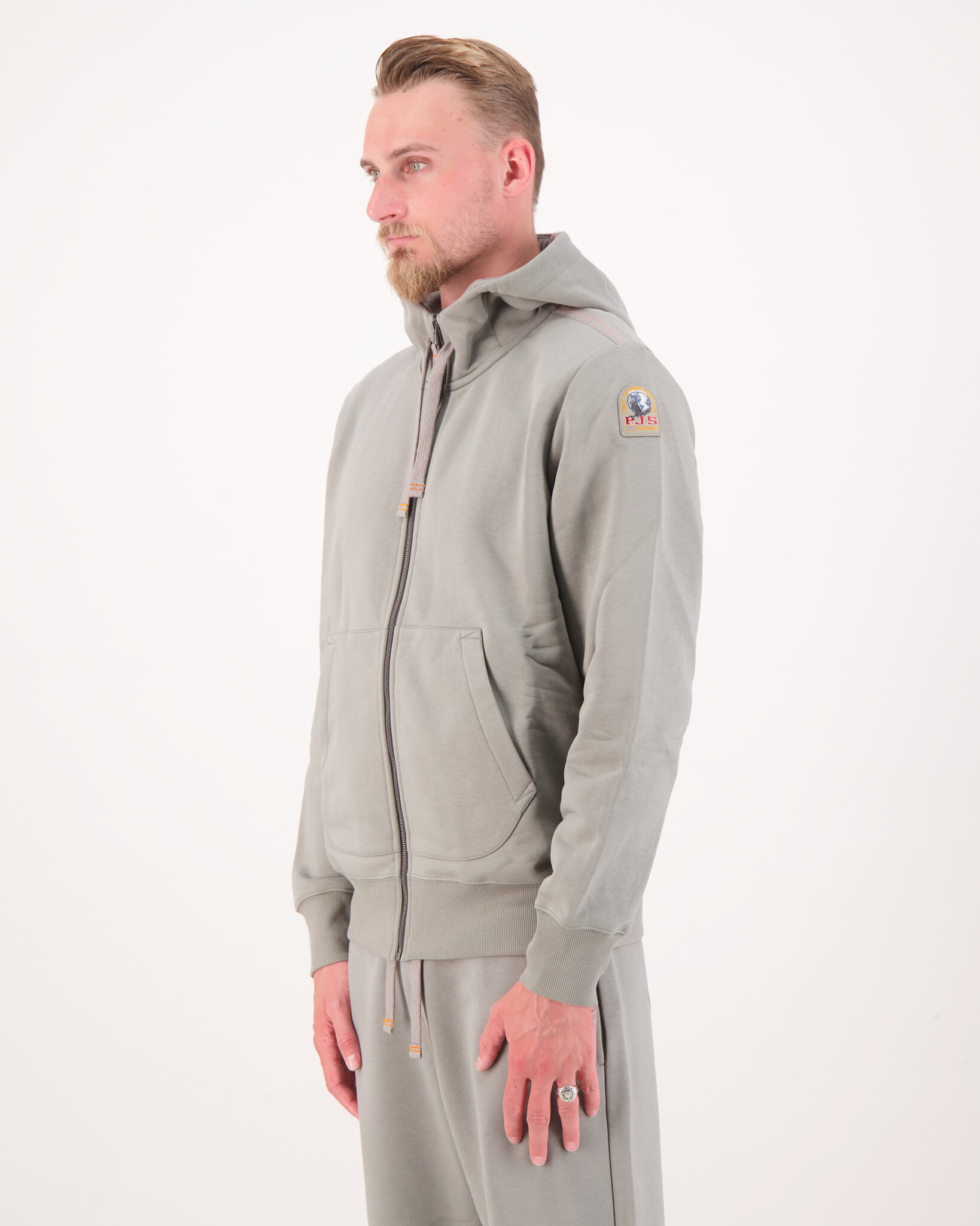 Donkergrijze Charlie Easy Vest van het merk Parajumpers. Het vest heeft een capuchon en lange mouwen. Op de armen heeft het vest lange gele lijnen en op de linkermouw het bekende parajumper patch.