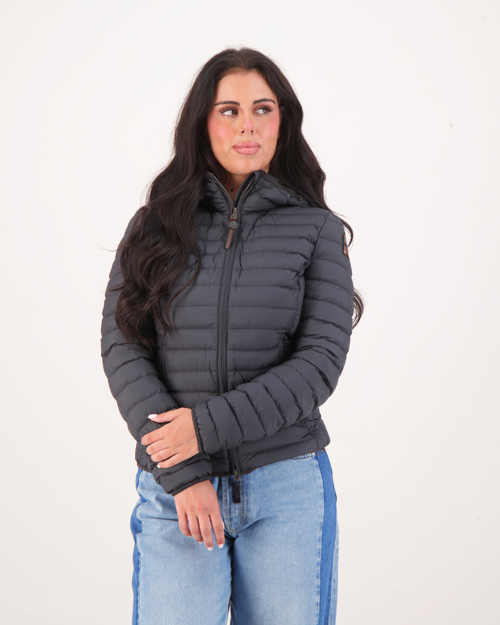 Zwarte Juliet Jas van het merk Parajumpers Dames. De Juliet jas van Parajumpers combineert technische verfijning met minimalistische mode‑esthetiek. Licht van gewicht, voorzien van subtiele, utilitaire details – perfect voor stedelijke winterlooks of avontuurlijke wandelingen met een fashion‑edge.