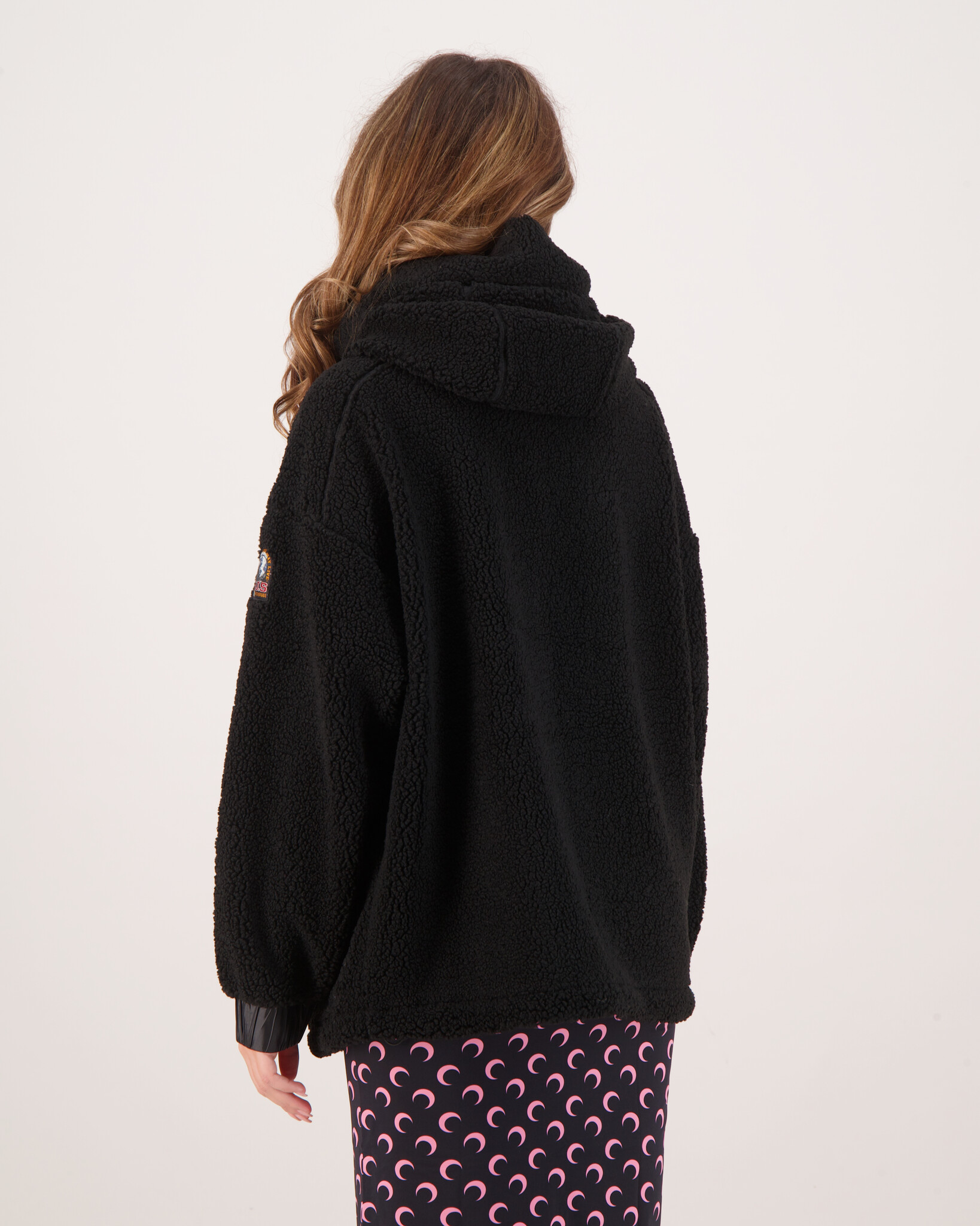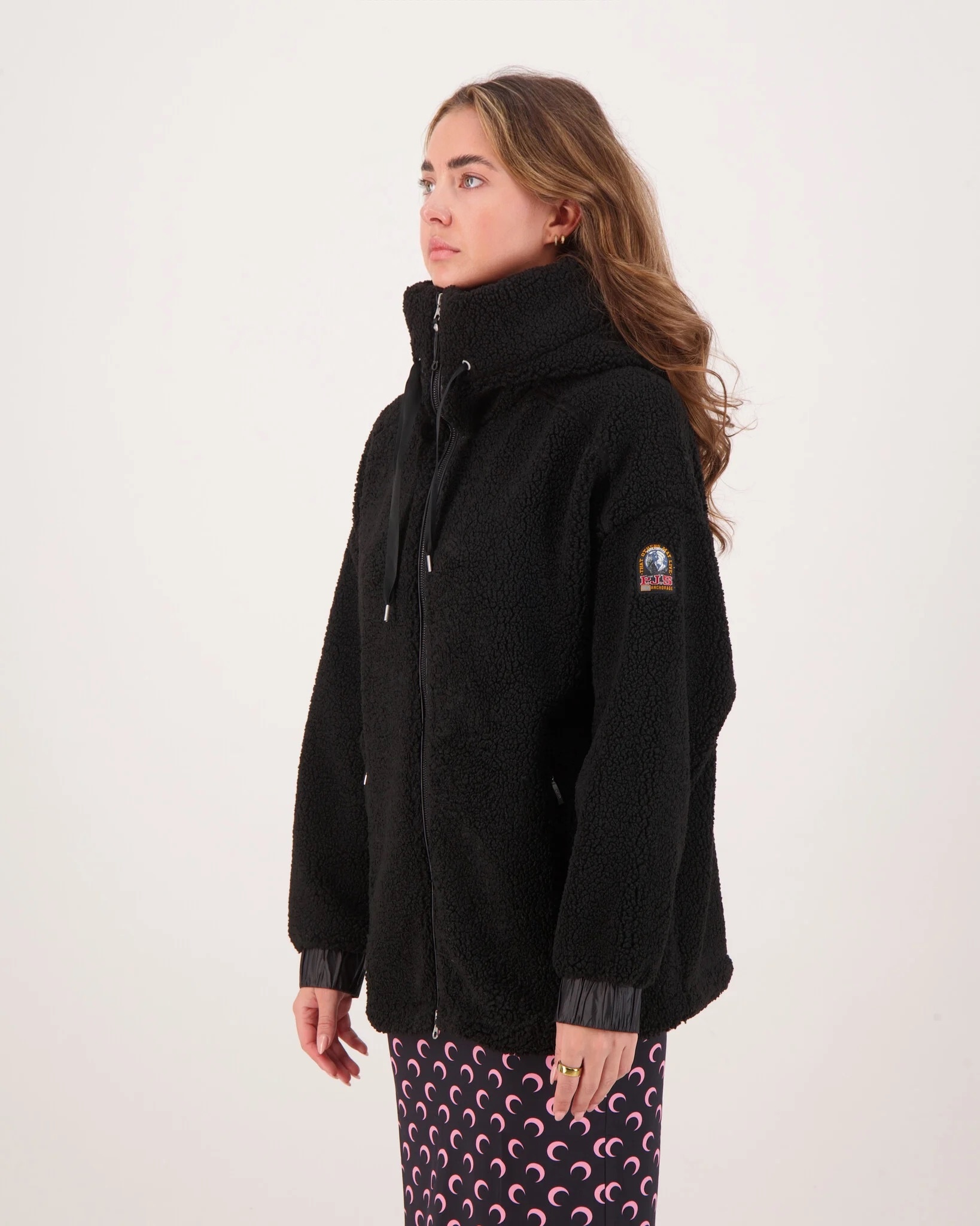 Zwarte 'Noelle Vest' van het merk Parajumpers Dames. Noelle is sweater met capuchon met volledige rits gemaakt van krullende polyester fleecestof met details van semi-glanzend 20-denier nylon tafzijde, afkomstig uit de Power Fleece-collectie. Zeer warm en comfortabel en ideaal tijdens de koude dagen.