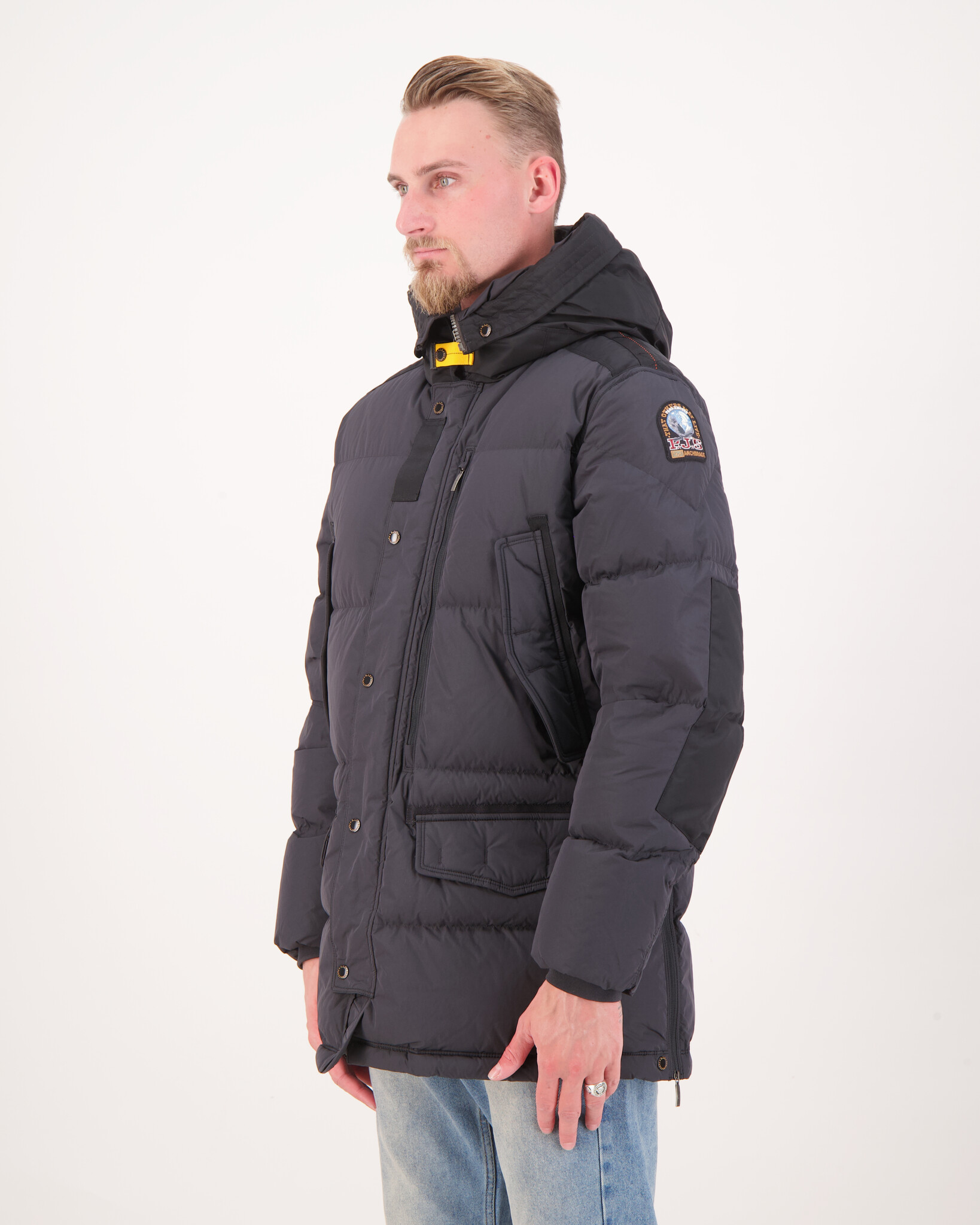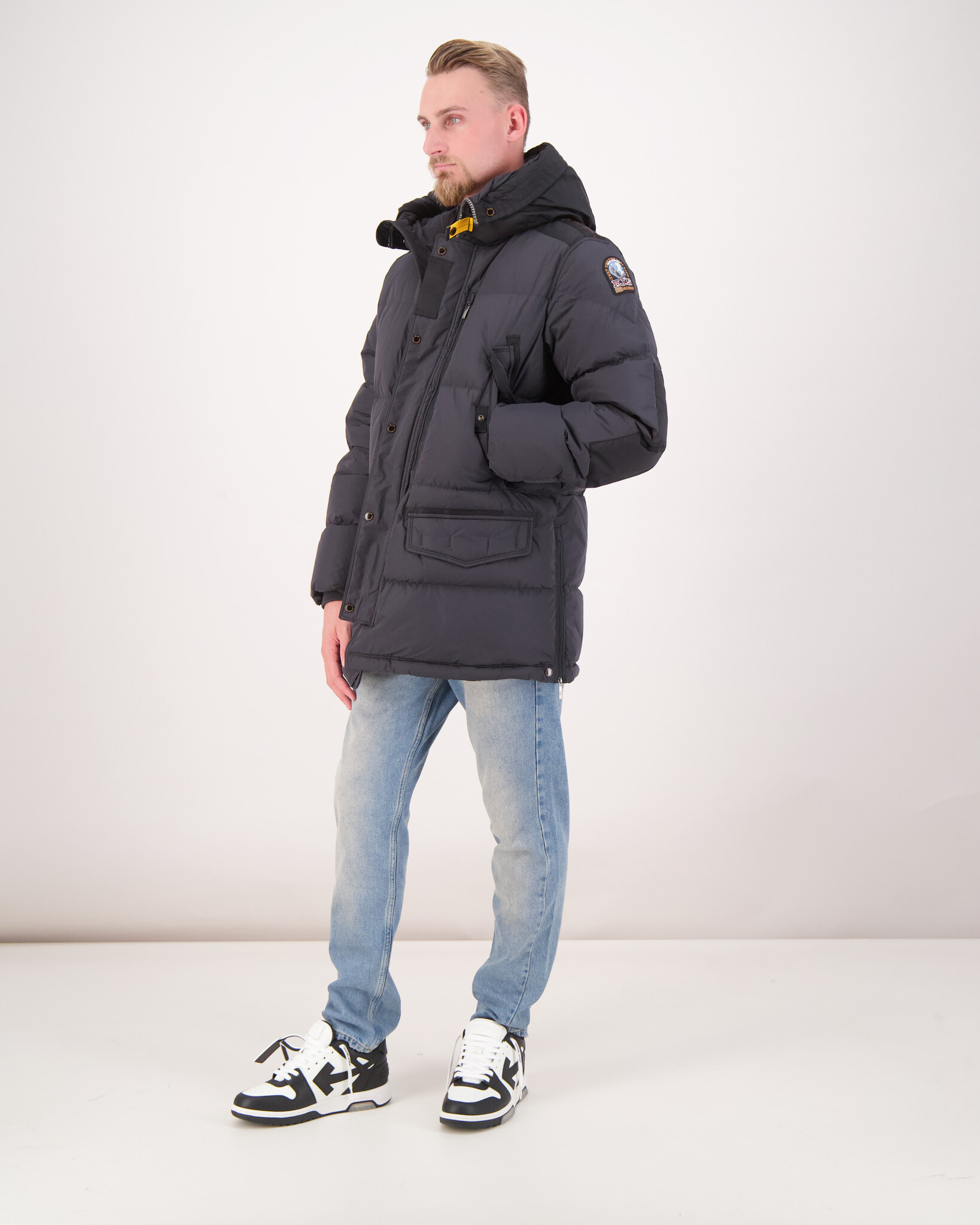 Zwarte Harraseeket Puffer Jacket van het merk Parajumpers. Pharrell is een met dons gevuld jack met capuchon gemaakt van polyester-nylon keperstof met een glanzende afwerking, afkomstig uit de Sheen-collectie. Het eenvoudige ontwerp is een must-have voor je kledingkast.