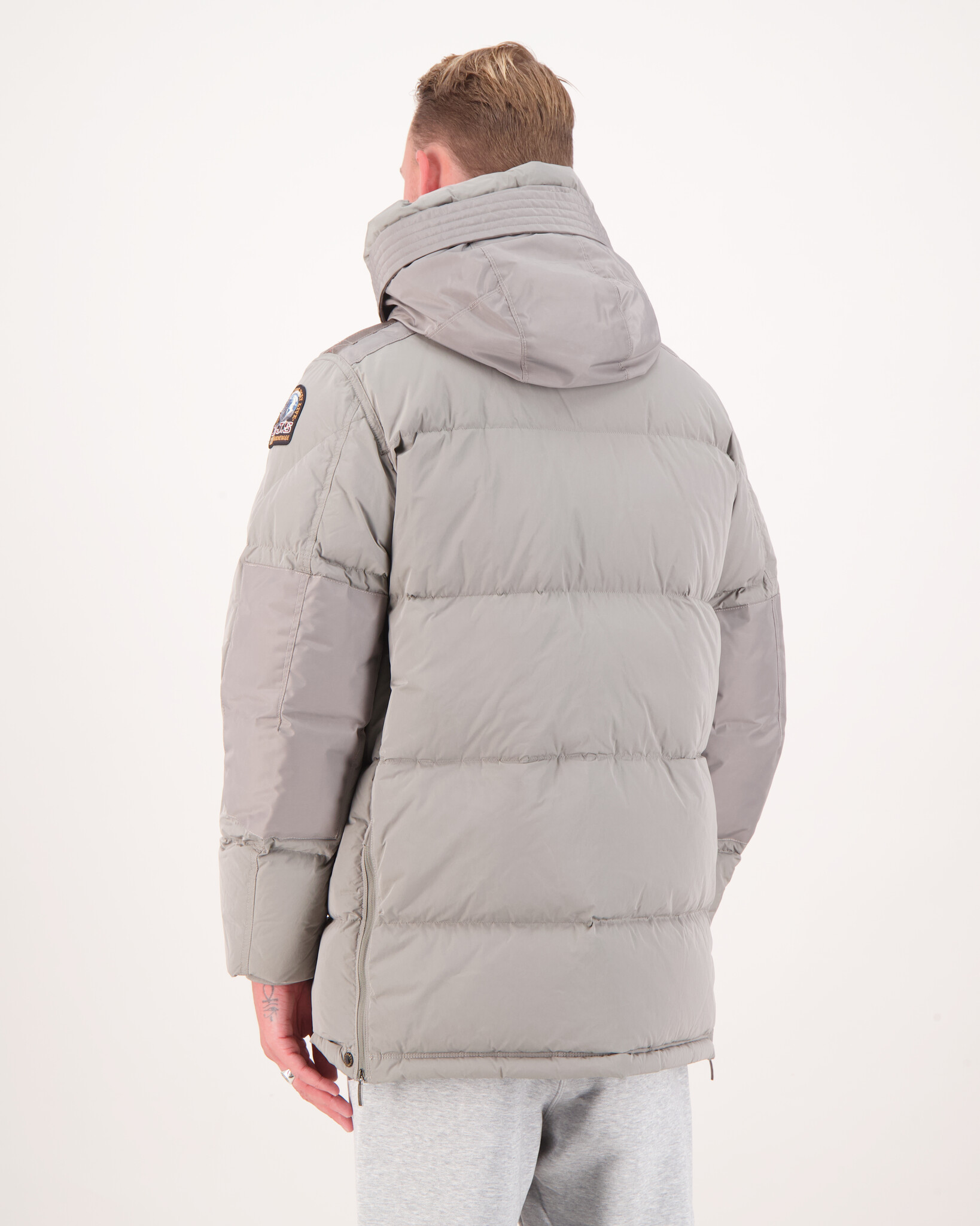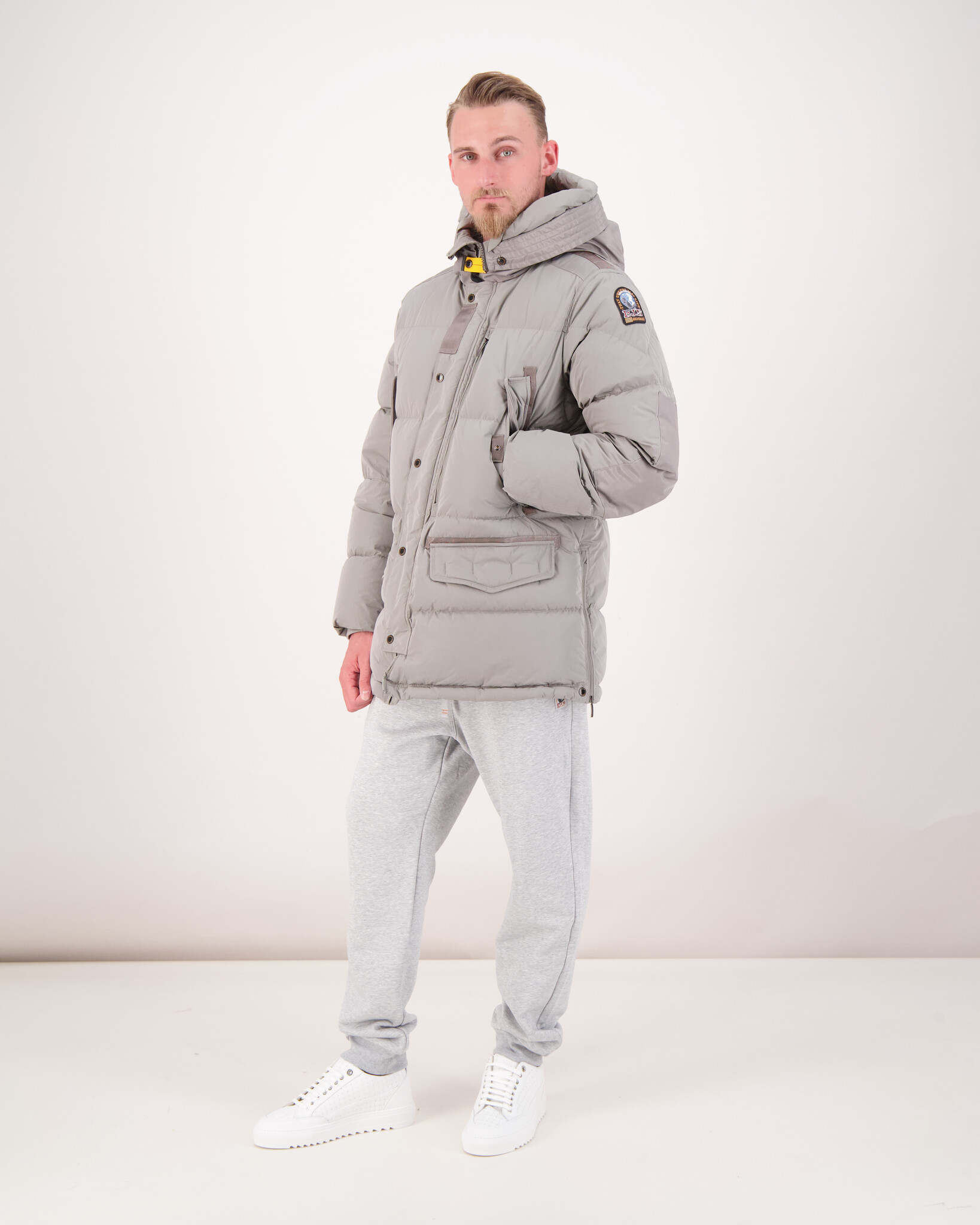 Donkergrijze Harraseeket Puffer Jacket van het merk Parajumpers. Pharrell is een met dons gevuld jack met capuchon gemaakt van polyester-nylon keperstof met een glanzende afwerking, afkomstig uit de Sheen-collectie. Het eenvoudige ontwerp is een must-have voor je kledingkast.