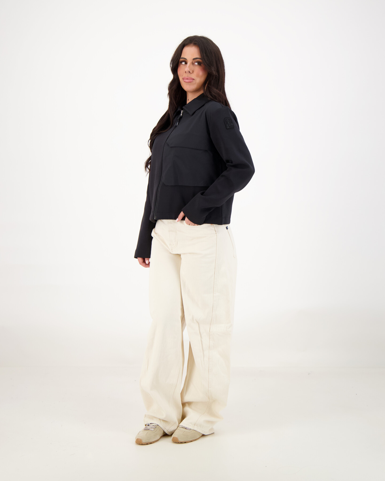 Zwarte Jelka jas van het merk Parajumpers. De bekende patch op de mouw en de gele elastische band bij de kraag. Het is een praktische jas voor dagelijks gebruik – ideaal voor stedelijke mode of casual outfits wanneer je iets nodig hebt dat licht beschermt tegen wind en schommelingen in temperatuur.