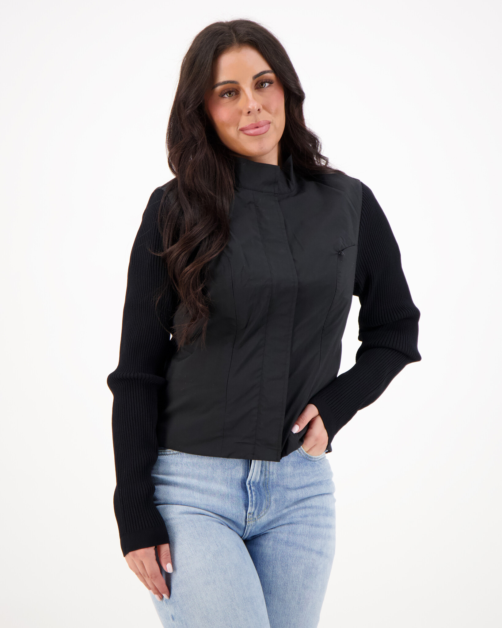 De Krysta Jas combineert een moderne, sportieve uitstraling met een vrouwelijke pasvorm. Het voorpand is uitgevoerd in een gladde, licht glanzende stof die zorgt voor een strakke en minimalistische look. De ribgebreide mouwen geven het ontwerp een subtiel contrast en zorgen voor extra comfort en flexibiliteit. De opstaande kraag en blinde sluiting versterken het cleane silhouet, waardoor deze jas perfect is voor zowel casual als meer geklede outfits.Een veelzijdig item dat moeiteloos te combineren is met jeans, een pantalon of een rok.