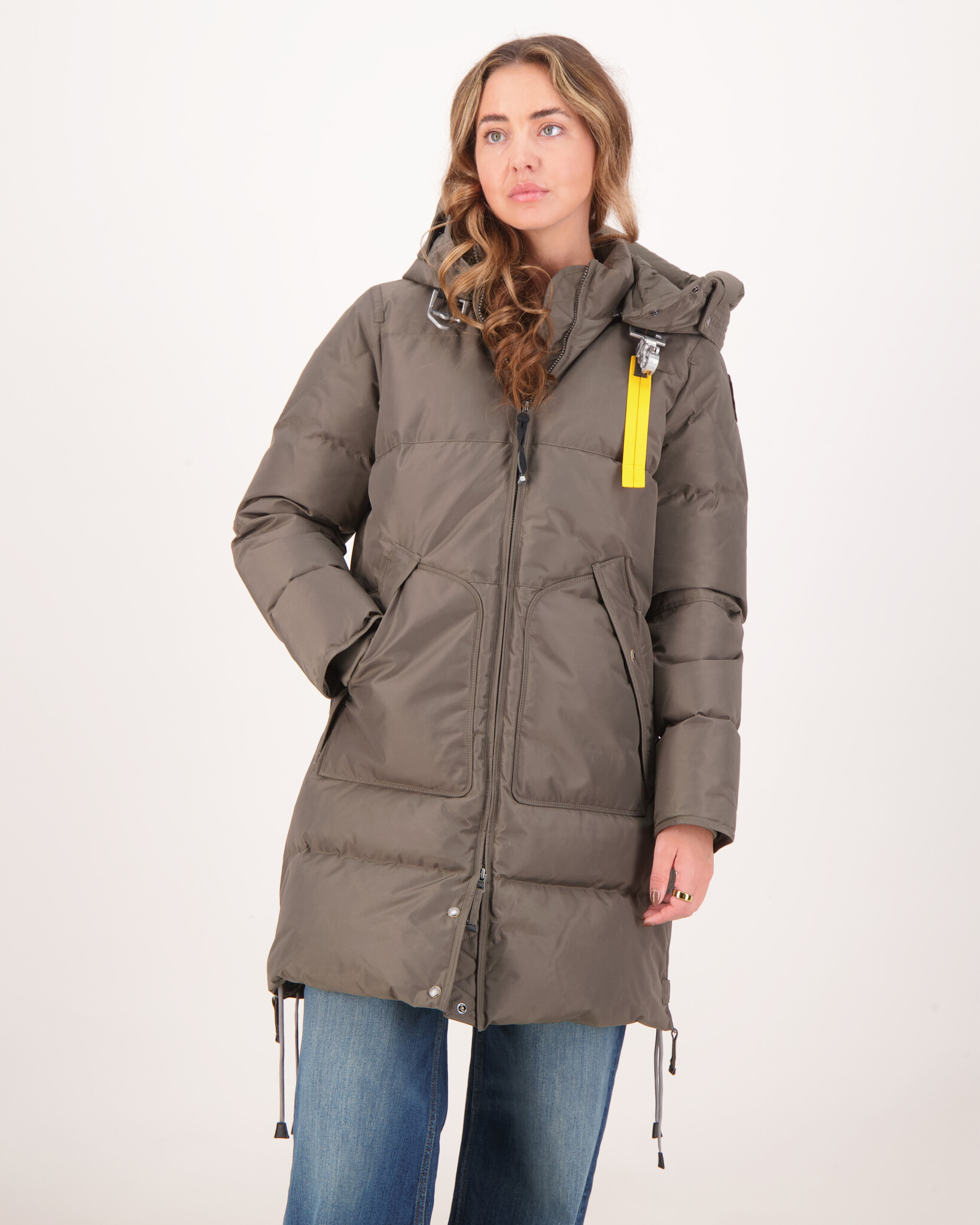 Olive Long Bear Jas van het merk Parajumpers Dames. De jas heeft een capuchon, op de voorzijde van de jas zitten 2 zakken en op de linkermouw is het PJS logo te vinden.Long Bear is het bekende lange met dons gevulde jack van Parajumpers, afkomstig uit de Masterpiece-familie. Dit jack is gemaakt van gelamineerd gerecycled nylon oxford en is een tijdloze klassieker in de Parajumpers-collectie.