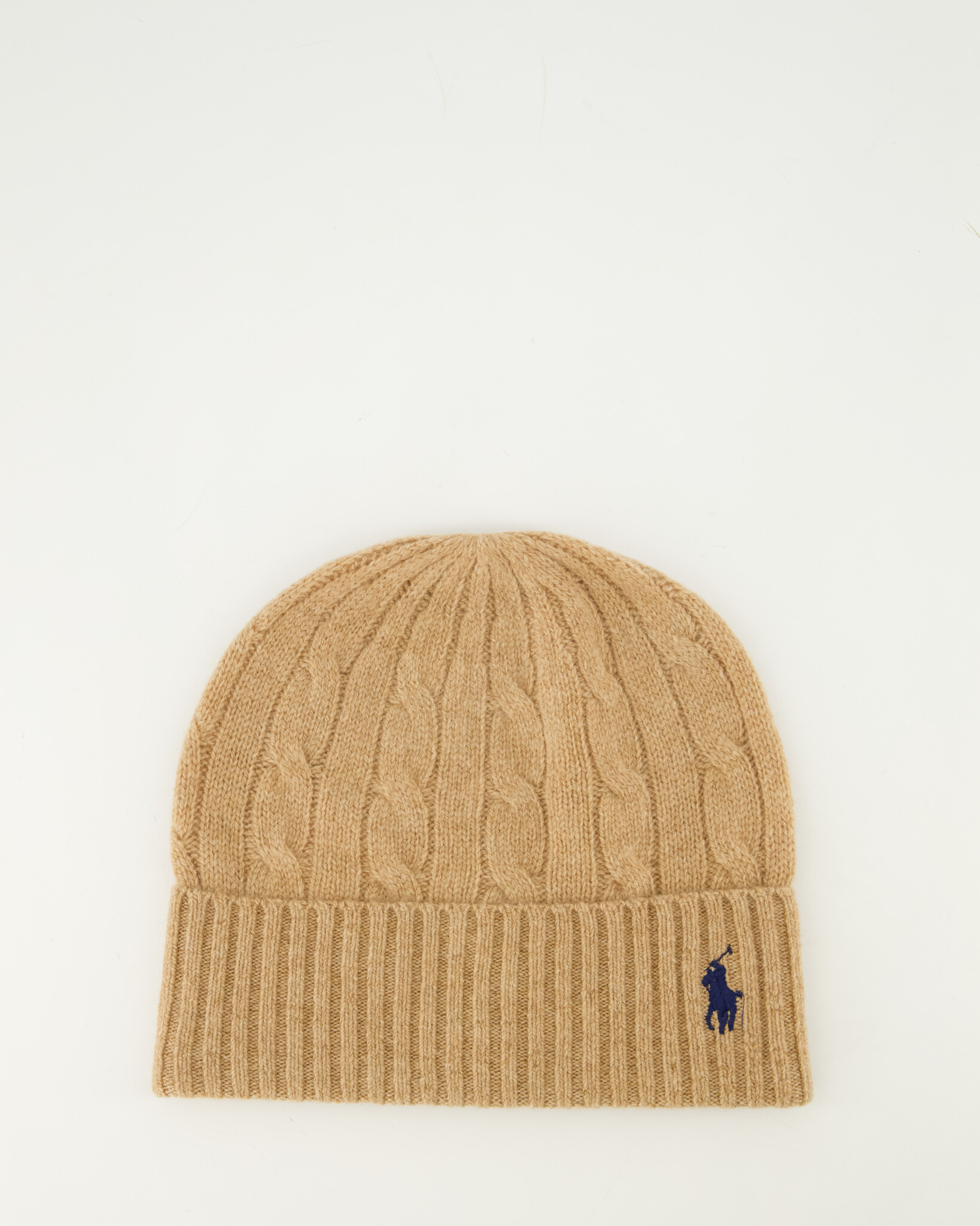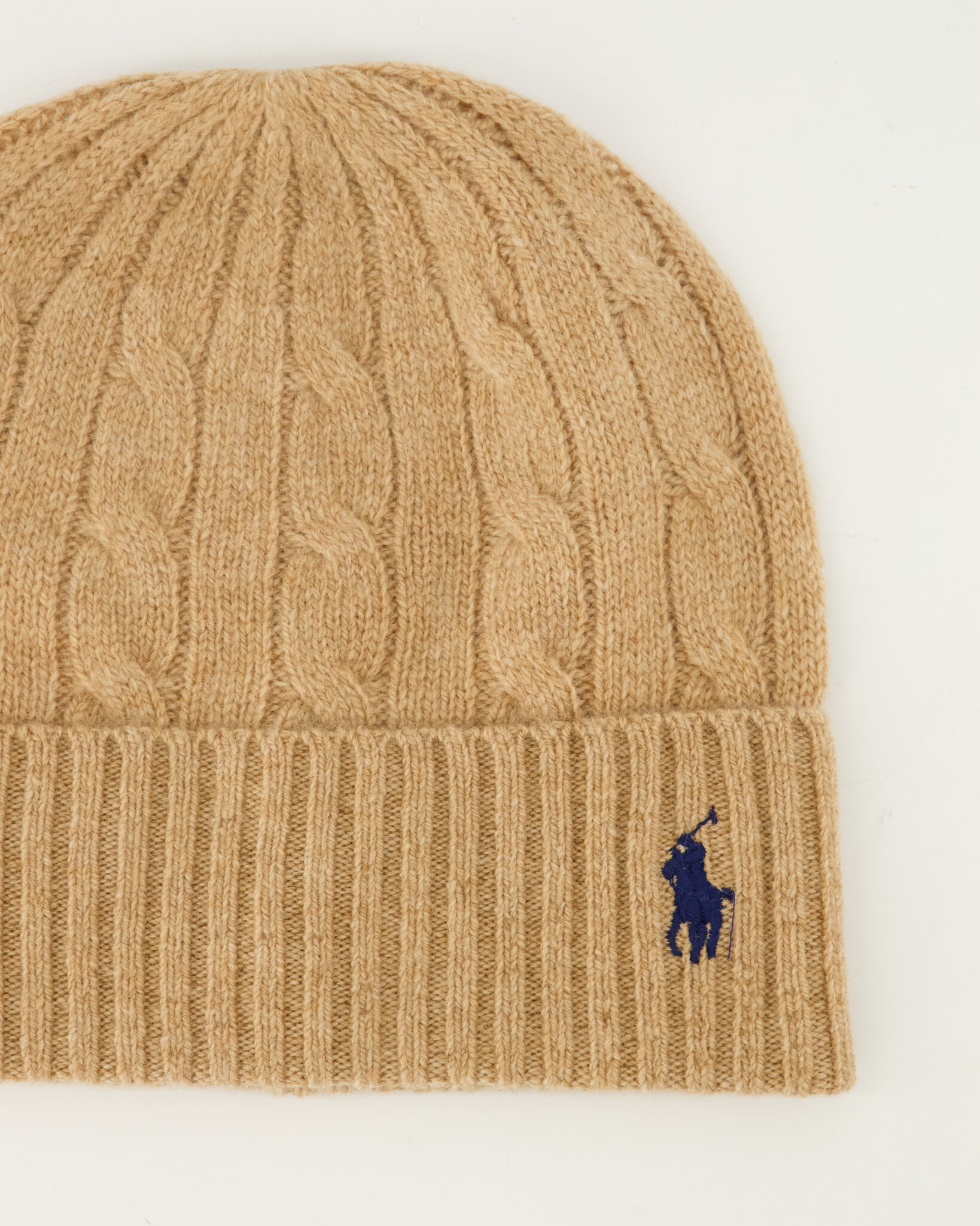 Camel Cable knit Beanie van het merk Polo Ralph Lauren. Deze beanie biedt een perfecte mix van stijl en comfort. Het kabelgebreide ontwerp, geeft de muts een klassieke en luxueuze uitstraling. De omgeslagen boord is voorzien van het iconische Polo Ralph Lauren subtiel geborduurd een verfijnde touch van herkenbare branding
