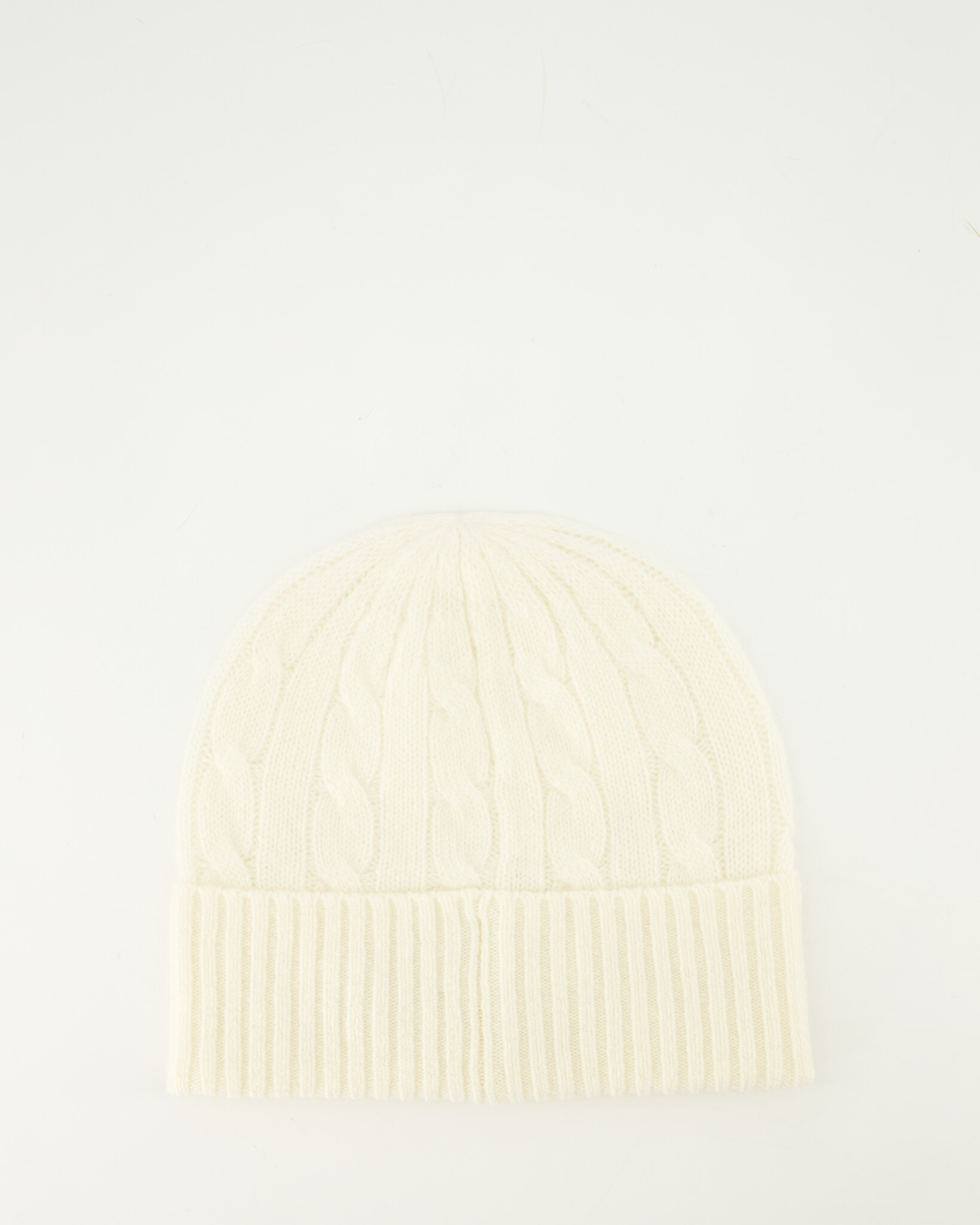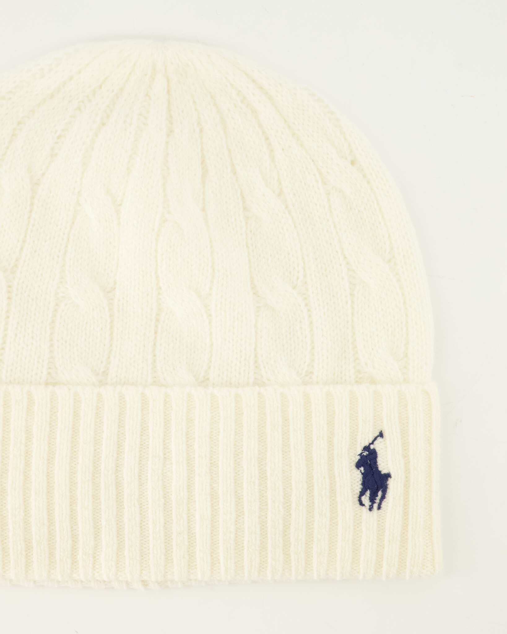 Creme Cable knit Beanie van het merk Polo Ralph Lauren. Deze beanie biedt een perfecte mix van stijl en comfort. Het kabelgebreide ontwerp, geeft de muts een klassieke en luxueuze uitstraling. De omgeslagen boord is voorzien van het iconische Polo Ralph Lauren subtiel geborduurd een verfijnde touch van herkenbare branding