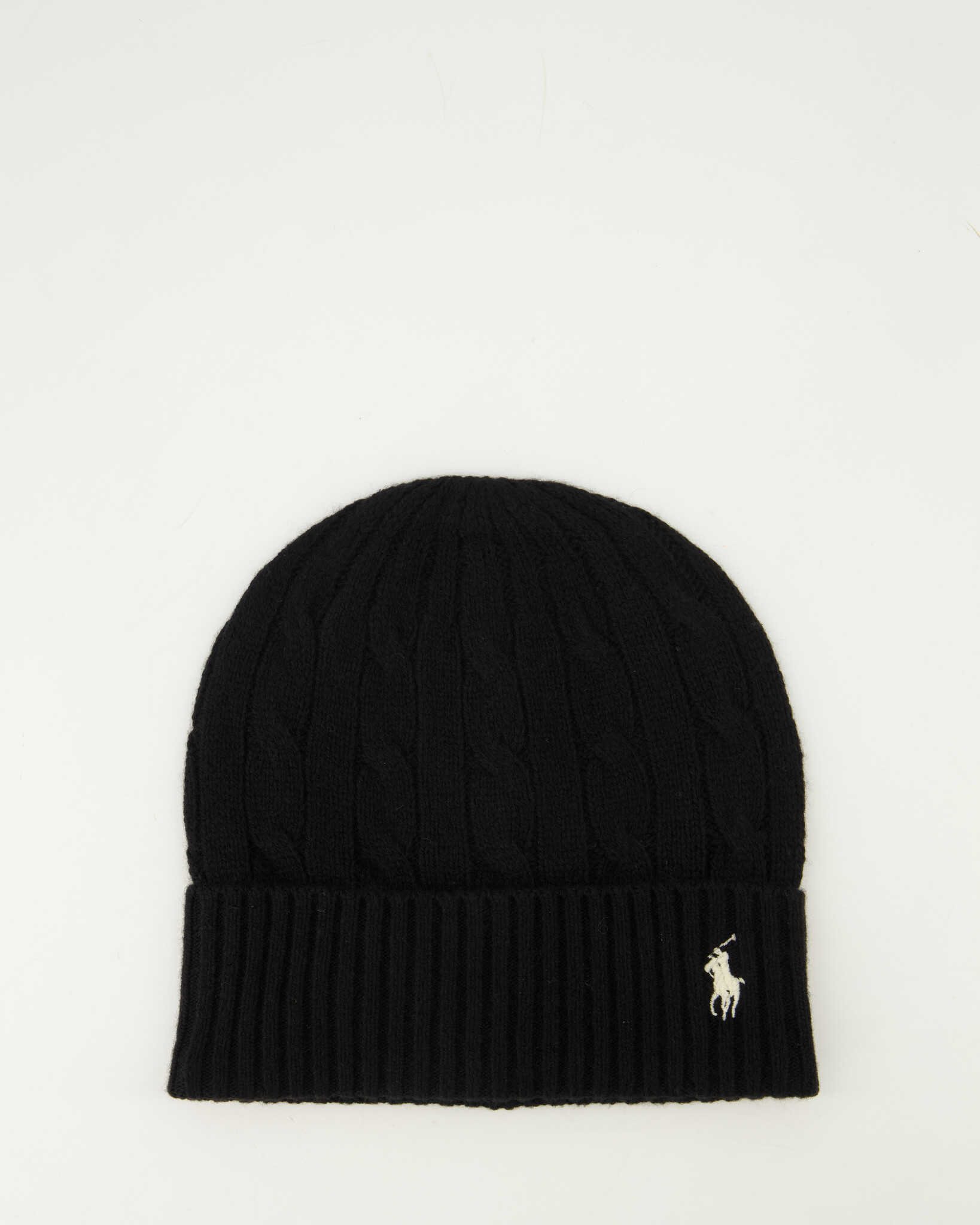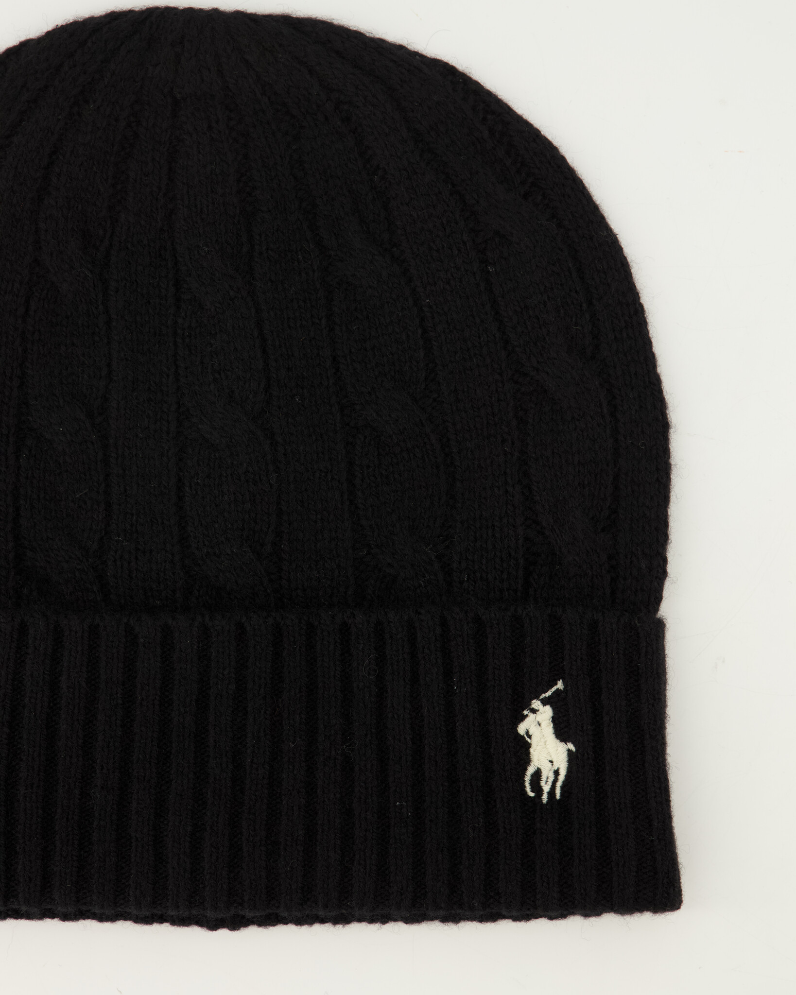Zwarte Cable knit Beanie van het merk Polo Ralph Lauren. Deze beanie biedt een perfecte mix van stijl en comfort. Het kabelgebreide ontwerp, geeft de muts een klassieke en luxueuze uitstraling. De omgeslagen boord is voorzien van het iconische Polo Ralph Lauren subtiel geborduurd een verfijnde touch van herkenbare branding