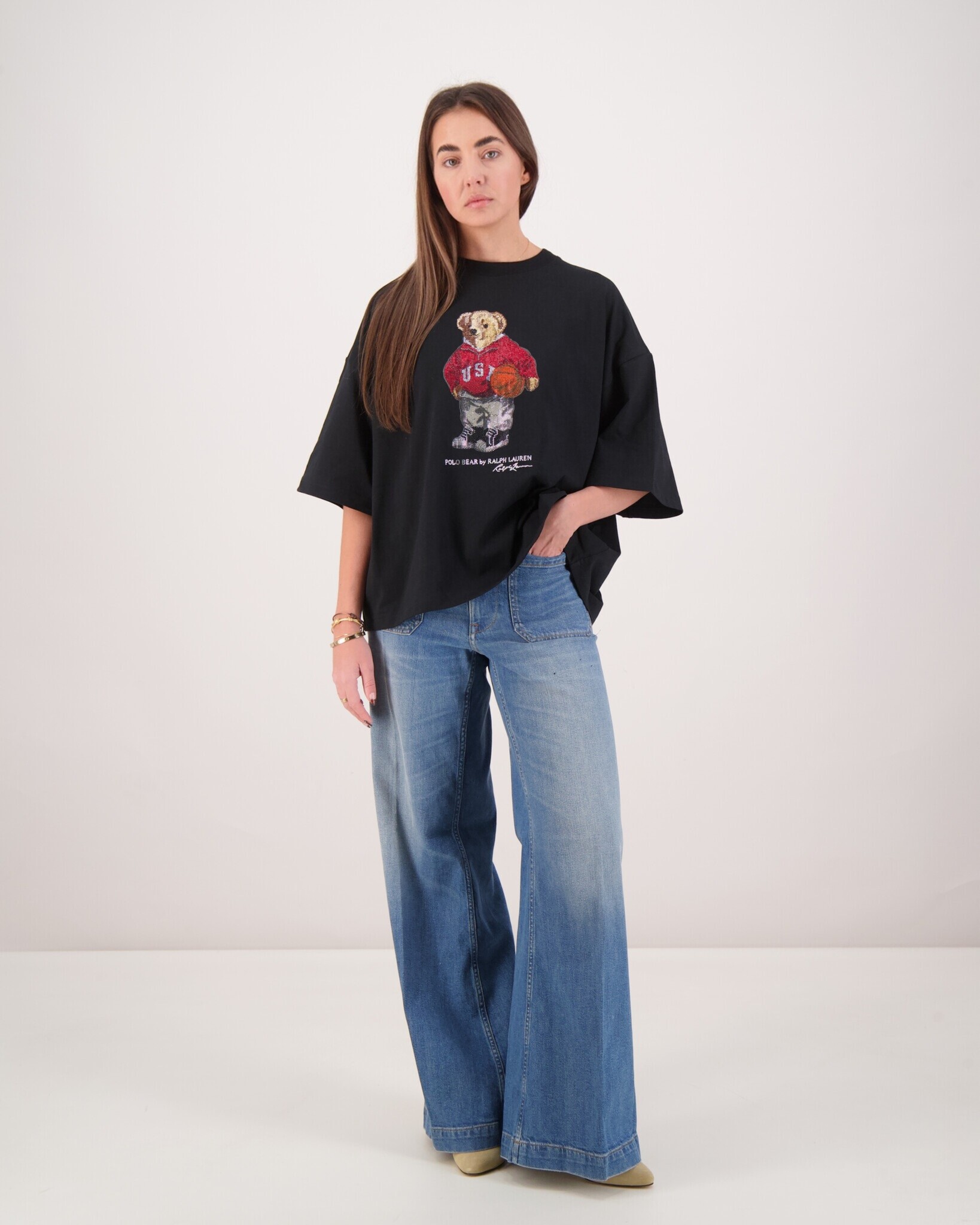 Het heeft een klassieke ronde hals (crewneck) en korte mouwen, met een rechte pasvorm die tot op de heup valt. Op de voorkant prijkt de iconische “Polo Bear”, afgewerkt met glinsterende rhinestones. Deze subtiele glitters geven het T‑shirt een luxe en opvallende uitstraling, waardoor het casual basisstuk een elegante en feestelijke touch krijgt.
