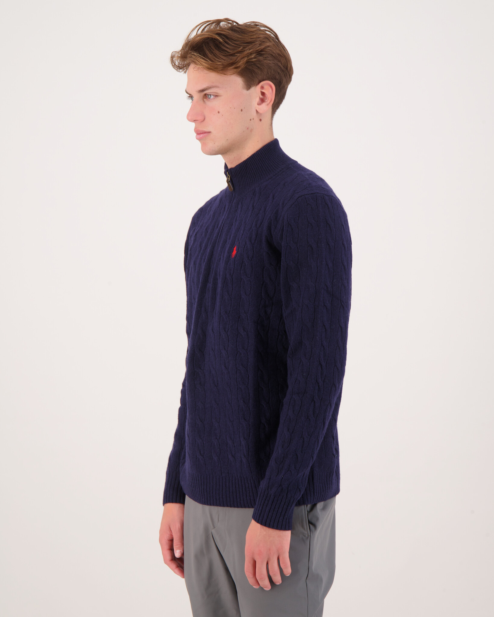 Donkerblauwe Long Sleeve Half zip Knitwear Pullover van het merk Polo Ralph Lauren. Op de linkerborst staat het bekende Polo Ralph Lauren logo.