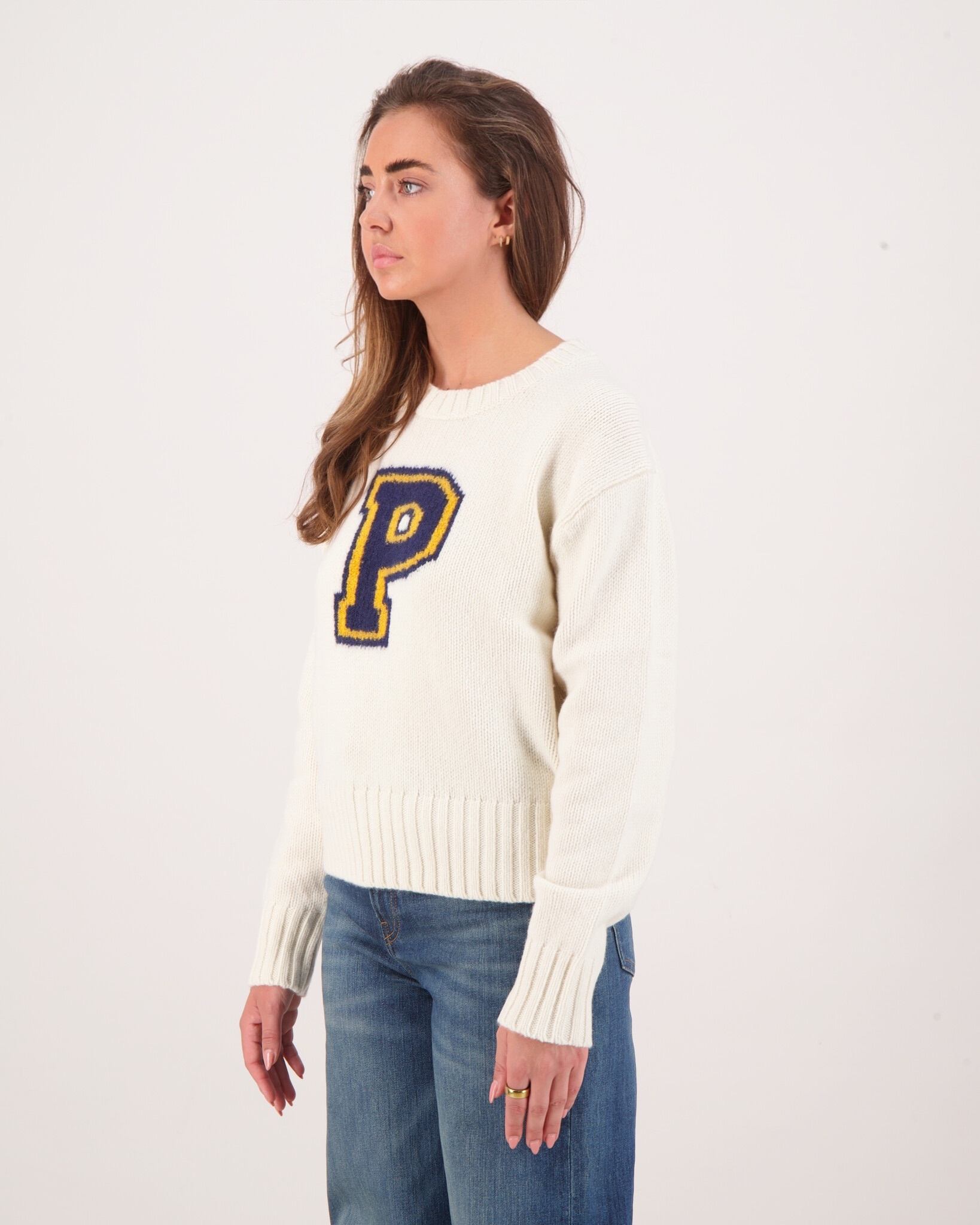 Pullover Sweater van het merk Polo Ralph Lauren. De Sweater heeft een ronde hals, lange mouwen en een grote P op de voorkant.