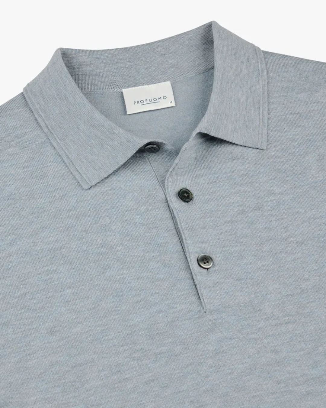 Blauwe Luxury Basic Polo van het merk Profuomo. De comfortabele luxury basic polo is gemaakt van een mix van tencel, katoen en zijde. Tencel is duurzaam, licht en comfortabel. De zijde geeft een luxueuze look & feel. Echte parelmoeren knopen.