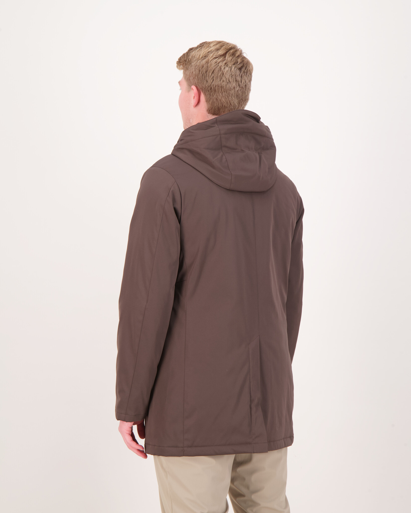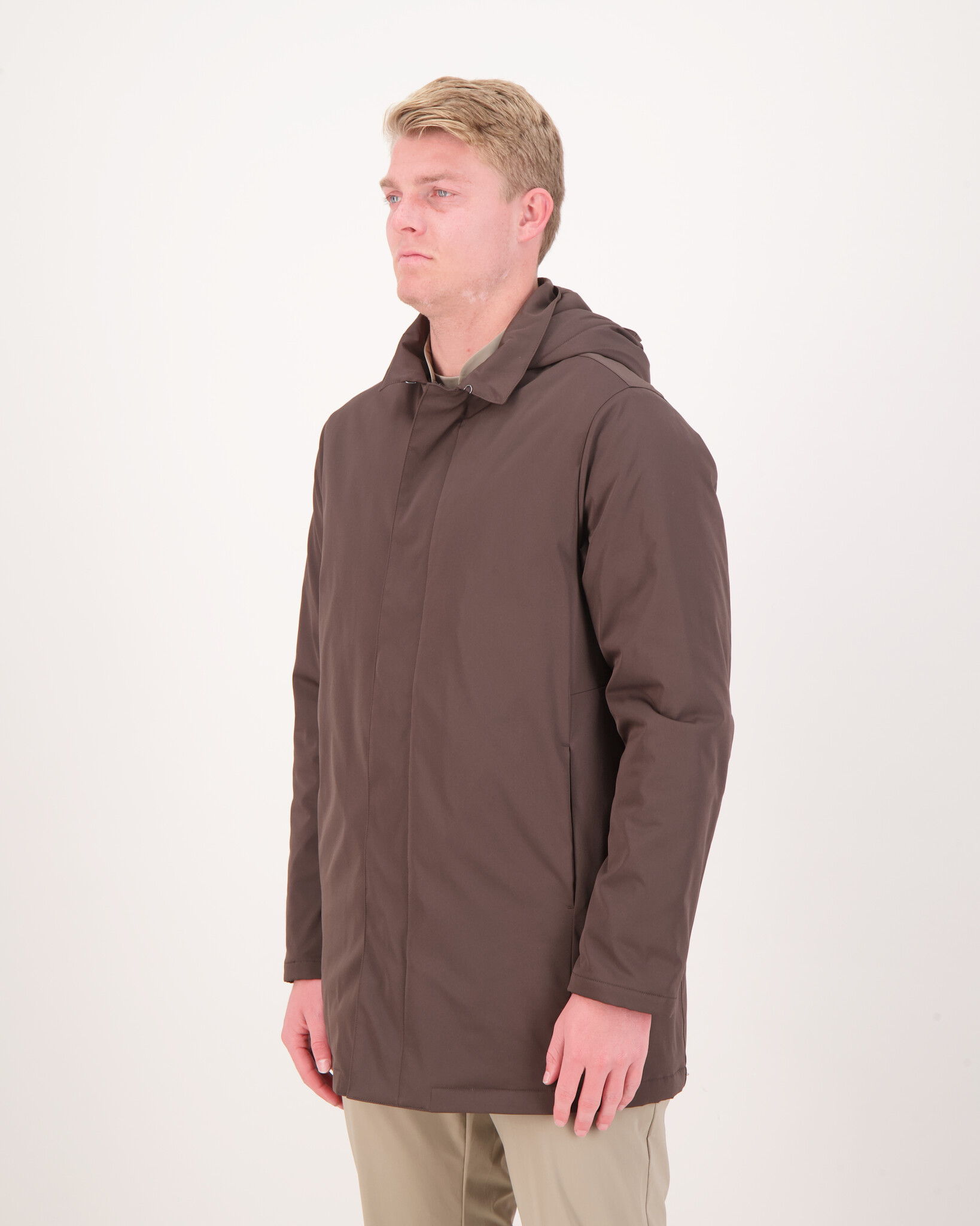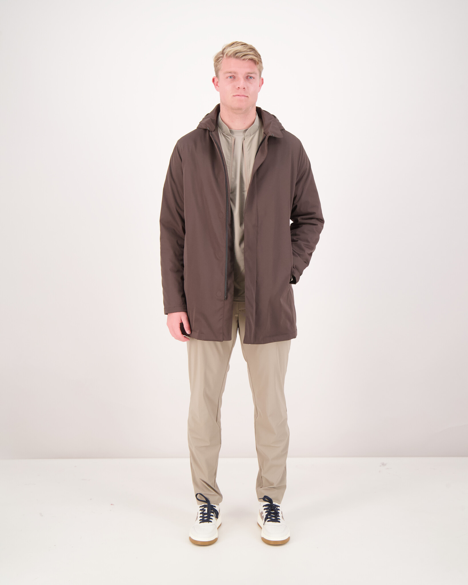 Een elegante, technische regenjas in licht beige met waterafstotende, winddichte stretchstof. De jas sluit met een rits én magnetische knopen voor extra bescherming en een strak design. De afneembare capuchon biedt flexibiliteit bij wisselvallig weer. De isolatie is door middel van gerecycled PET-materiaal, waardoor de jas duurzaam is zonder zwaar te zijn. De pasvorm is normaal en combineert moeiteloos met zowel casual als zakelijke outfits. Geschikt voor dagelijks gebruik in diverse weersomstandigheden.