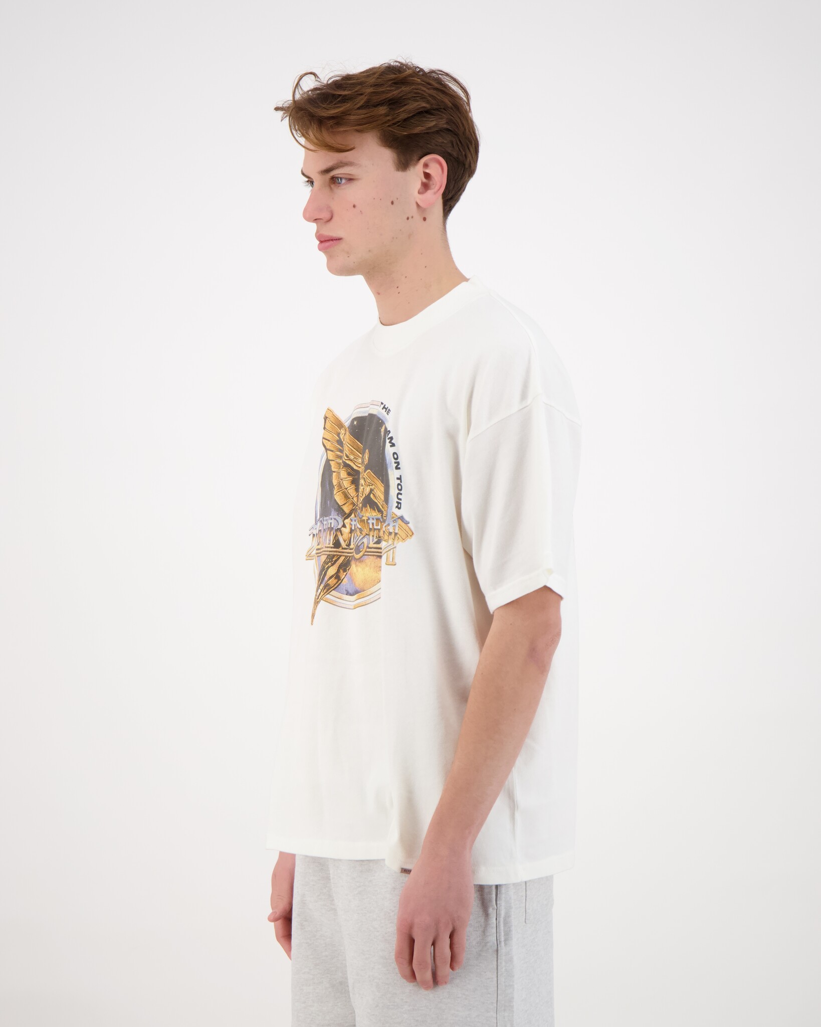 Het witte “Golden Tour” T-shirt van het merk Represent is gemaakt van 100% katoen, wat zorgt voor een zachte en comfortabele draagervaring. Het heeft een ronde hals en korte mouwen, en de pasvorm is relaxed met schoudernaden die iets naar beneden vallen, wat bijdraagt aan een casual uitstraling. Het ontwerp geeft een vintage tour-look, alsof het een gedragen concertshirt is,Met een grote print aan de voorkant. en aan de onderkant zit een klein metalen merkje dat een luxe gevoel toevoegt.