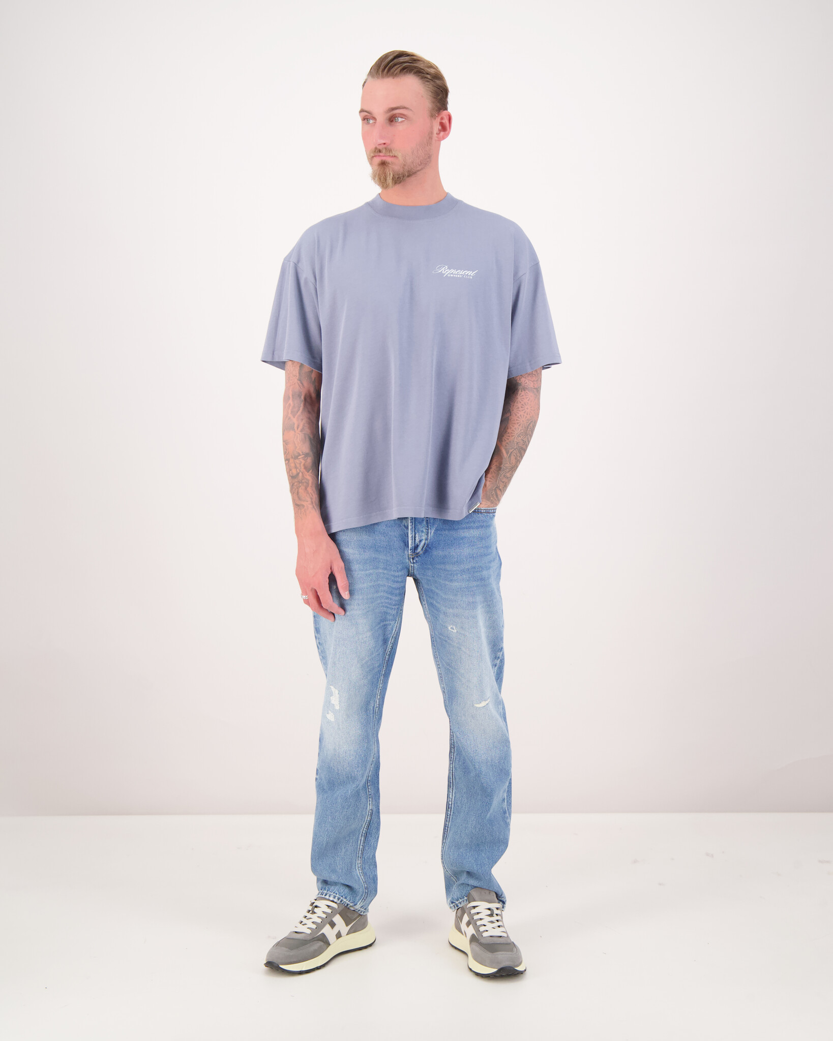 Blauwe Owners Club T-shirt van het merk Represent. Maak kennis met de nieuwste evolutie van het Represent Owners' Club T-shirt, een oversized T-shirt gemaakt van luxe middelzwaar katoen. Dit t-shirt heeft een geribde crewneck kraag en een Represent metalen bar aan de zoom. Met het logo van Represent op de voorkant in het klein, en op de achterkant in het groot.