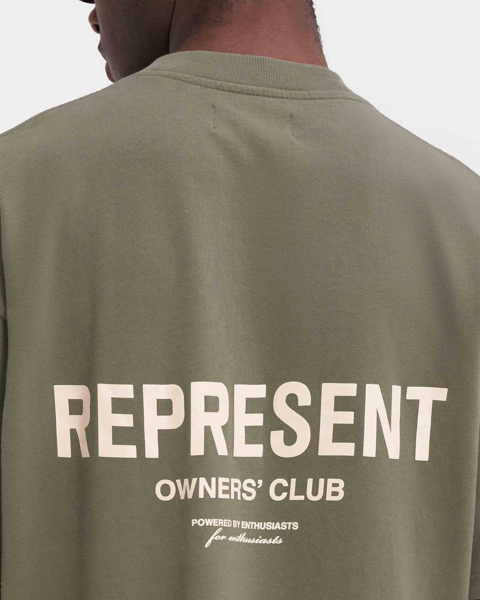 Groene Owners Club T-shirt van het merk Represent. Dit shirt heeft een ronde hals en korte mouwen en heeft een oversized fit.