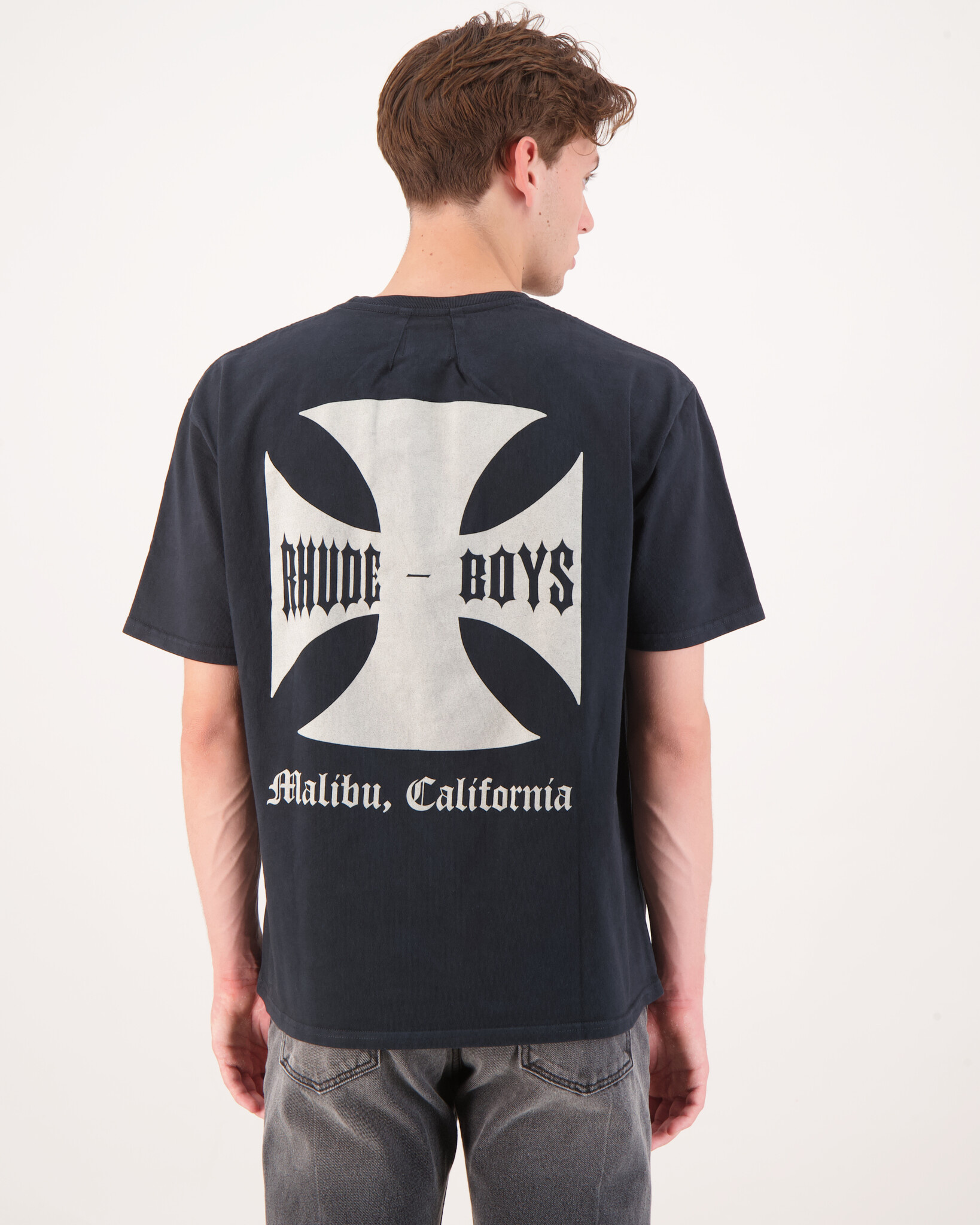 Zwart 'Boys T-Shirt' van het merk Rhude. De t-shirt heeft een print op de voorzijde, achterzijde, korte mouwen en een ronde hals