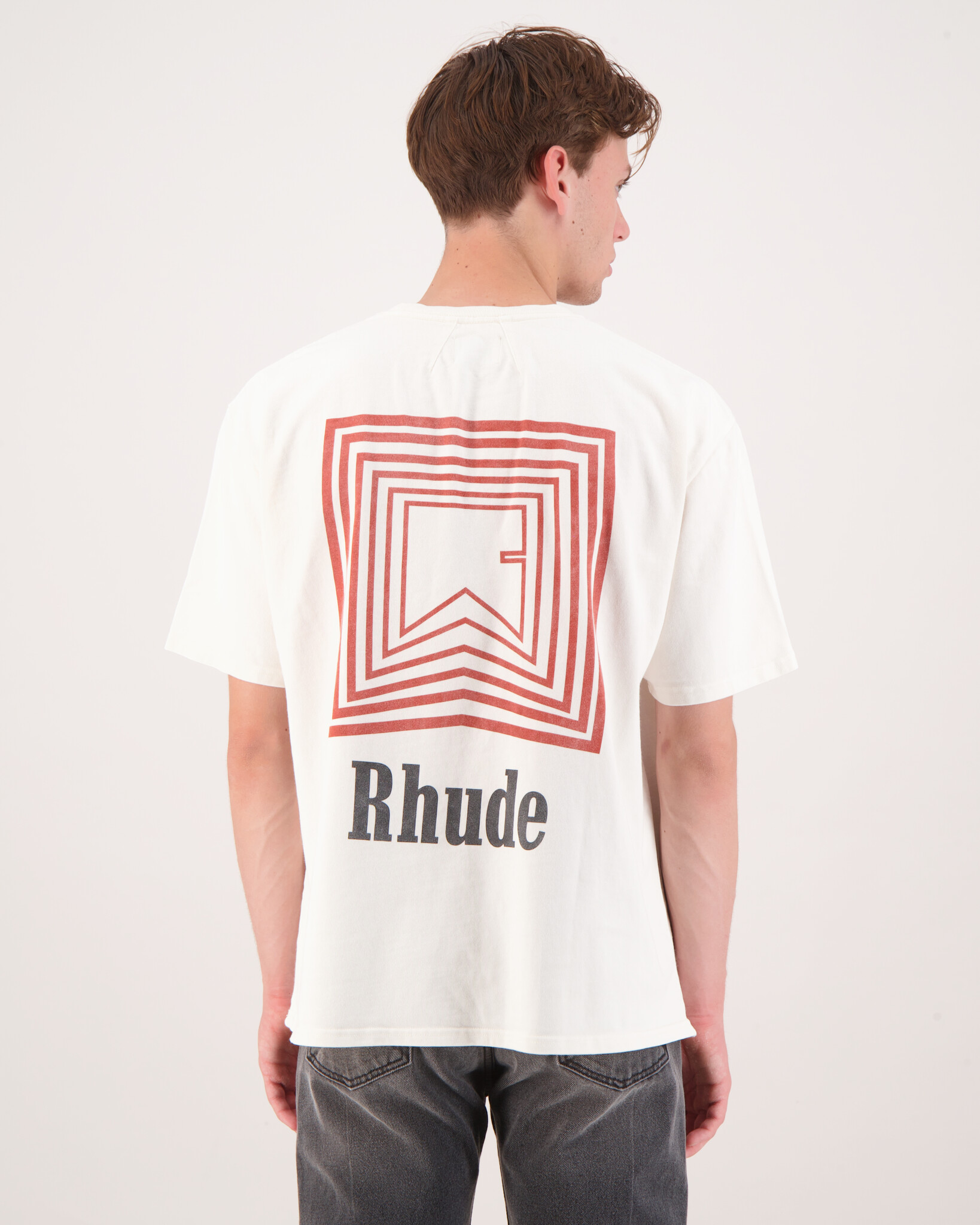Witte 'Chevron Logo Repeat T-Shirt' van het merk Rhude. Het t-shirt heeft een print op de voorzijde, achterzijde, korte mouwen en een ronde hals
