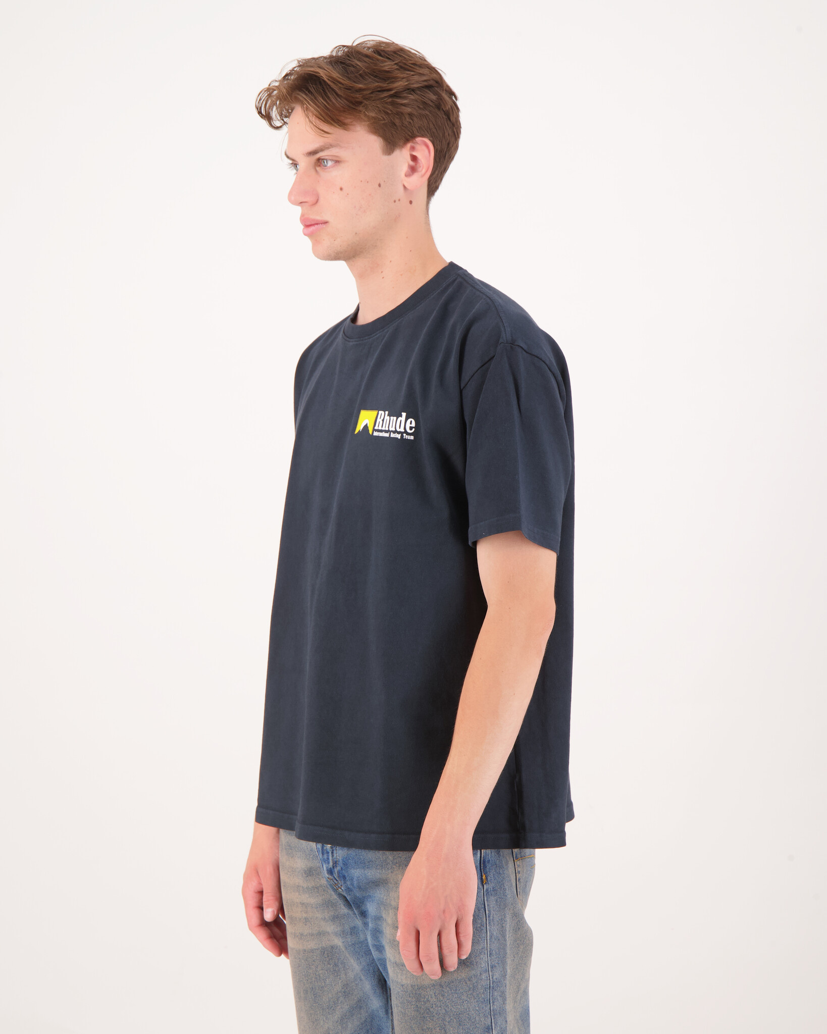 Zwart 'International Racing Logo T-Shirt' van het merk Rhude. De t-shirt heeft een print op de voorzijde, achterzijde, korte mouwen en een ronde hals