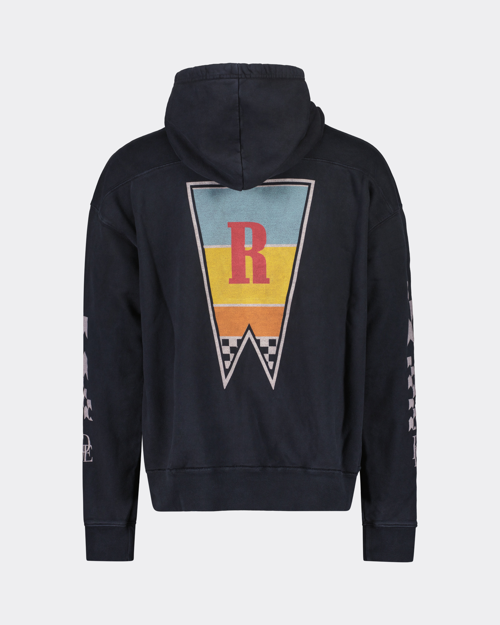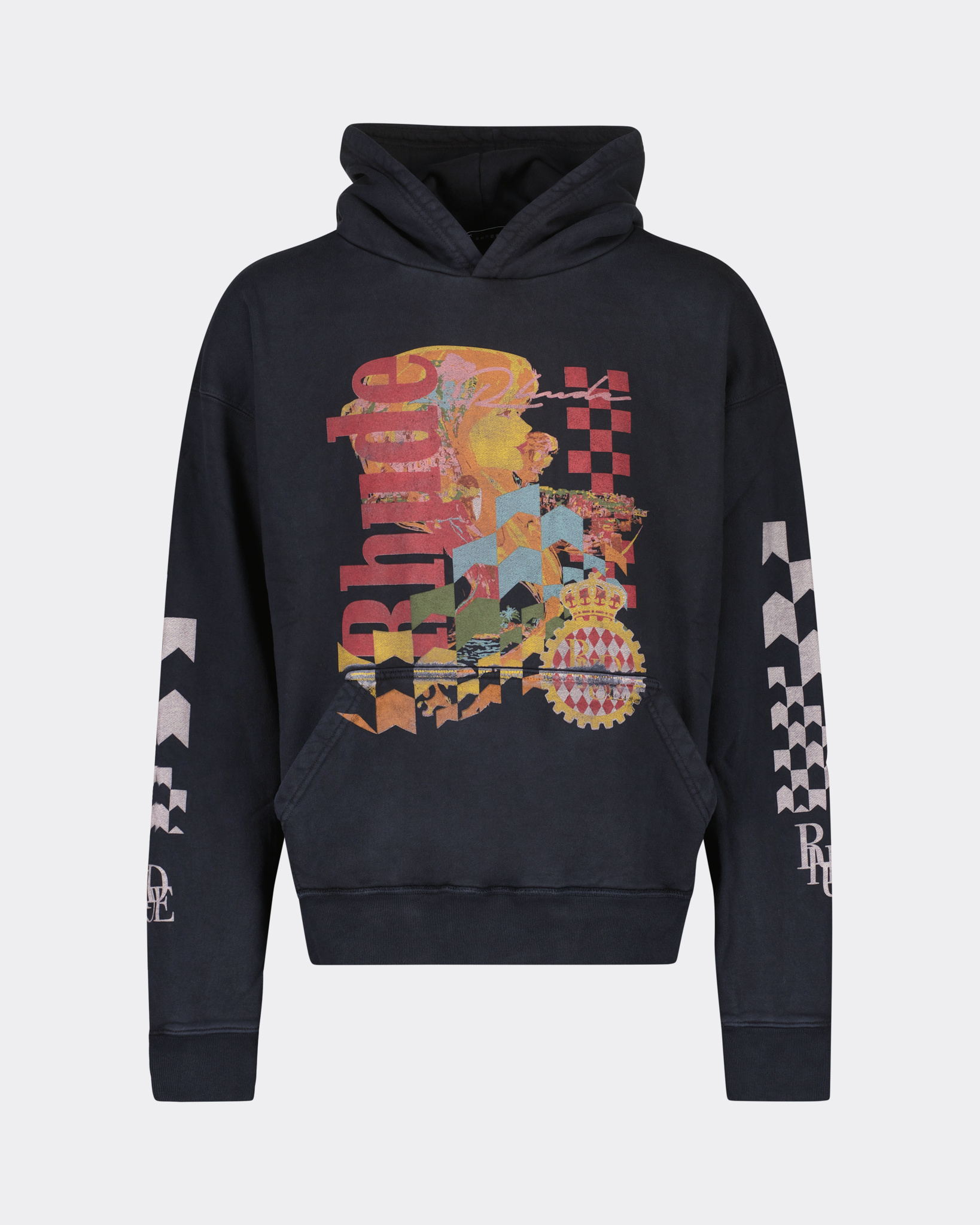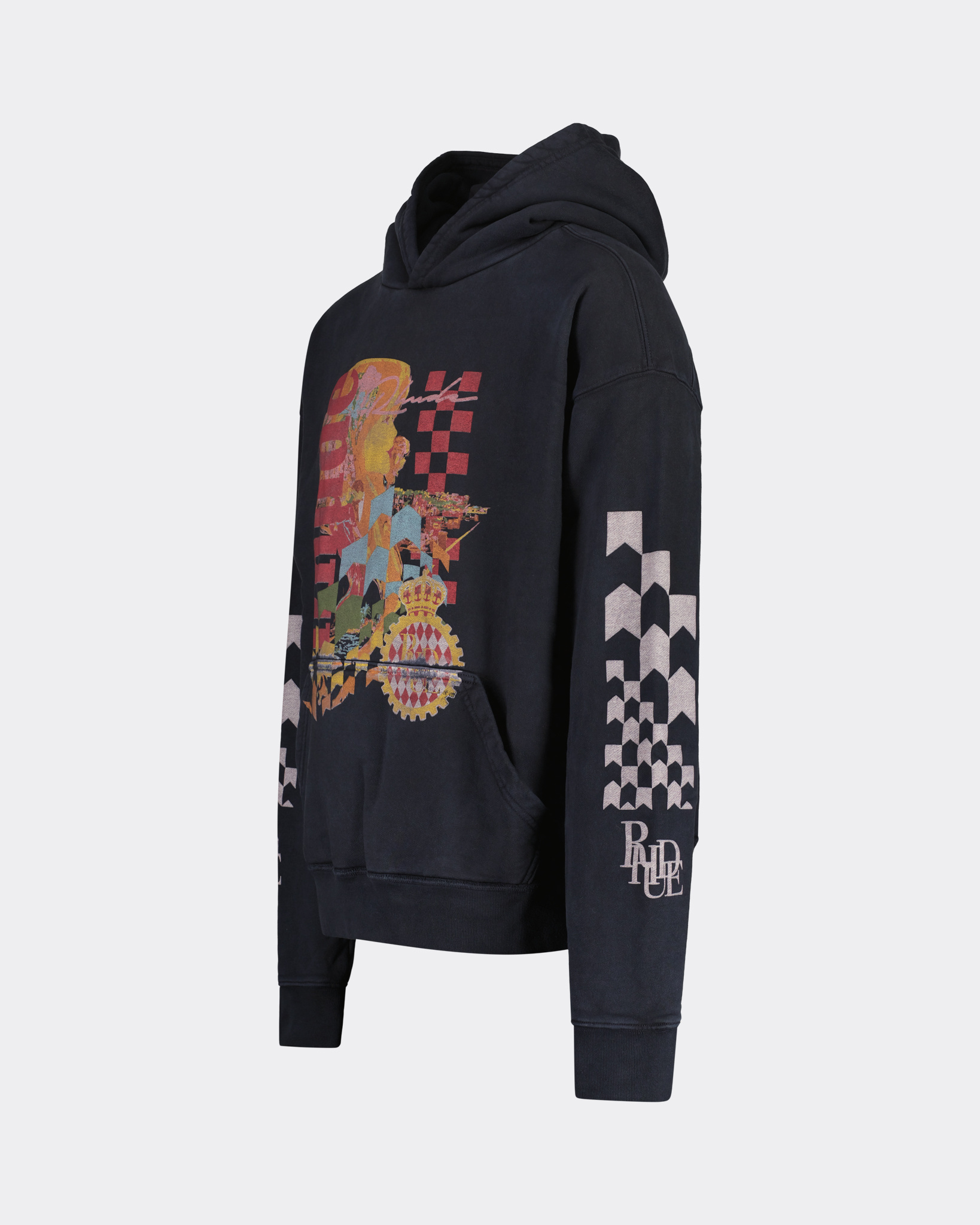 Zwarte Joyride Hoodie van het merk Rhude. De hoodie heeft een print op de voorzijde en op de armen met details van een Joyride gebouw.