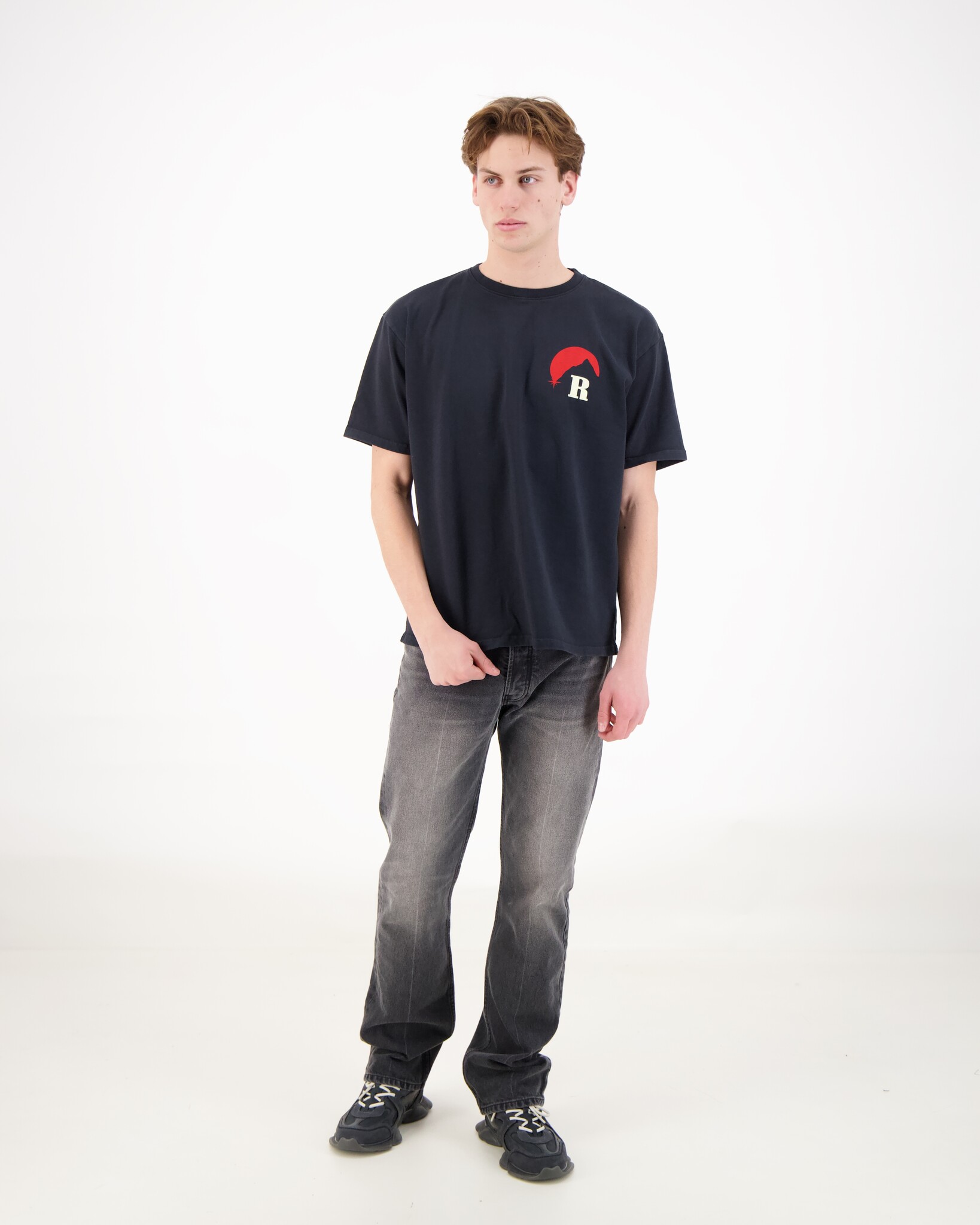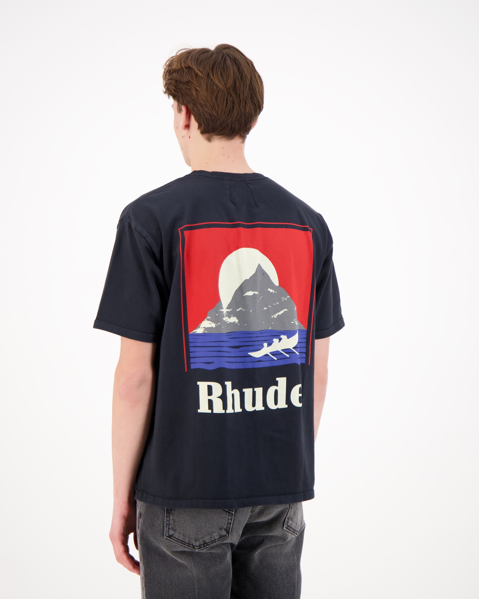 Zwarte Moonlight Regatta T-Shirt van het merk Rhude. Dit T-Shirtje heeft een print voorop en een Moonlight back print met de kleuren Rood, Beige en Grijs. Het staat bekend om een combinatie van high-end kwaliteit, relaxed silhouet en opvallende grafische prints. Deze designs zijn bedoeld om het T-shirt niet alleen comfortabel te maken, maar ook een statement-piece binnen je outfit.