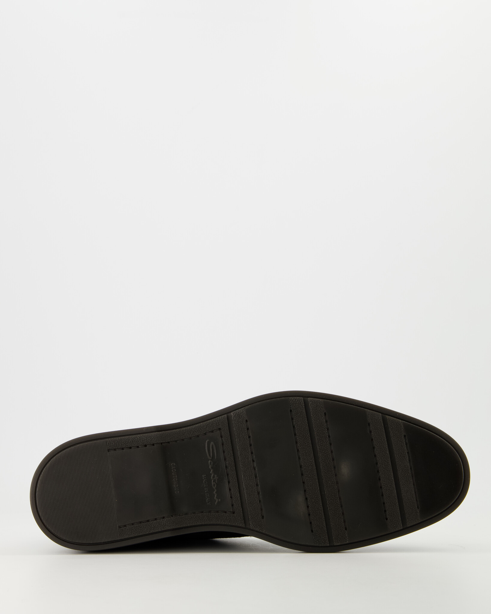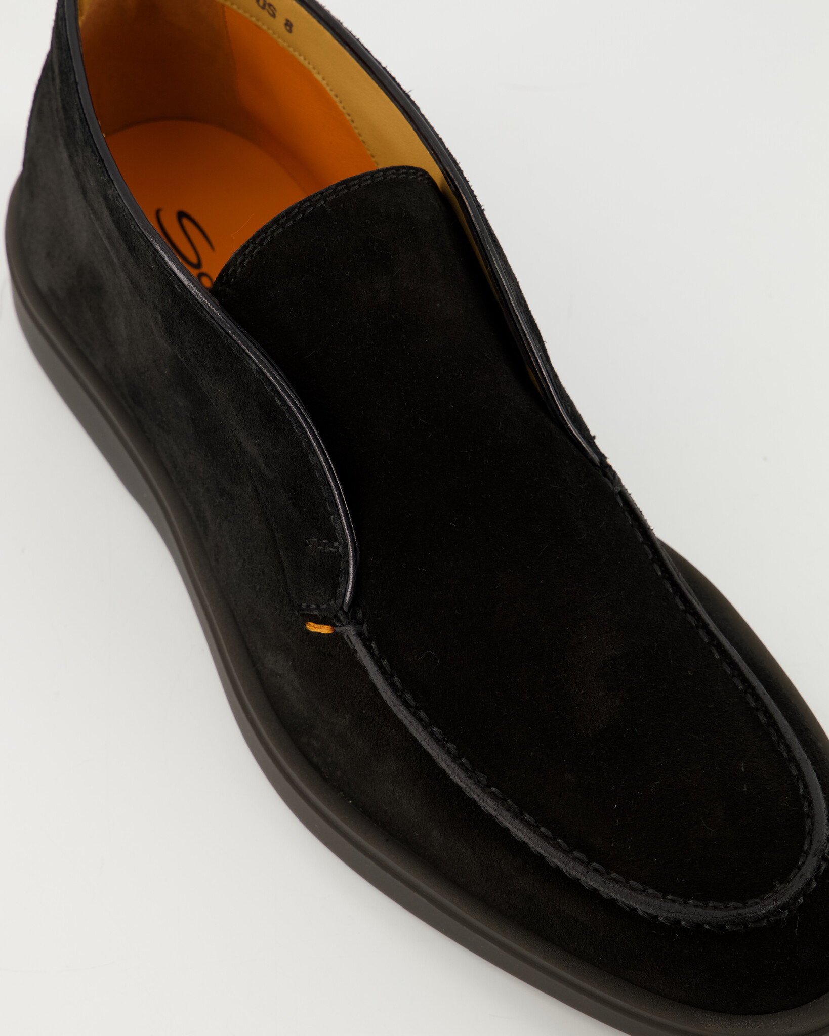 Zwarte Suede Desert Boots van het merk Santoni. De instappers zijn van suede, afgewerkt met leer en hebben een rubberen zool.