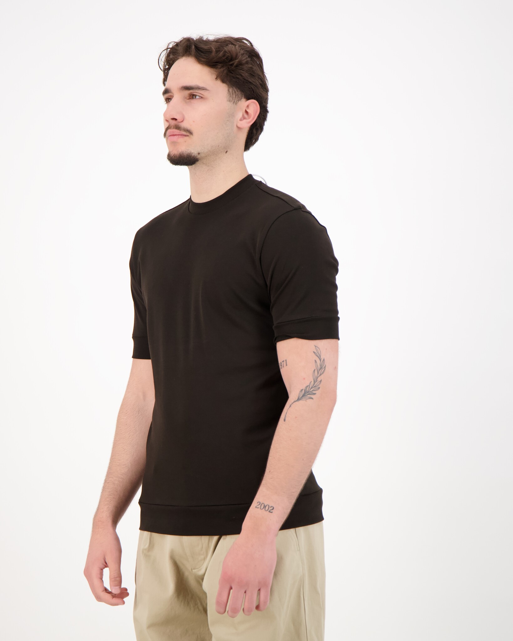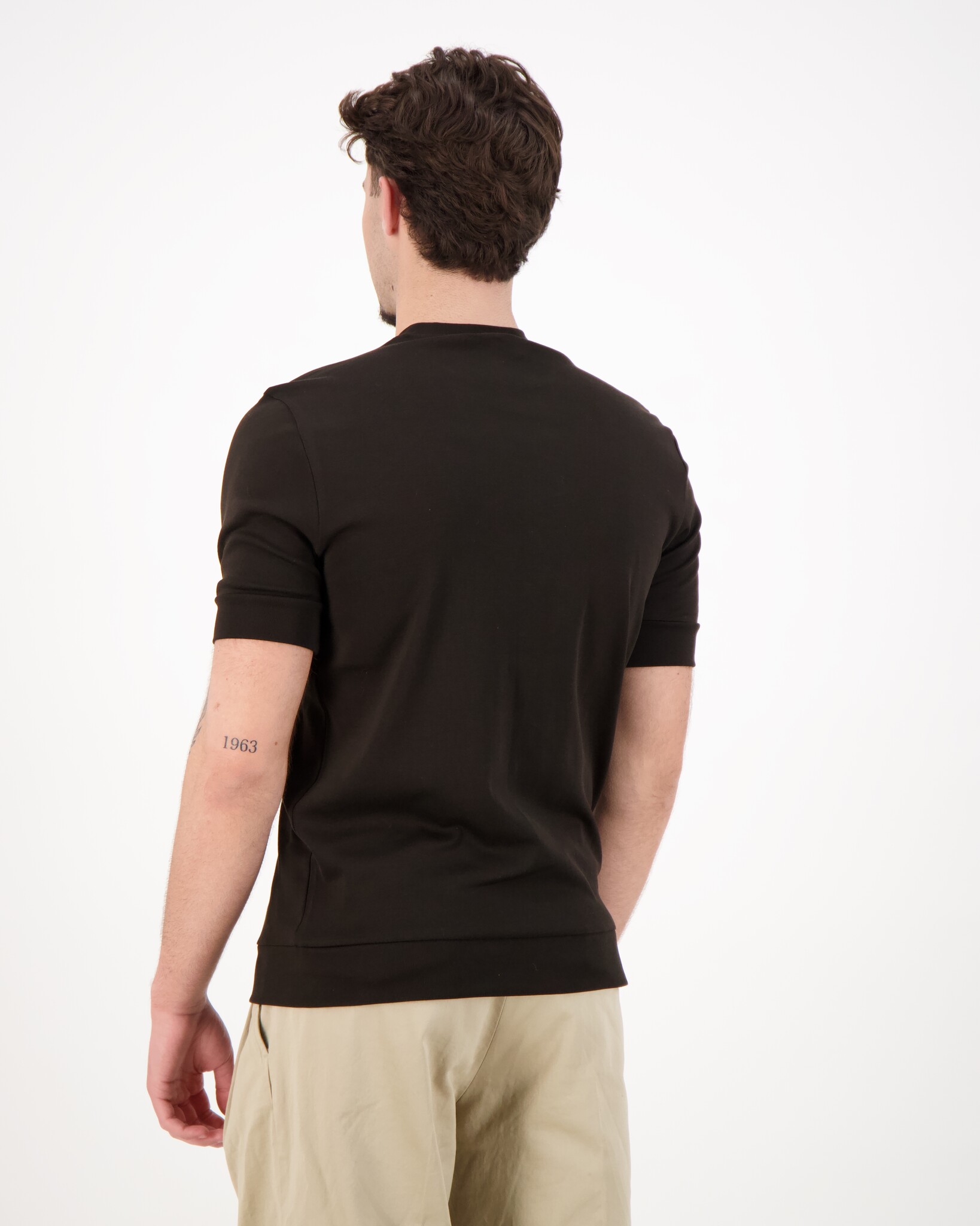 Chocolade Eli B FR 30 T-shirt van het merk Stefan Brandt. De combinatie van kleurstoffen en stoffen van de hoogste kwaliteit* met een 15-traps in-house prefit behandeling garandeert een menselijk-ecologisch geoptimaliseerde gebreide stof en een aantal werkelijk unieke eigenschappen. In het proces met water, stoom en warmte, in een (quasi-) gesloten systeem bij ongeveer 130°C, worden overtollige pigmenten en andere verontreinigingen uit de stof verwijderd (zonder chemische toevoegingen). De stof blijft fris, zelfs na langdurig dragen en transpireren, omdat de overdracht van stoffen van de stof naar de huid of een afbraakreactie met lichaamstranspiratie wordt voorkomen. De producten zijn daarom ideaal voor mensen met een gevoelige huid of mensen met allergieën.