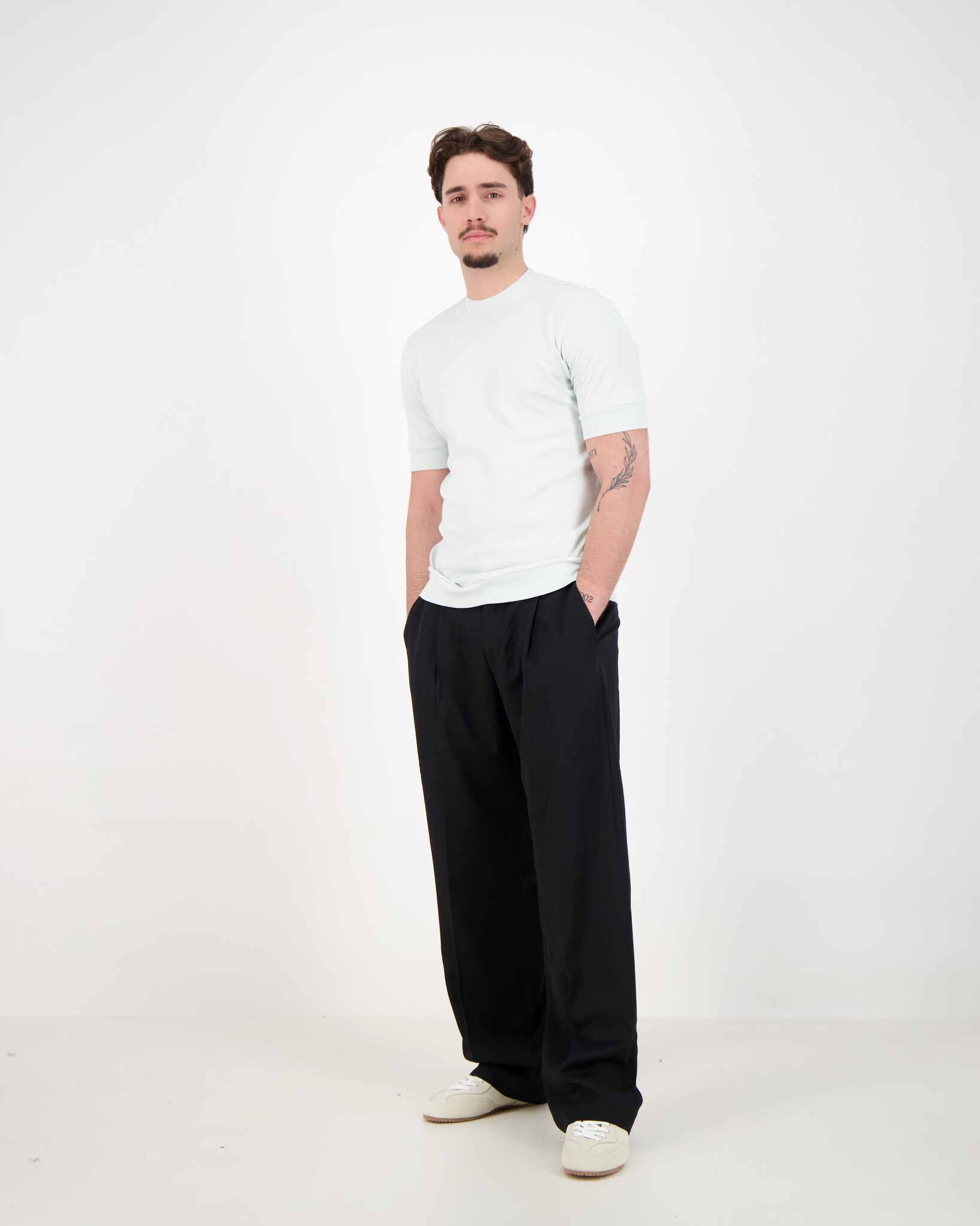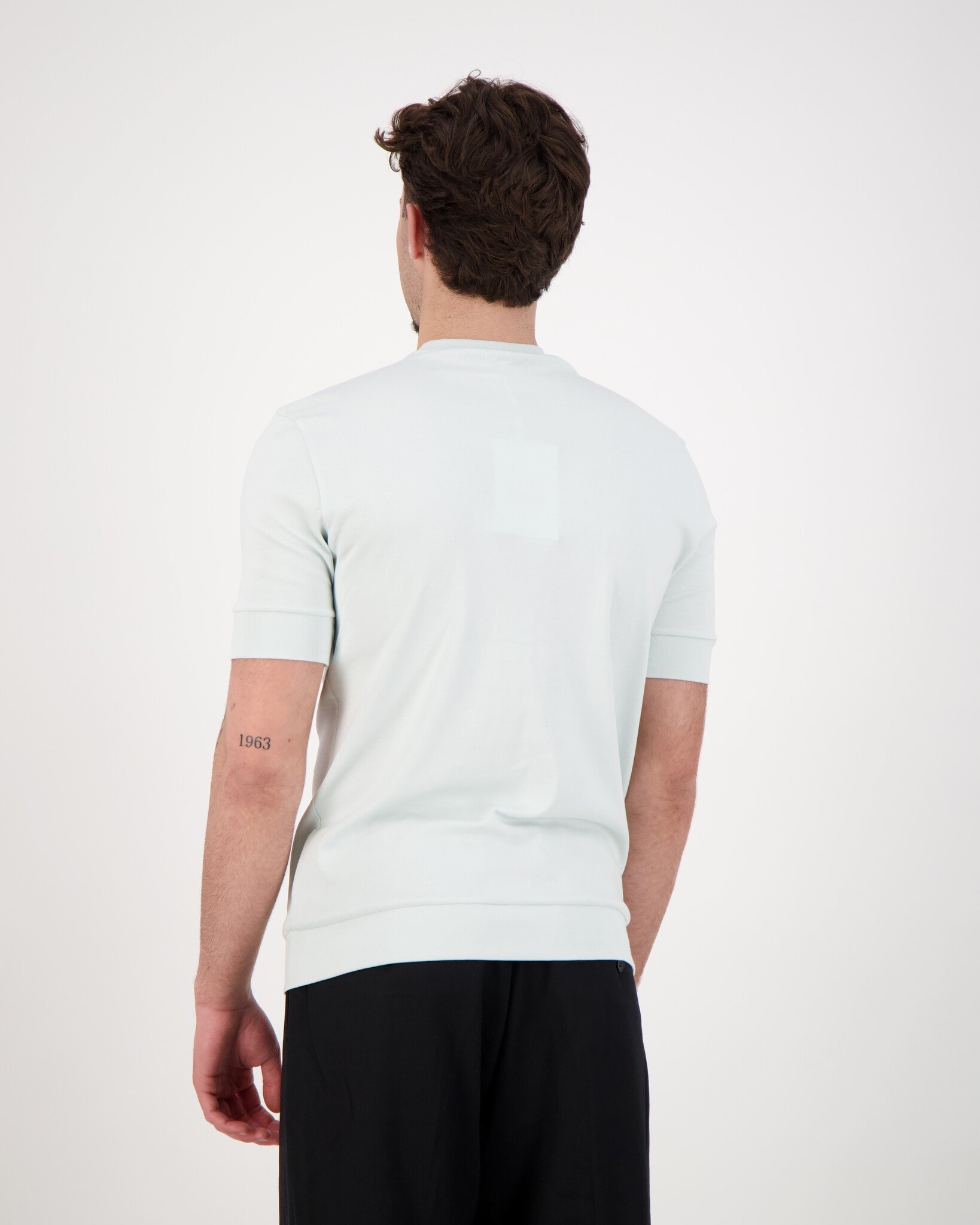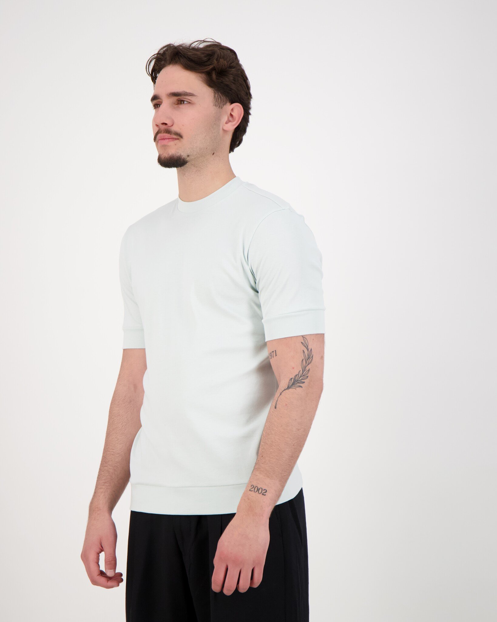 Mint Eli B FR 30 T-shirt van het merk Stefan Brandt. De combinatie van kleurstoffen en stoffen van de hoogste kwaliteit* met een 15-traps in-house prefit behandeling garandeert een menselijk-ecologisch geoptimaliseerde gebreide stof en een aantal werkelijk unieke eigenschappen. In het proces met water, stoom en warmte, in een (quasi-) gesloten systeem bij ongeveer 130°C, worden overtollige pigmenten en andere verontreinigingen uit de stof verwijderd (zonder chemische toevoegingen). De stof blijft fris, zelfs na langdurig dragen en transpireren, omdat de overdracht van stoffen van de stof naar de huid of een afbraakreactie met lichaamstranspiratie wordt voorkomen. De producten zijn daarom ideaal voor mensen met een gevoelige huid of mensen met allergieën.