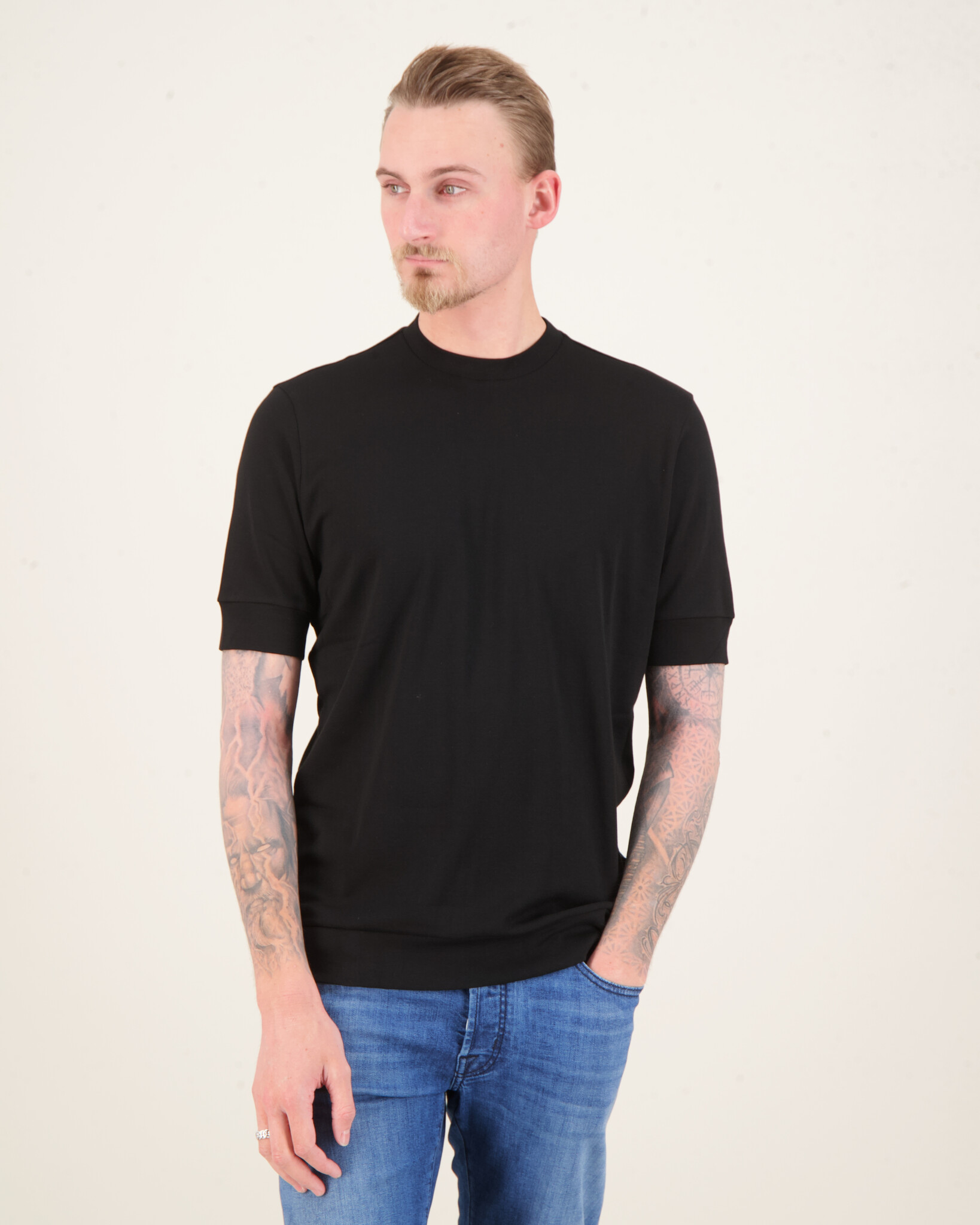 Zwart Eli Super 30 T-Shirt van het merk Stefan Brandt. De combinatie van kleurstoffen en stoffen van de hoogste kwaliteit* met een 15-traps in-house prefit behandeling garandeert een menselijk-ecologisch geoptimaliseerde gebreide stof en een aantal werkelijk unieke eigenschappen. In het proces met water, stoom en warmte, in een (quasi-) gesloten systeem bij ongeveer 130°C, worden overtollige pigmenten en andere verontreinigingen uit de stof verwijderd (zonder chemische toevoegingen). De stof blijft fris, zelfs na langdurig dragen en transpireren, omdat de overdracht van stoffen van de stof naar de huid of een afbraakreactie met lichaamstranspiratie wordt voorkomen. De producten zijn daarom ideaal voor mensen met een gevoelige huid of mensen met allergieën.