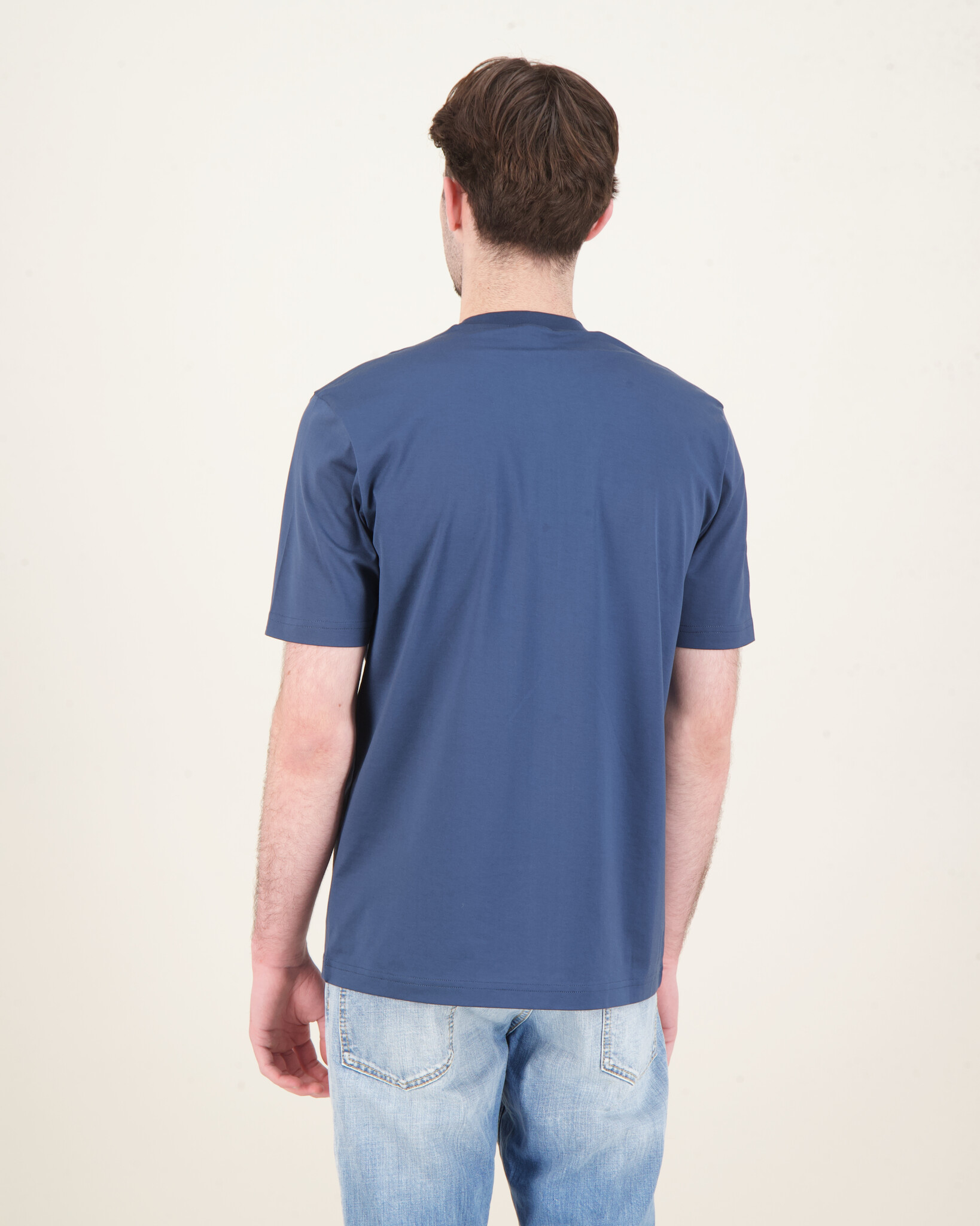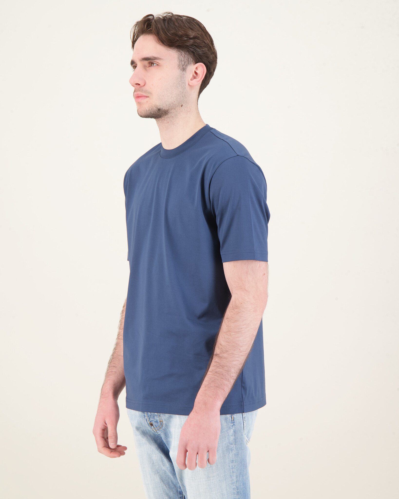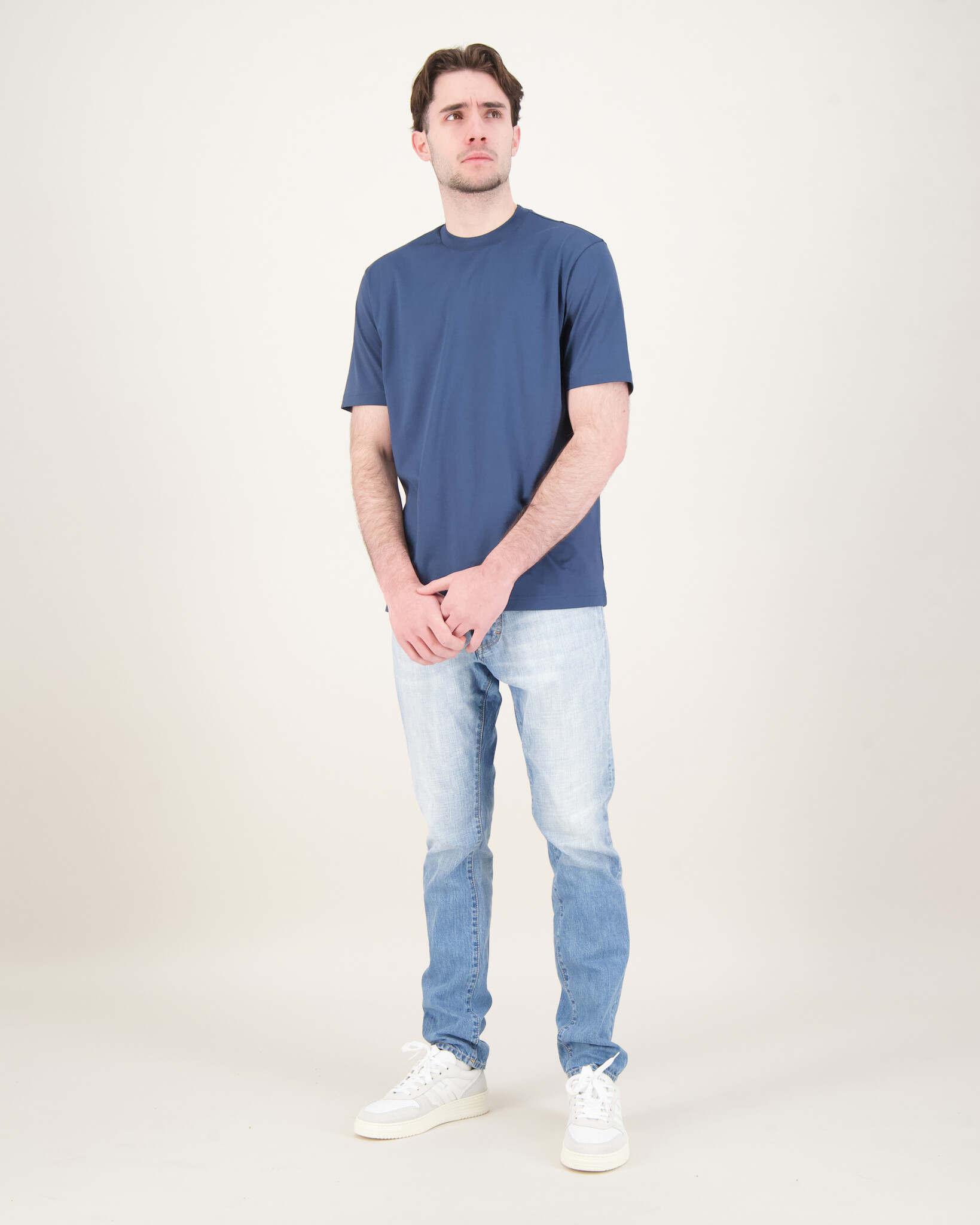 Blauw Eli Super 60 T-Shirt van het merk Stefan Brandt. De combinatie van kleurstoffen en stoffen van de hoogste kwaliteit* met een 15-traps in-house prefit behandeling garandeert een menselijk-ecologisch geoptimaliseerde gebreide stof en een aantal werkelijk unieke eigenschappen. In het proces met water, stoom en warmte, in een (quasi-) gesloten systeem bij ongeveer 130°C, worden overtollige pigmenten en andere verontreinigingen uit de stof verwijderd (zonder chemische toevoegingen). De stof blijft fris, zelfs na langdurig dragen en transpireren, omdat de overdracht van stoffen van de stof naar de huid of een afbraakreactie met lichaamstranspiratie wordt voorkomen. De producten zijn daarom ideaal voor mensen met een gevoelige huid of mensen met allergieën.