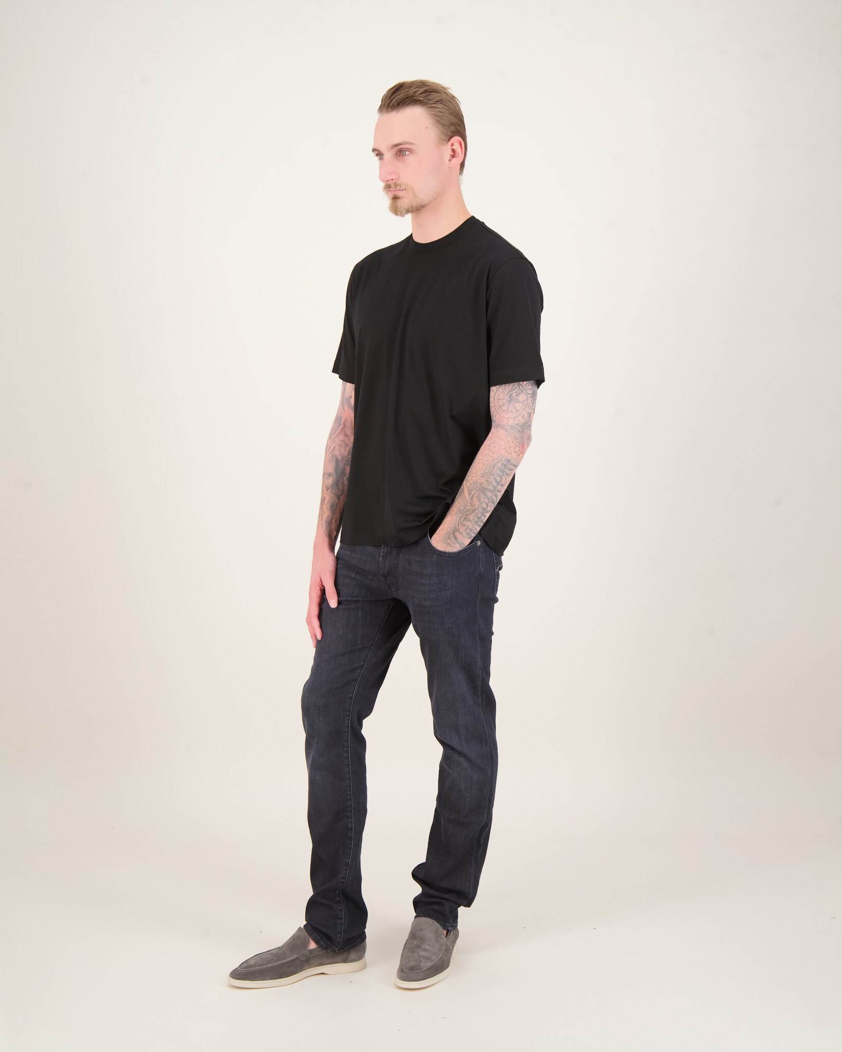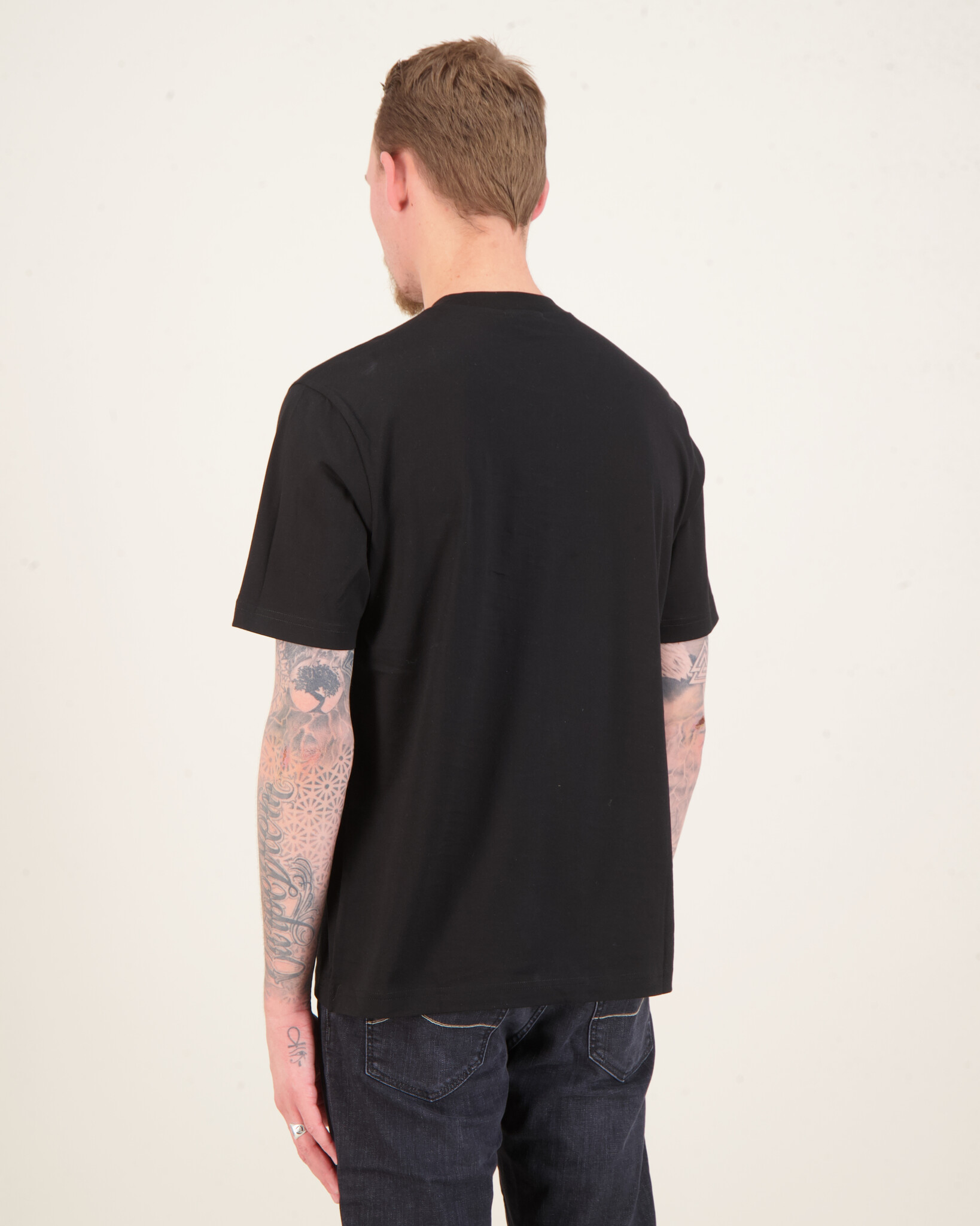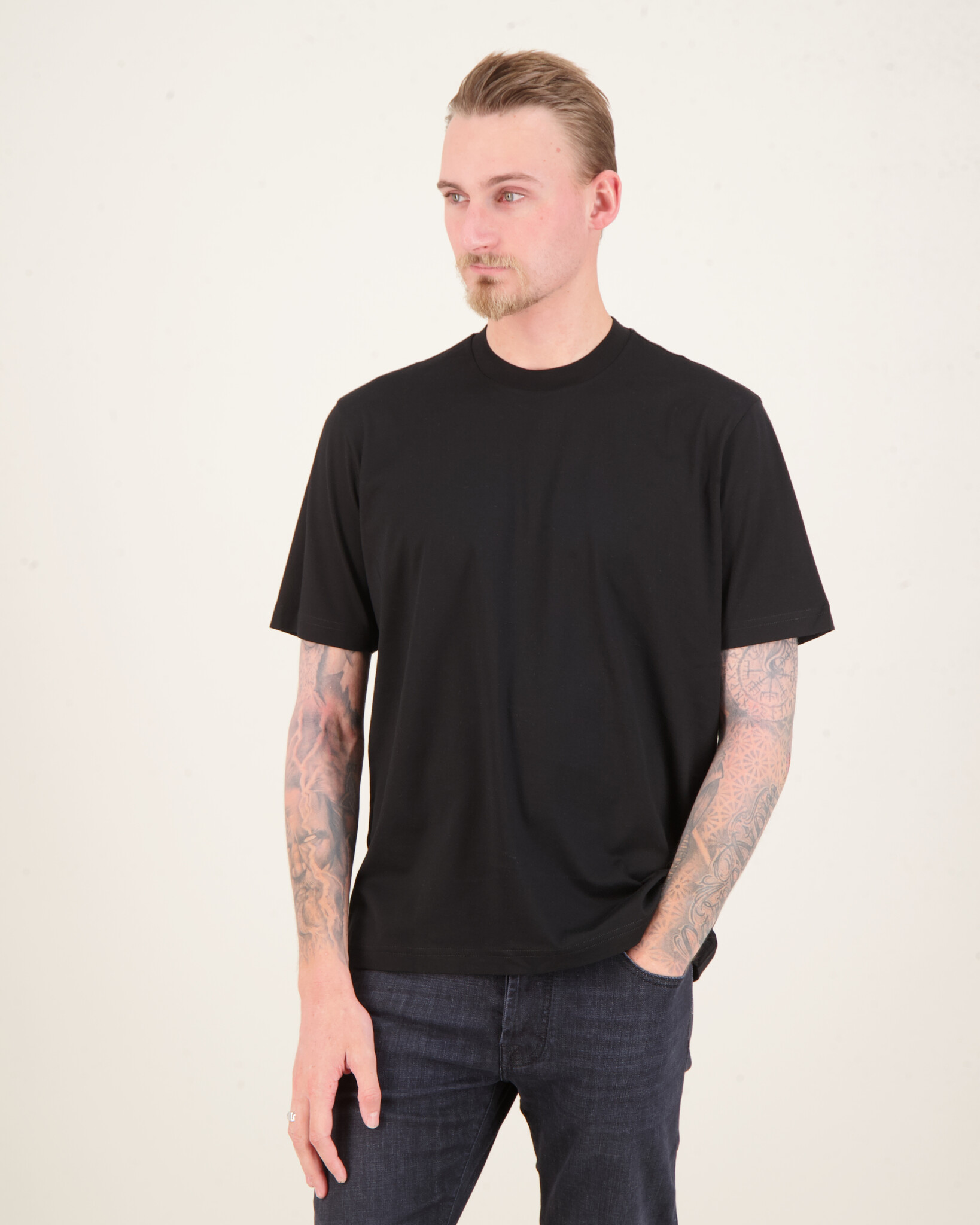 Zwarte Eli Super 60 T-Shirt van het merk Stefan Brandt. De combinatie van kleurstoffen en stoffen van de hoogste kwaliteit* met een 15-traps in-house prefit behandeling garandeert een menselijk-ecologisch geoptimaliseerde gebreide stof en een aantal werkelijk unieke eigenschappen. In het proces met water, stoom en warmte, in een (quasi-) gesloten systeem bij ongeveer 130°C, worden overtollige pigmenten en andere verontreinigingen uit de stof verwijderd (zonder chemische toevoegingen). De stof blijft fris, zelfs na langdurig dragen en transpireren, omdat de overdracht van stoffen van de stof naar de huid of een afbraakreactie met lichaamstranspiratie wordt voorkomen. De producten zijn daarom ideaal voor mensen met een gevoelige huid of mensen met allergieën.
