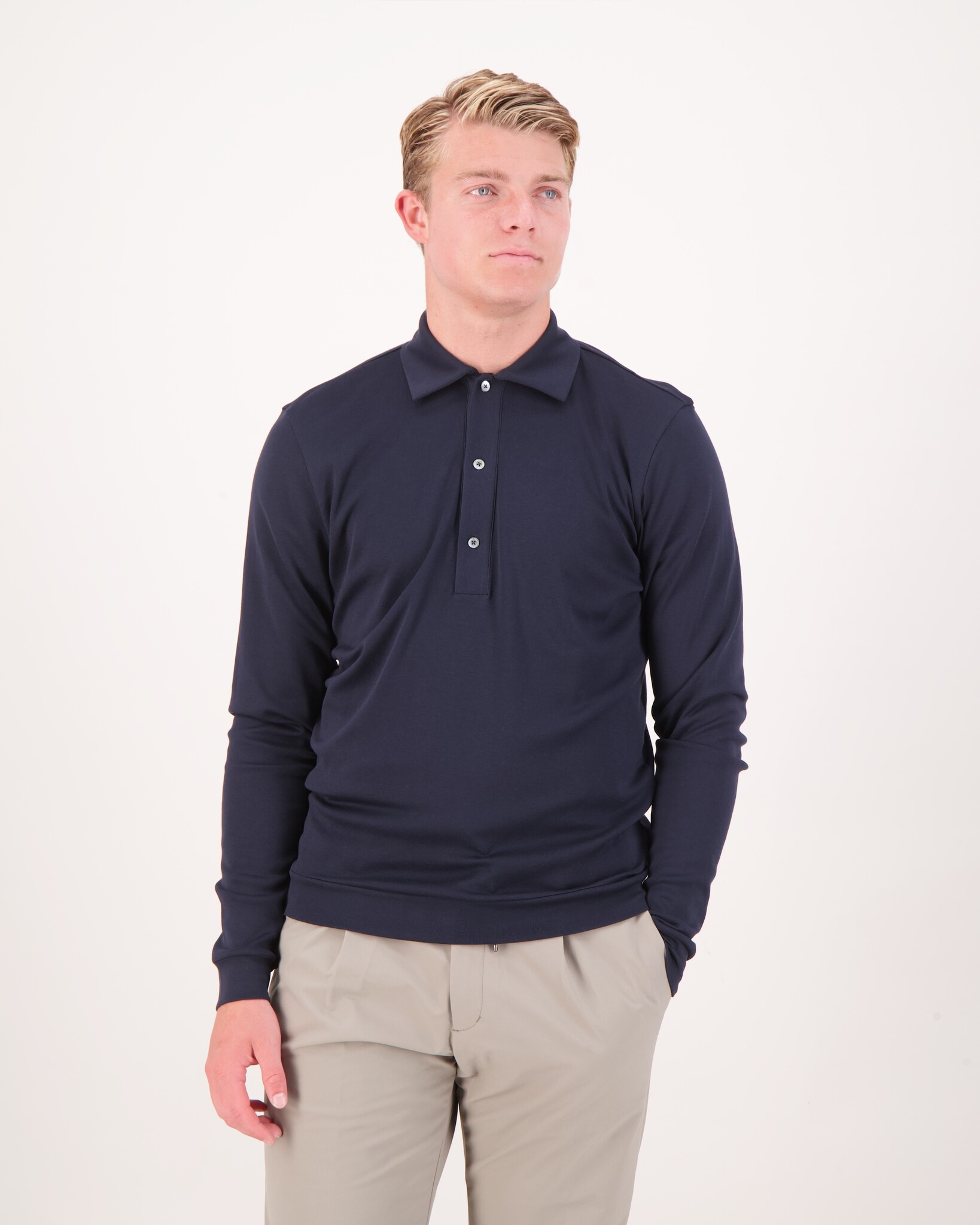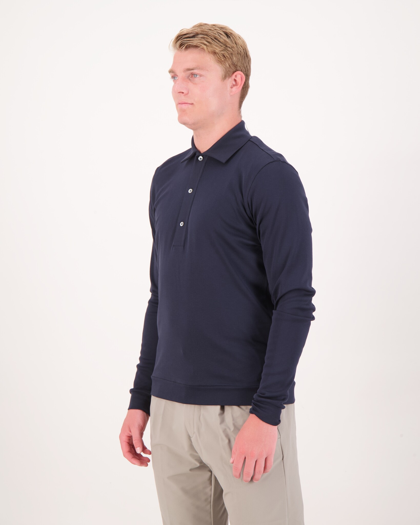 Een verfijnde polo met lange mouwen, vervaardigd van 100% katoen. De subtiele metallic look en parelmoer knoopsluiting geven een hoogwaardige uitstraling, terwijl de natuurlijke stretch zorgt voor een comfortabele fit. Regular fit — perfect voor veelzijdig, stijlvol gebruik.