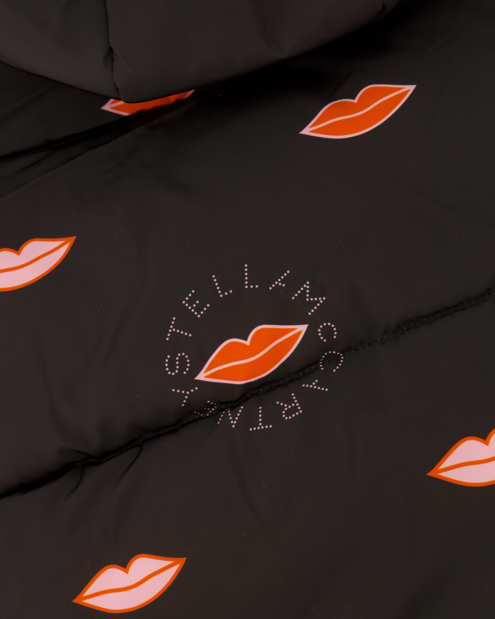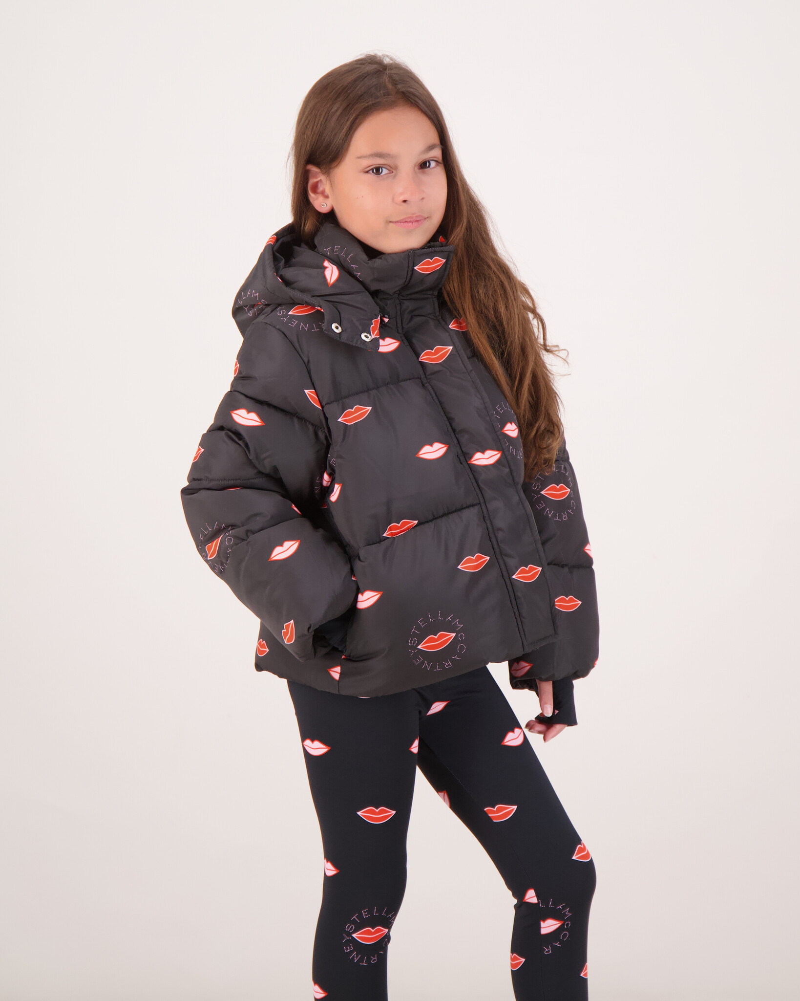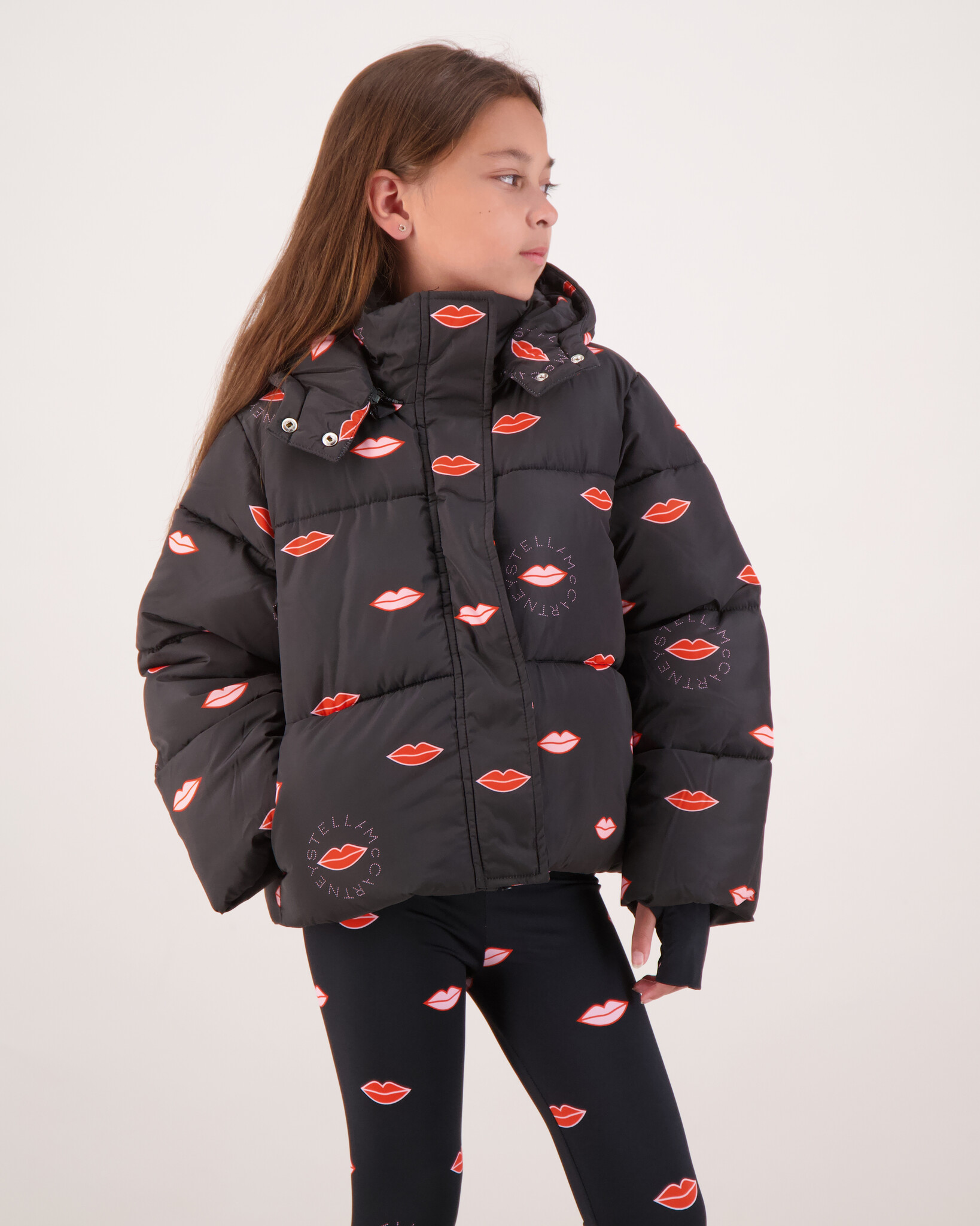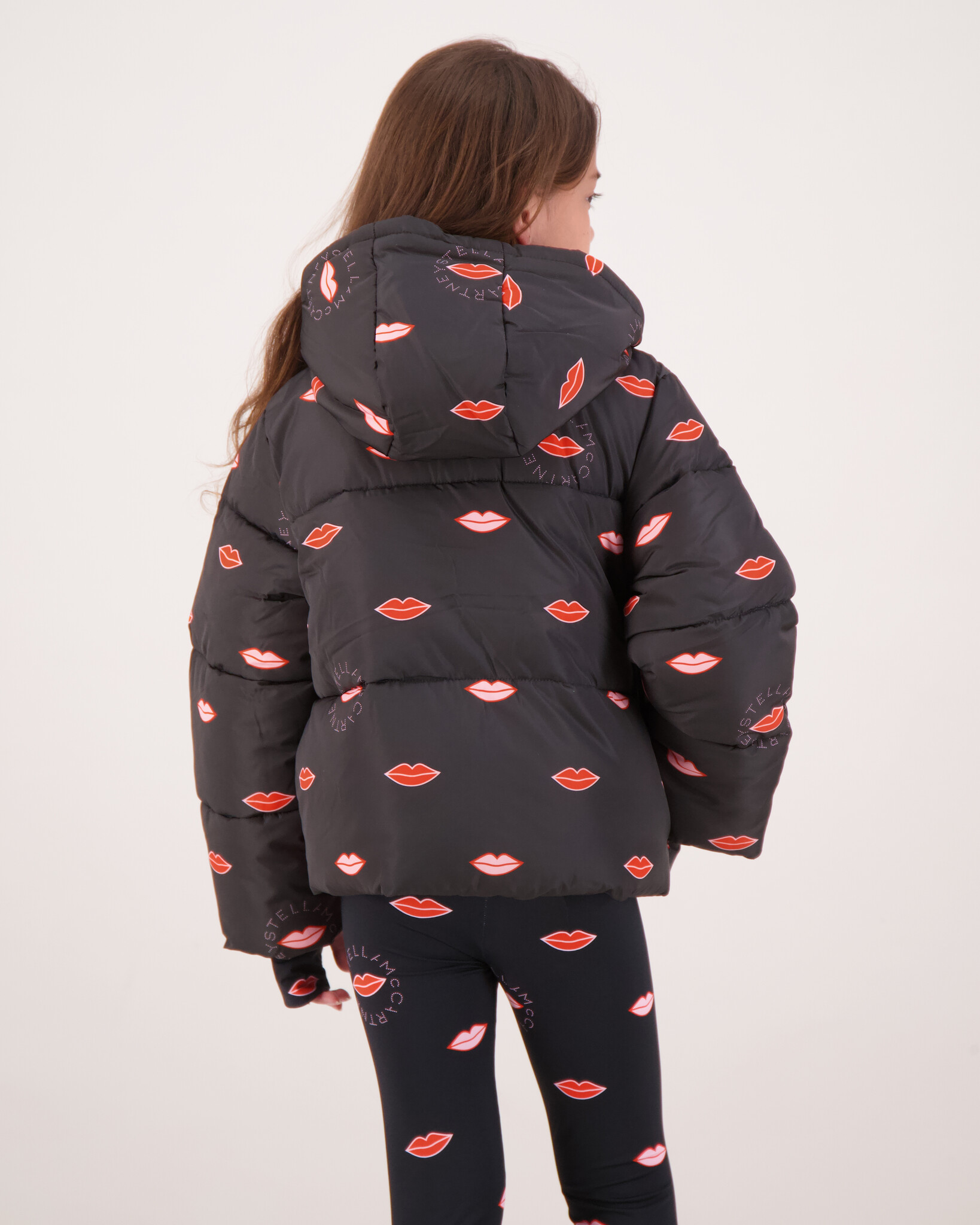 Deze trendy jas heeft een speelse uitstraling door het opvallende lippenpatroon in felrood op een zwarte achtergrond. De jas is gewatteerd voor extra warmte en comfort en heeft een handige capuchon die verstelbaar is met trekkoorden. De ritssluiting aan de voorkant biedt zowel functionaliteit als stijl, terwijl de brede, rechte snit een comfortabele pasvorm garandeert. Perfect voor een winterse look met een fashion-forward twist!