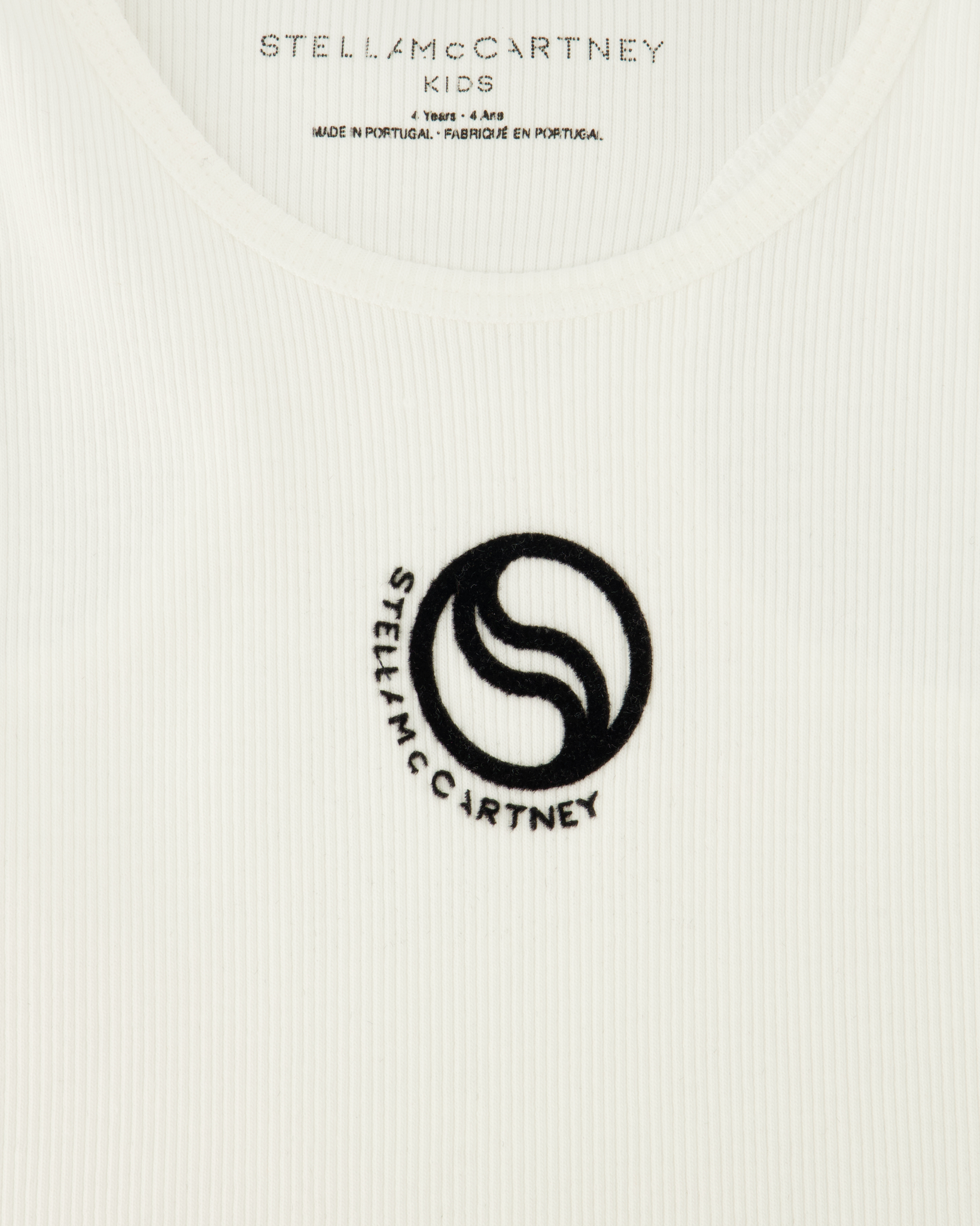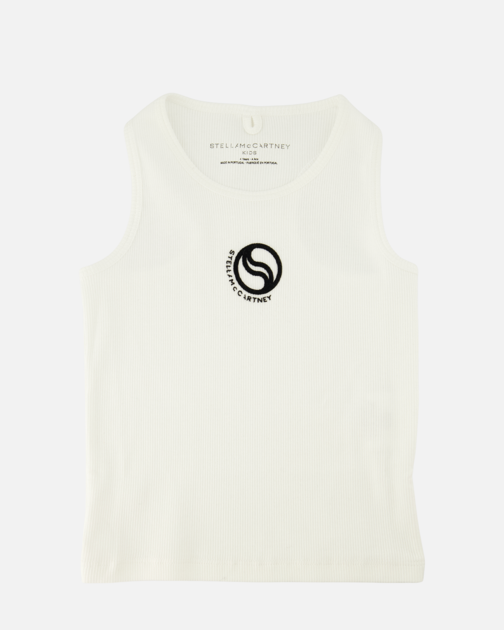 De Stella McCartney Kids rib tanktop met logo is een minimalistisch en stijlvol item dat perfect past binnen de kenmerkende look van het merk. Deze top is uitgevoerd in zacht ribkatoen voor een comfortabele en ademende feel, ideaal voor dagelijks gebruik. Het subtiele logodetail op de borst geeft een speels en herkenbaar accent. Door het tijdloze design is deze top makkelijk te combineren met shorts, jeans of rokken voor een casual maar modieuze outfit.
