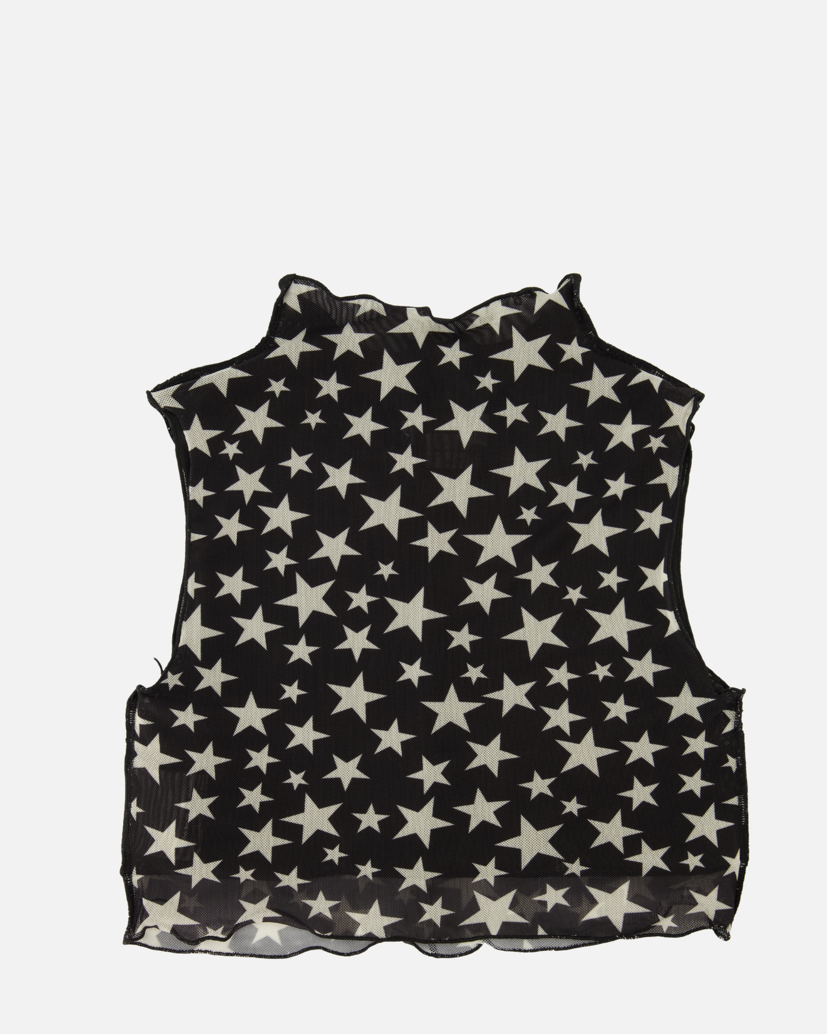 Zwarte mesh top voor kinderen met sterrenprint, ontworpen met een speelse en stoere uitstraling. De top is uitgevoerd in een lichte, transparante mesh stof en voorzien van een all-over sterrenpatroon in een contrasterende kleur. De golvende afwerking langs de randen en de mouwloze snit geven het item een eigenzinnig en modern karakter. Dankzij de zachte en rekbare stof zit de top comfortabel en is hij perfect om te dragen als laagje over een hemdje of T-shirt.