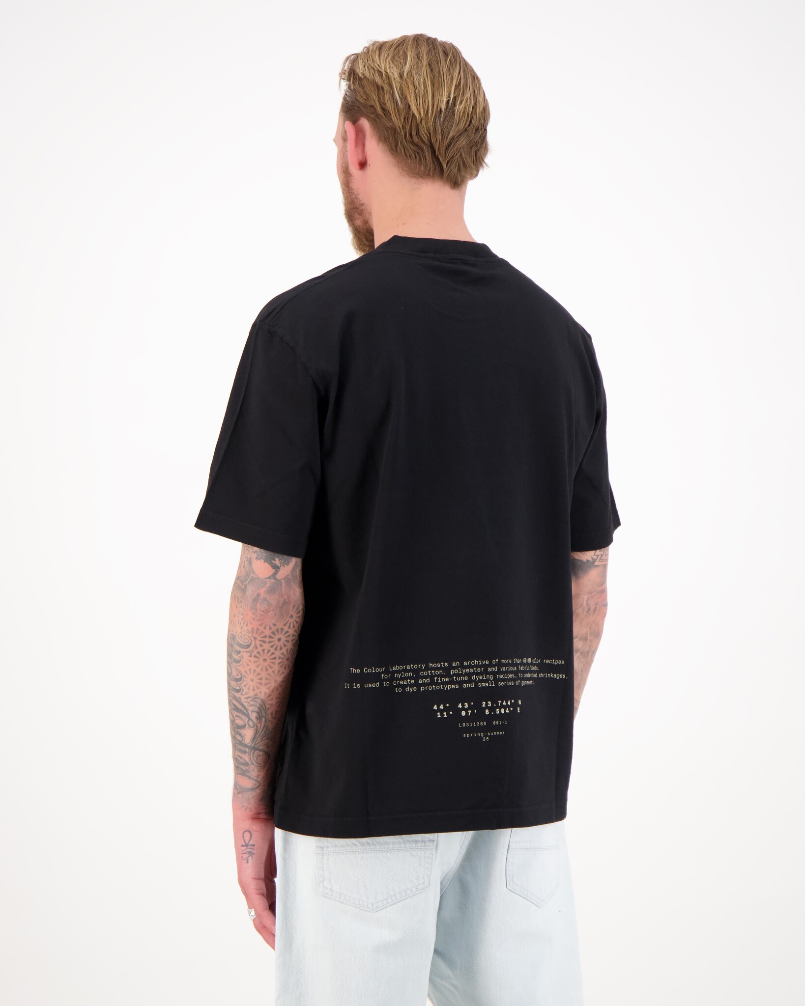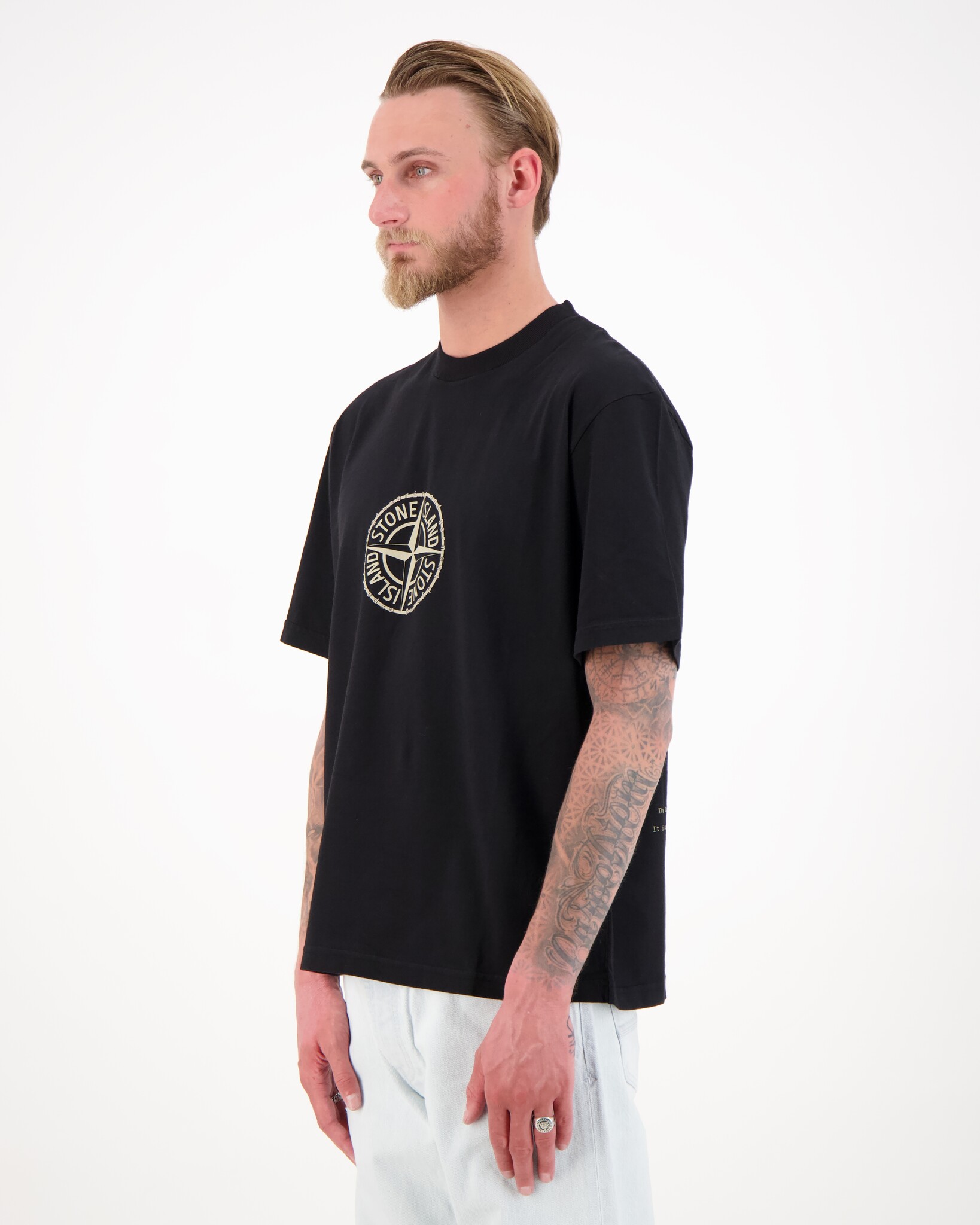 Zwarte 2100001 All Around Compass T-Shirt van het merk Stone Island. T-shirt met korte mouwen van katoen, voorzien van een Compass-logo op de borst en een opvallende tekst op de rug die verwijst naar het Stone Island Colour Laboratory. In de massa geverfd voor een diepe, rijke kleur en een unieke uitstraling.
