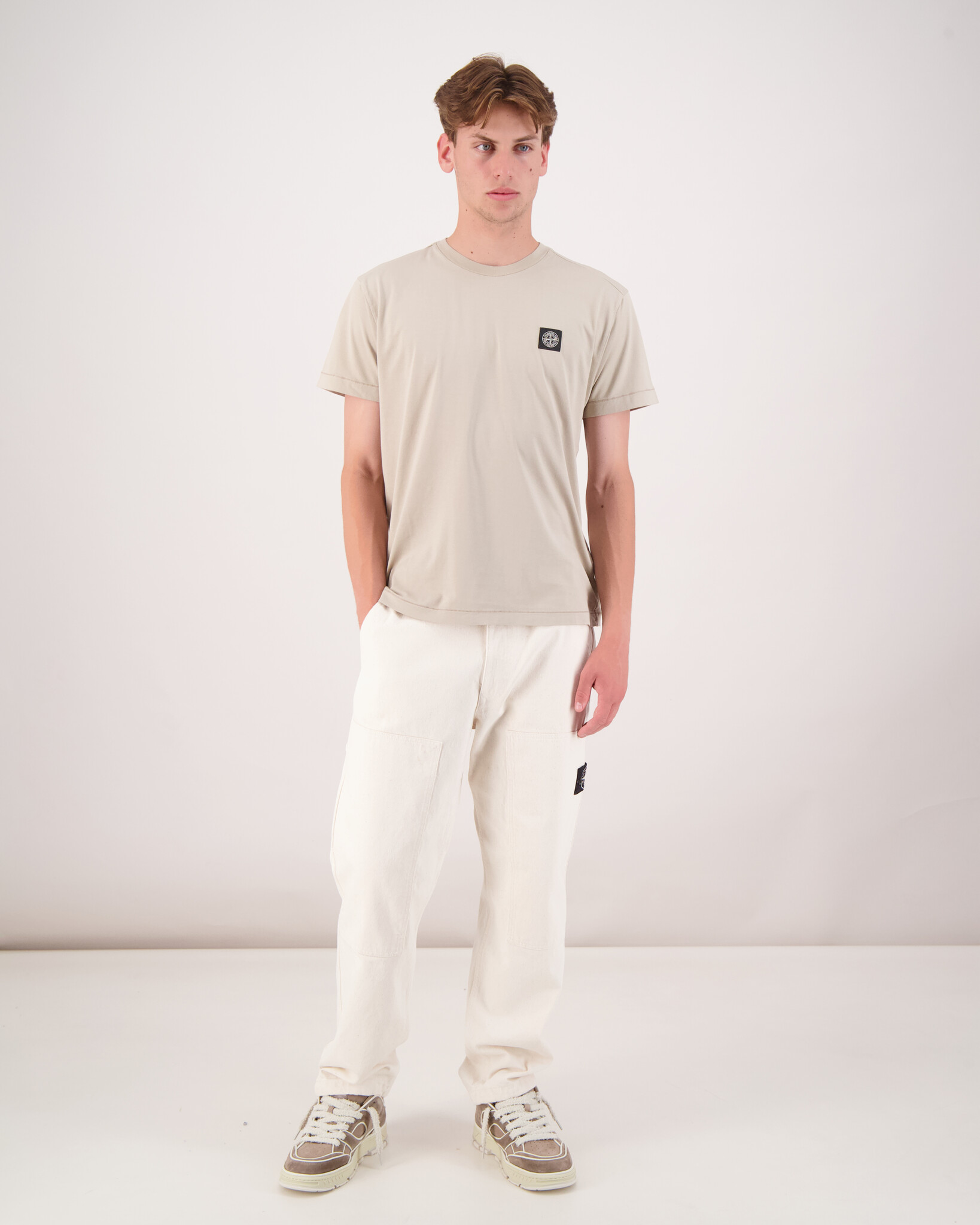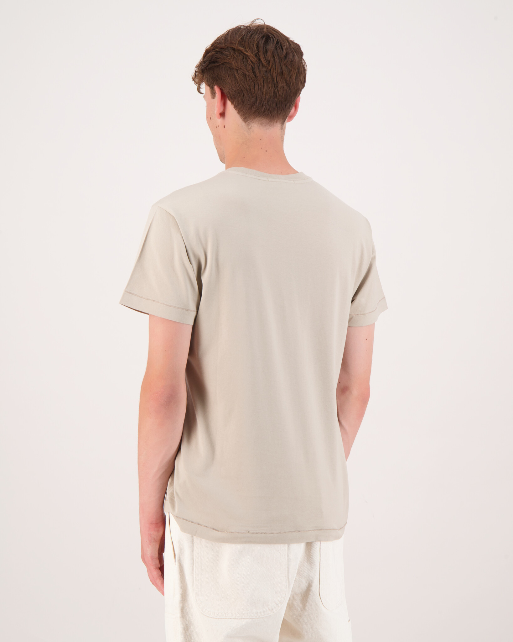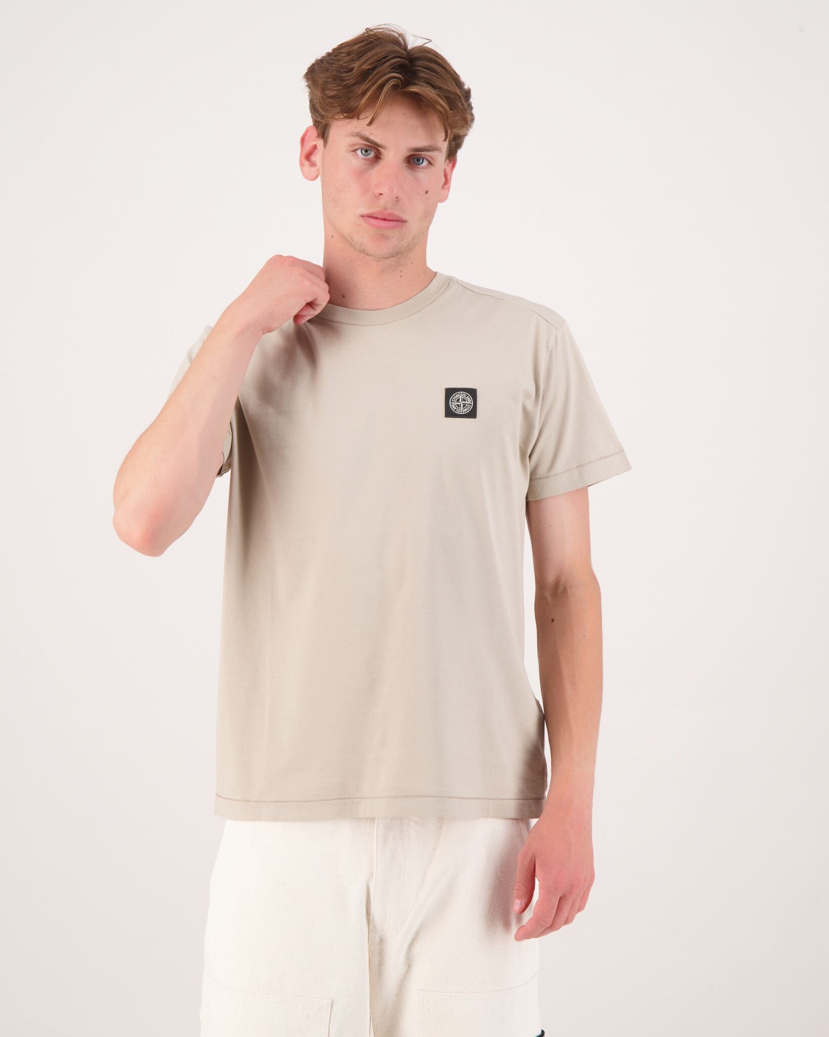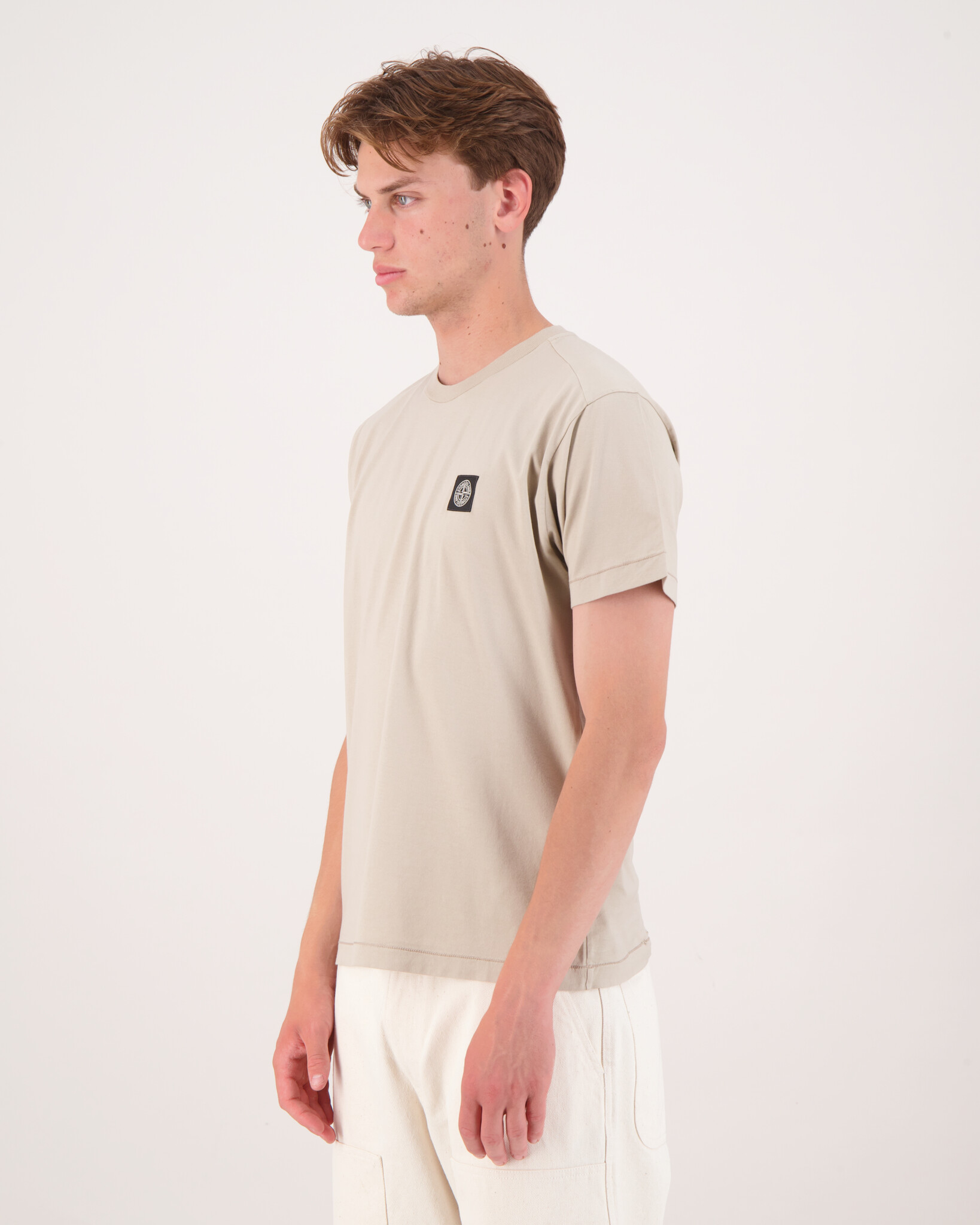 Sand "2100027 60/2 Cotton Jersey T-Shirt" van het merk Stone Island. T-shirt met korte mouwen van katoenen jersey, met een Compass-logopatch op de borst en verhoogde stiksels bij de zoom. Geverfd in kledingstuk.