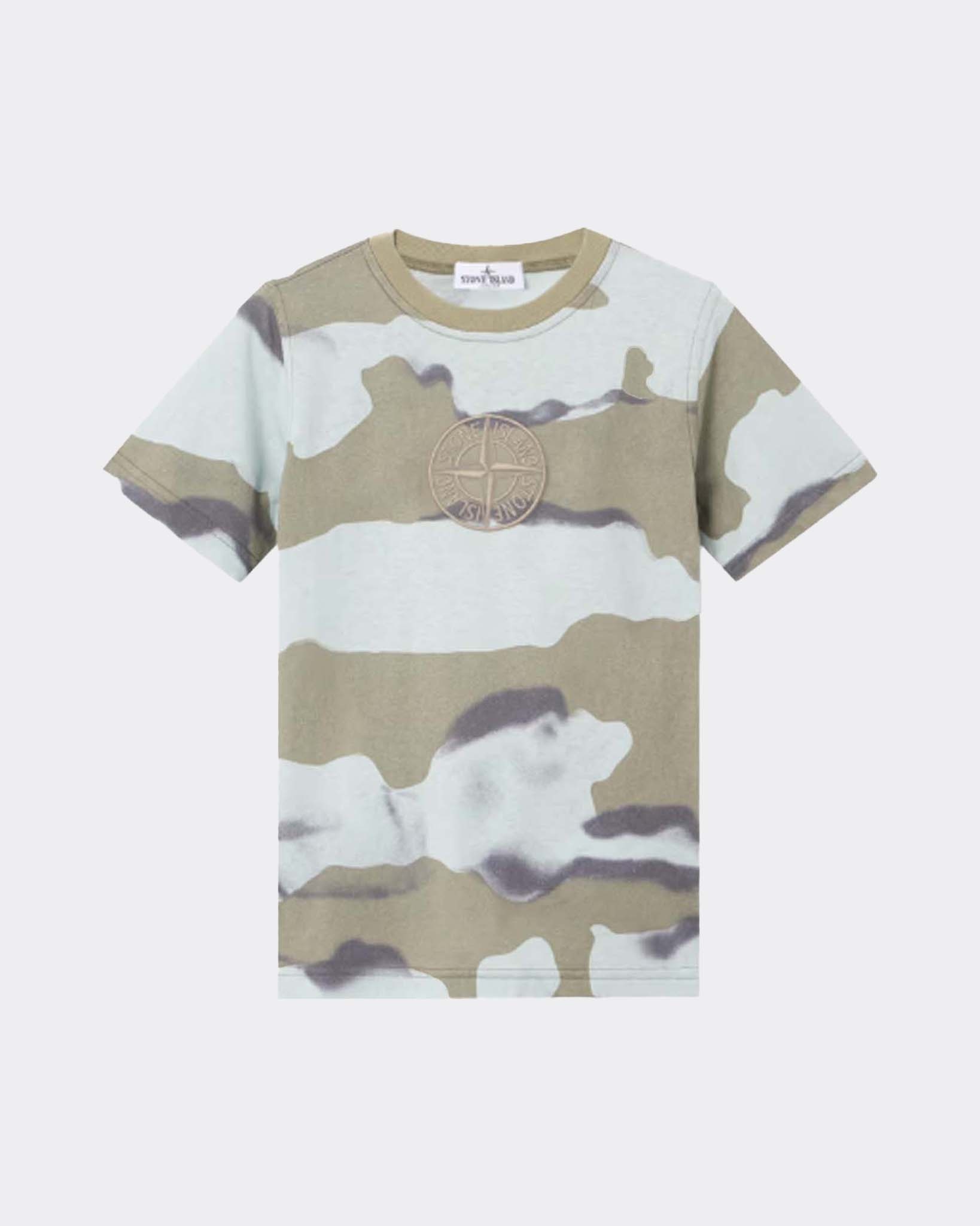 SS T-Shirt van het merk Stone Island Junior. Het T-Shirt heeft korte mouwen en een ronde hals. Het T-Shirt heeft een camouflage achtige print met het Stone Island logo op de borst.