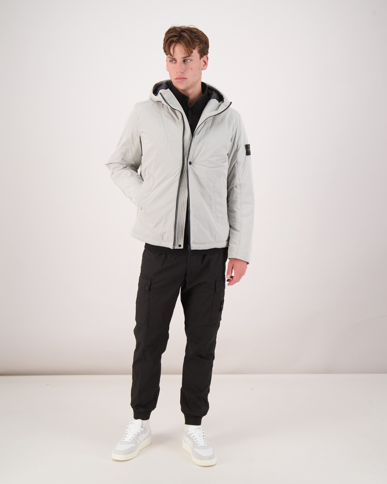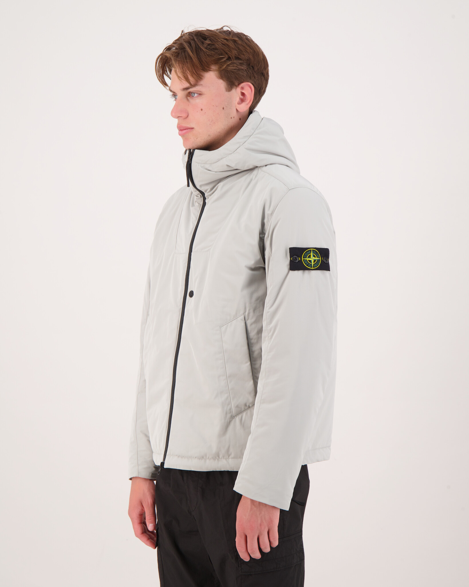 Grijze 4100047 Micro Twill Jacket van het merk Stone Island. Gewatteerd jack met capuchon van polyester micro twill met een veerachtige, spiraalvormige moleculaire structuur. Deze vezel geeft de stof een zachte en comfortabele textuur met diepe en rijke kleuren. Het kledingstuk is gevoerd met een binnenlaag van PrimaLoft® Gold P.U.R.E™, een exclusieve 100% gerecyclede mix van vezels met een ultrakleine diameter die superieure thermische prestaties levert. Het levert de hoogste warmte-gewichtsverhouding van alle synthetische isolaties. Het kledingstuk is behandeld met een antidruppelmiddel.