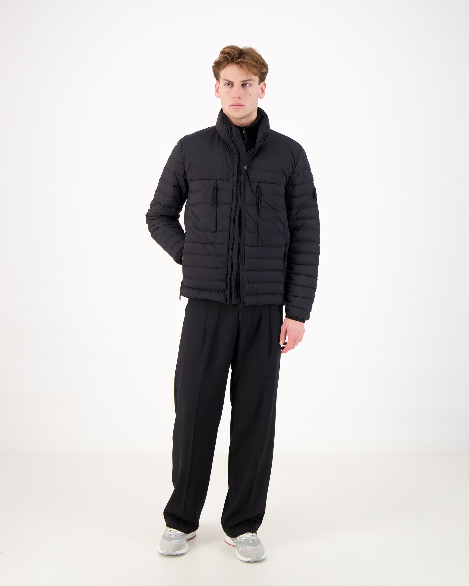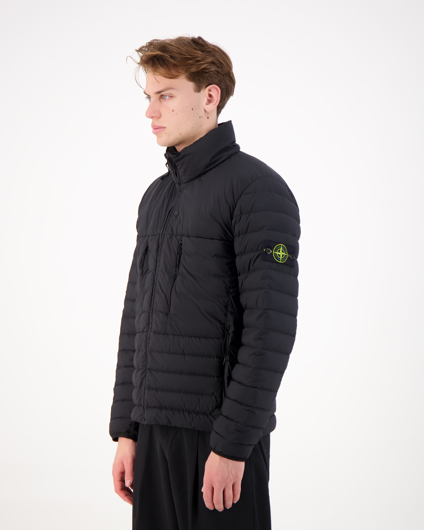 Zwarte '4100106 Seamless Tunnel Nylon Down Jacket' van het merk Stone Island. Donsjack met opstaande kraag, gemaakt van een lichte, enkellaagse stretchstof van 86% gerecycled nylon, dat met een speciale weeftechniek wordt vervaardigd, waardoor de donsvakjes automatisch direct vanaf het weefgetouw worden gecreëerd. De naadloze donskanalen zorgen ervoor dat het dons aanzienlijk beter op zijn plaats blijft. Het afgewerkte kledingstuk is gewatteerd met de fijnste donsveren, die speciaal zijn behandeld om bestand te zijn tegen het verven van kledingstukken. Kledingstuk geverfd met toevoeging van een speciaal antivalmiddel. RDS - Responsible Down Standard gecertificeerd.