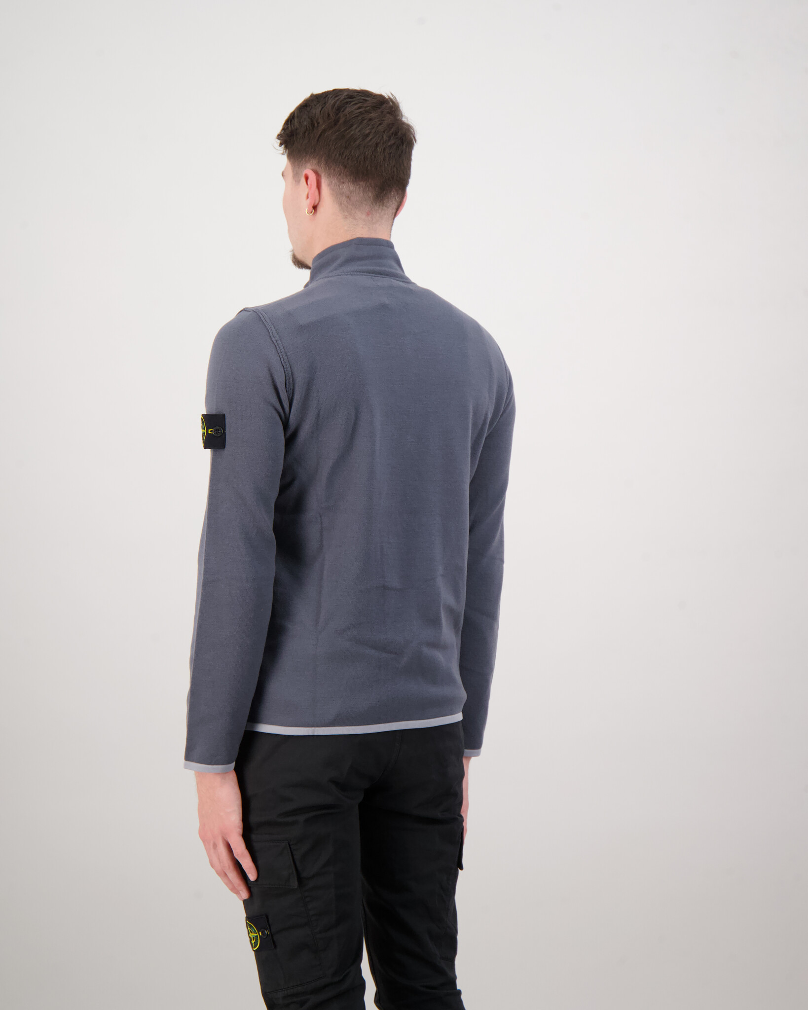 Antraciete '503A1 Knitwear No Cap Vest' van het merk Stone Island. Het gebreide vest heeft een hoge kraag en een rits in het midden. Het beroemde Stone Island-logo als patch op de arm.