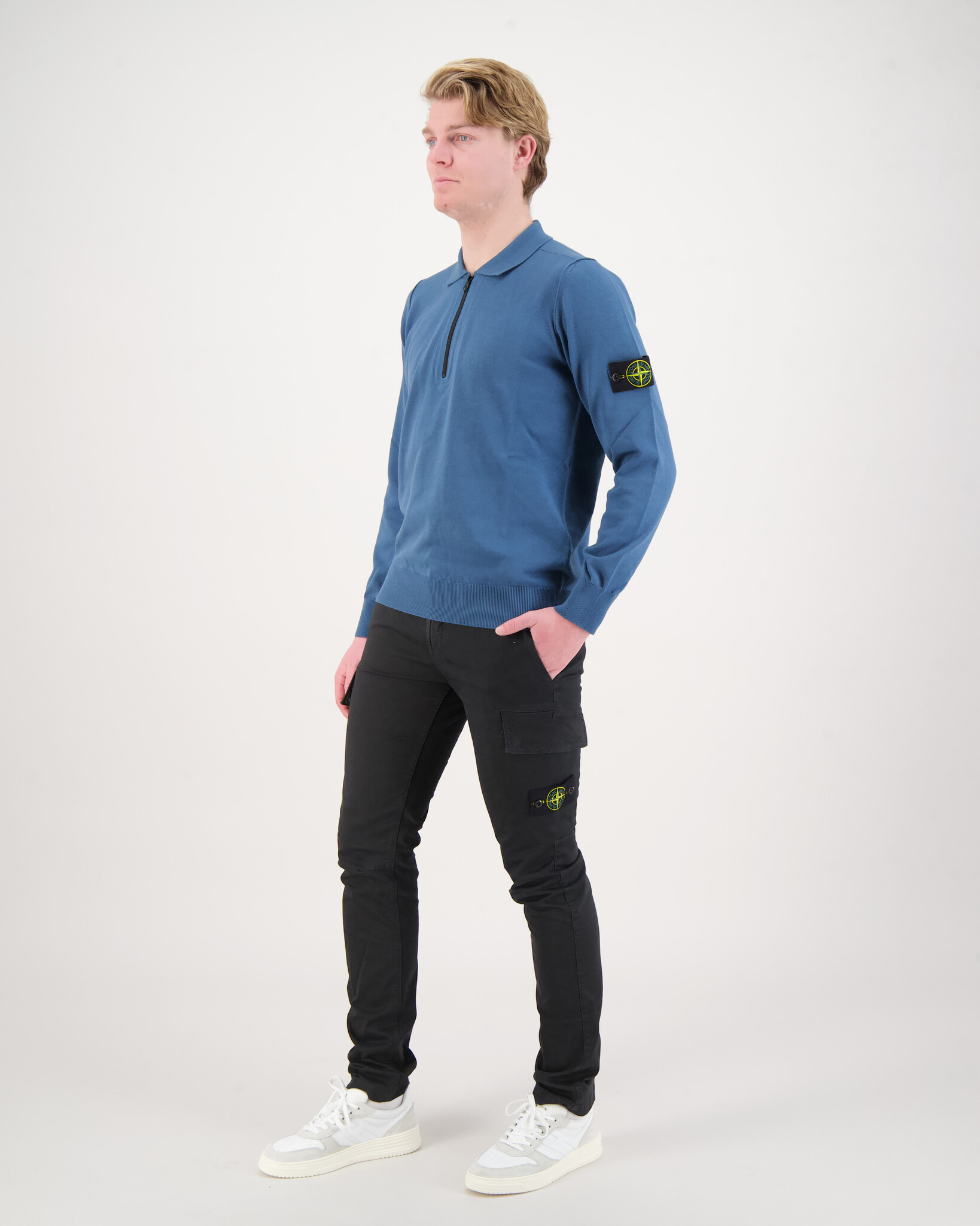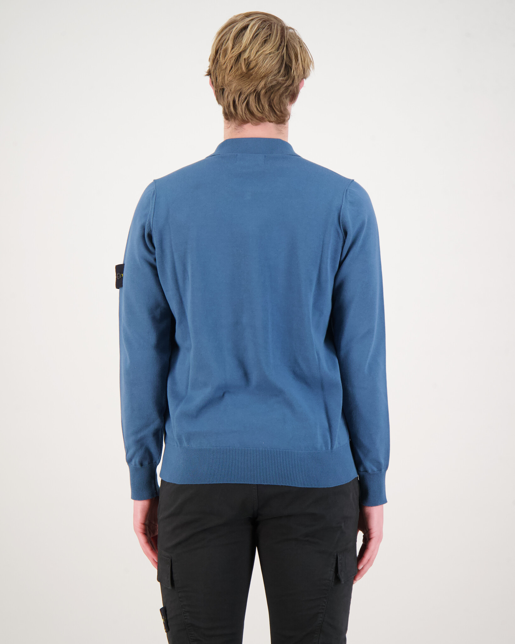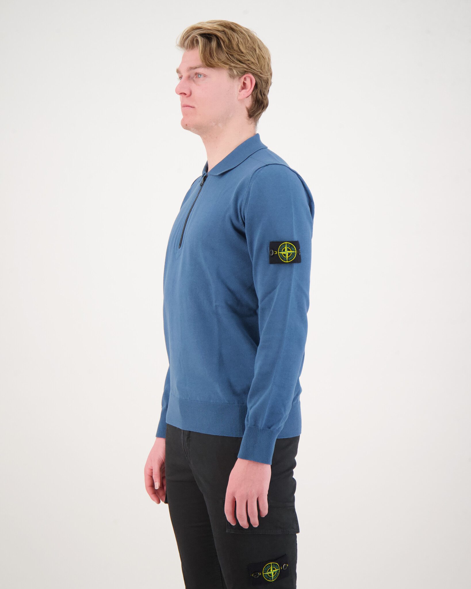 Maglia Half Zip Sweater van het merk Stone Island. De trui heeft een klassieke kraag en een zwart kleurige rits. Het welbekende Stond Island-logo staat weergeven op de linkerarm.